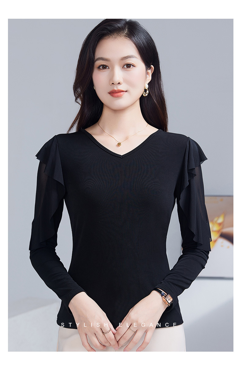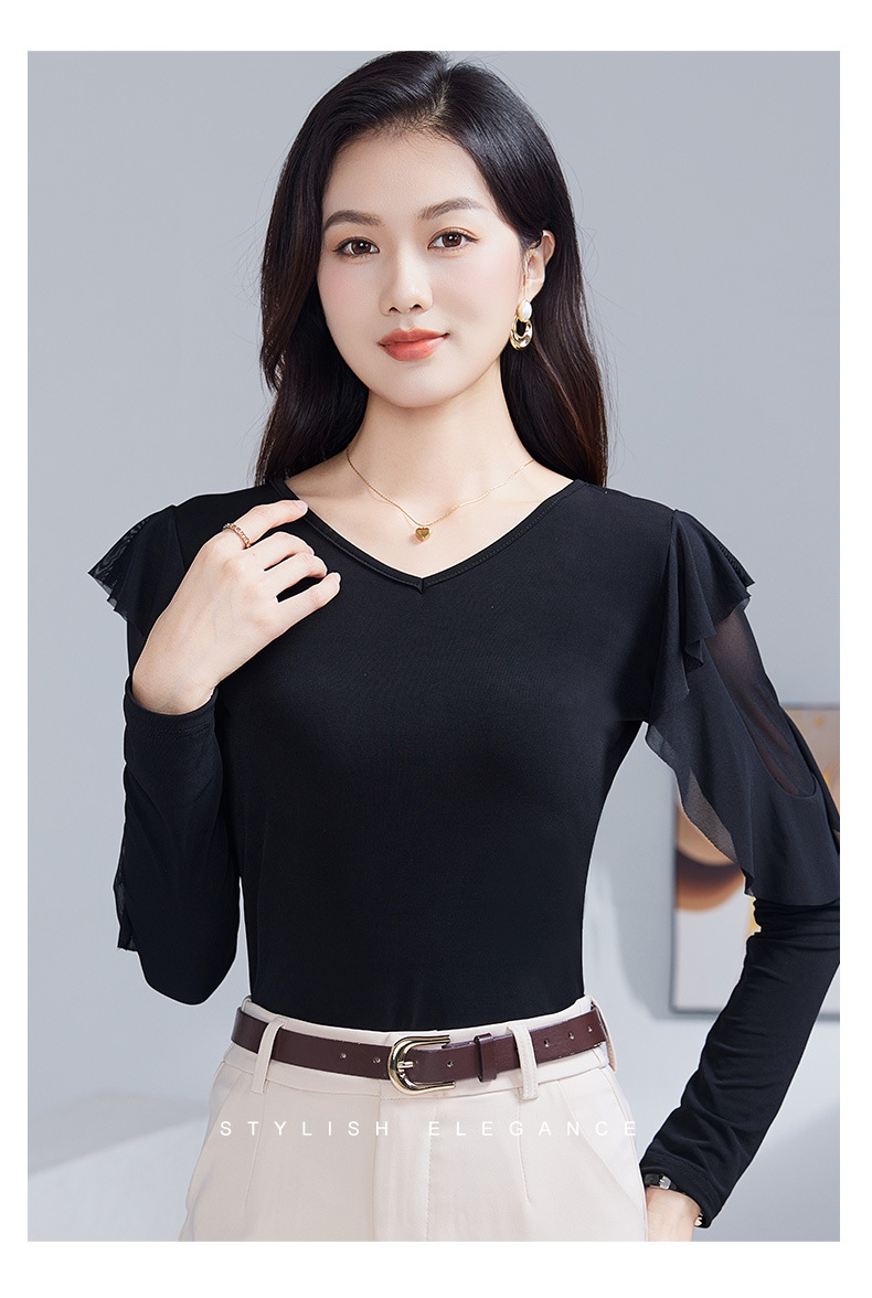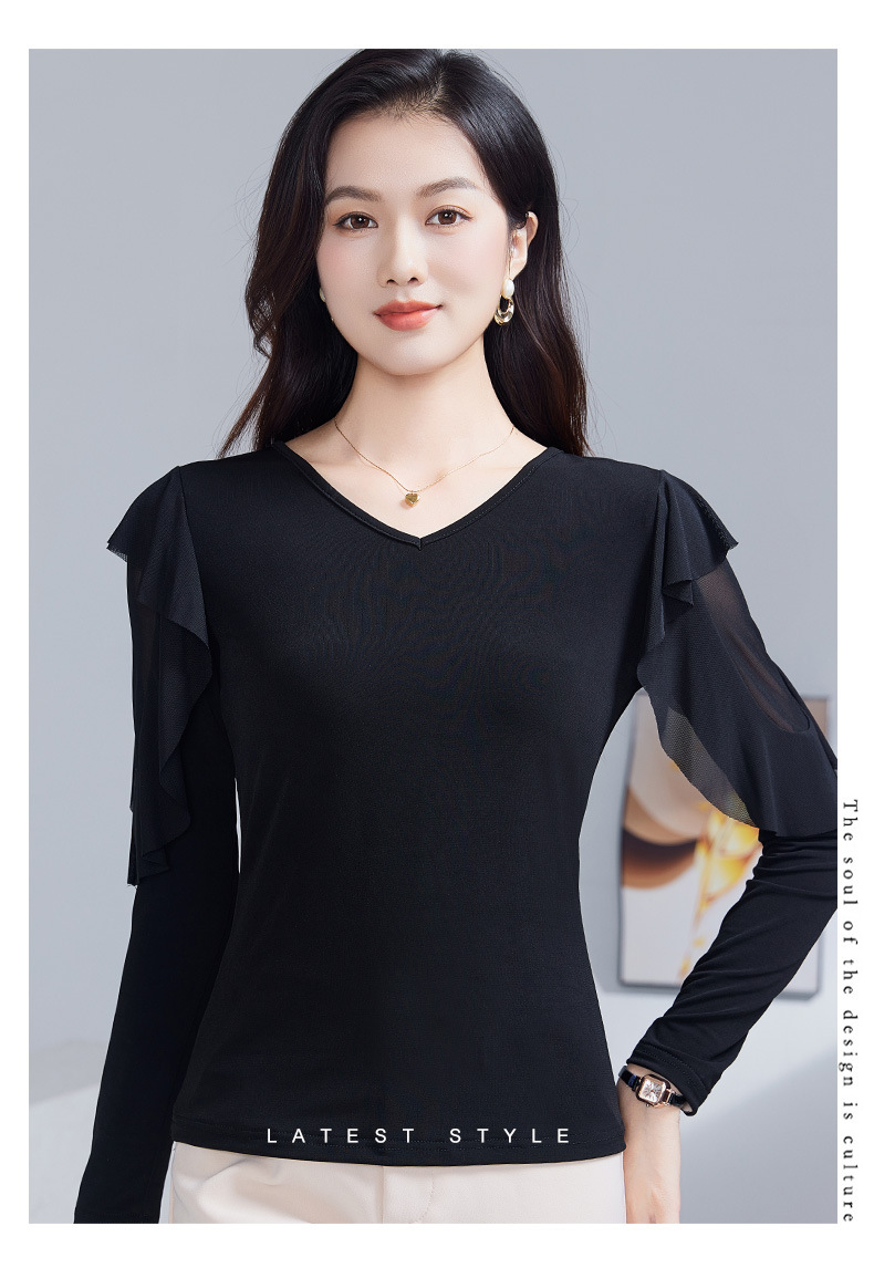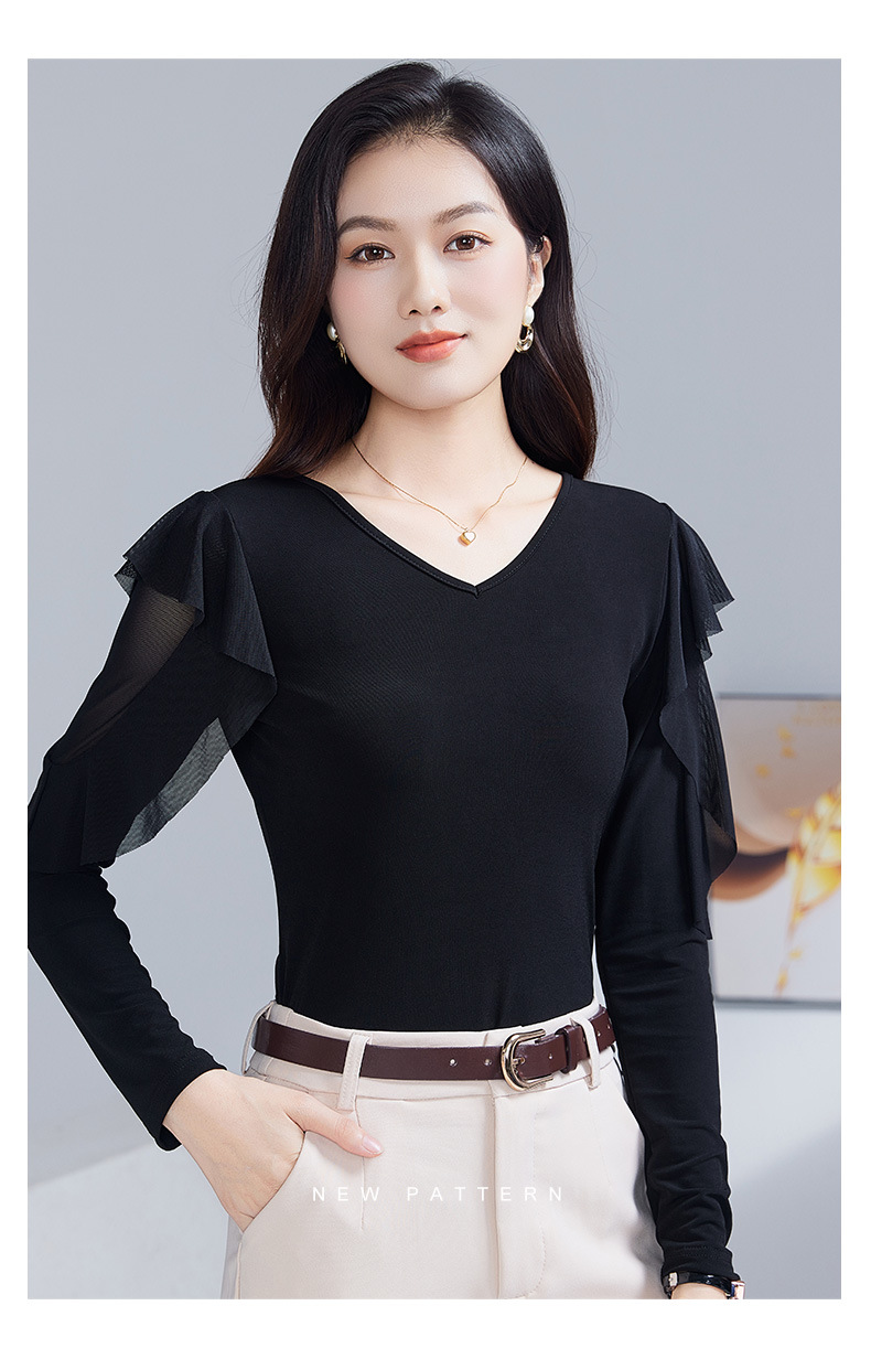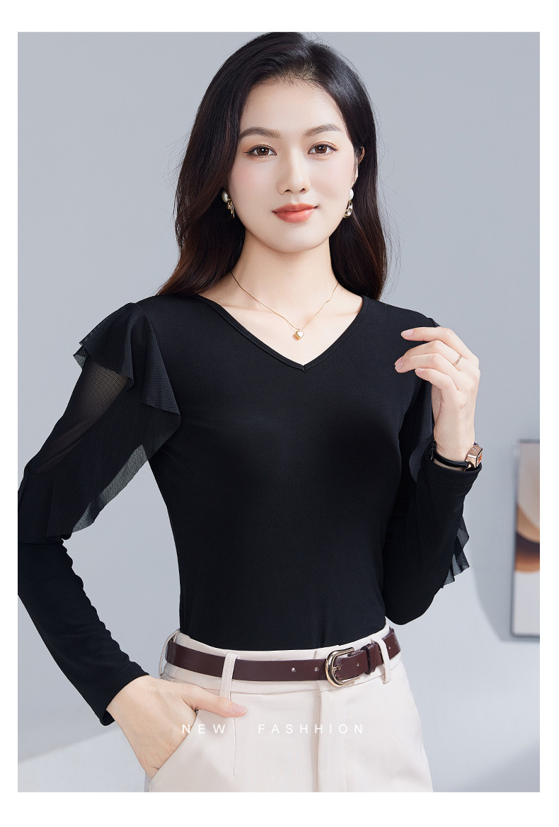 雀说秋季新款V领长袖荷叶边弹力小衫百搭气质打底衫上衣AL53109