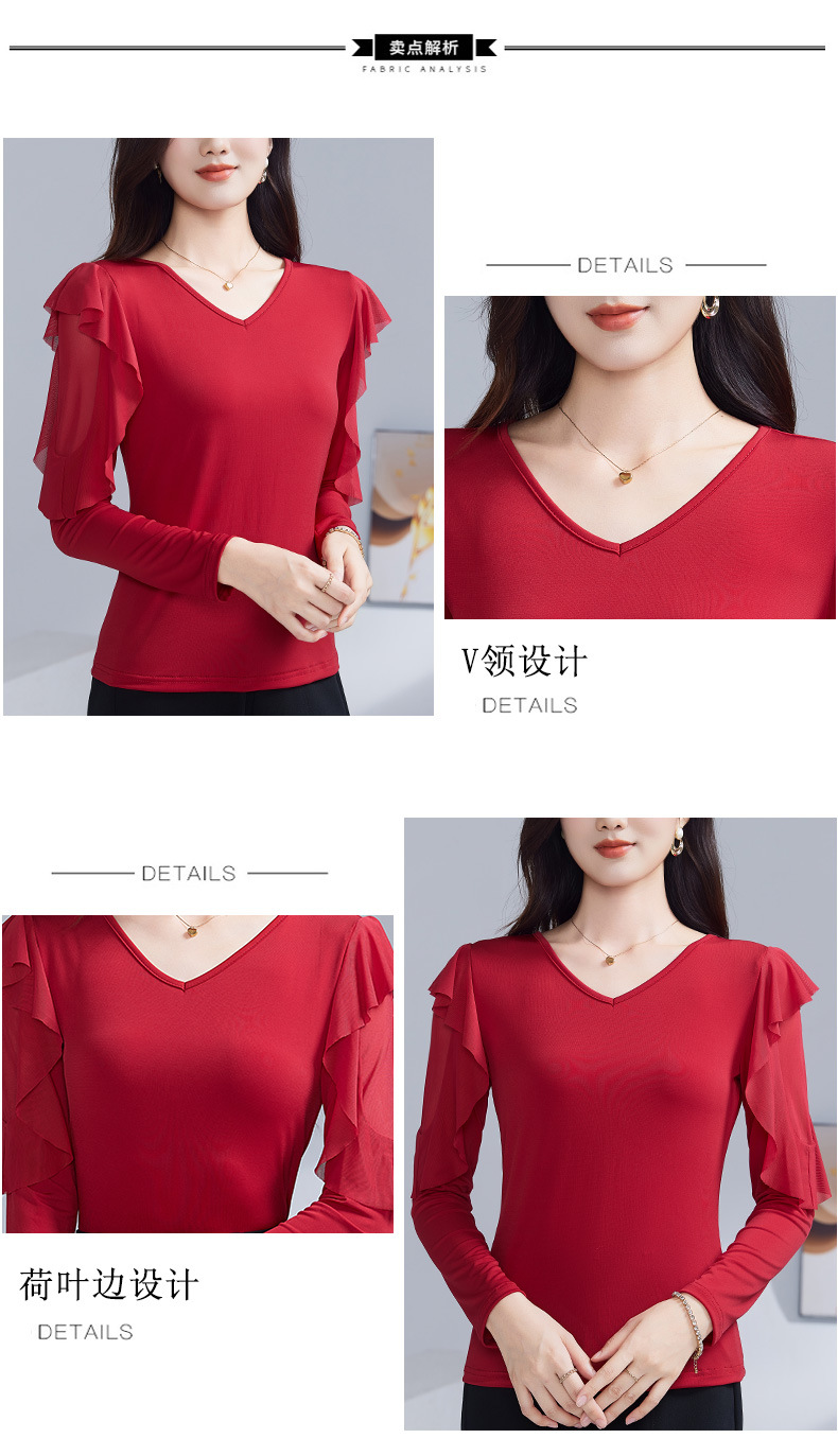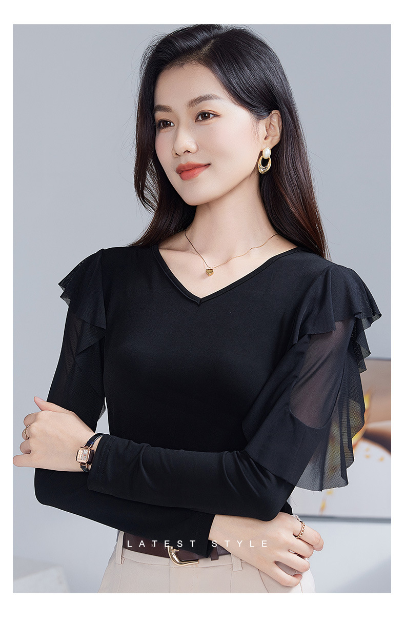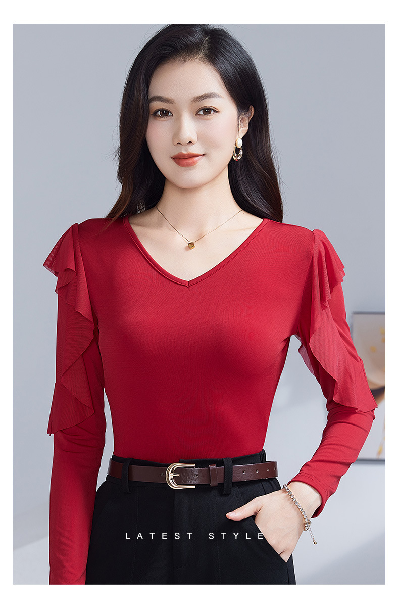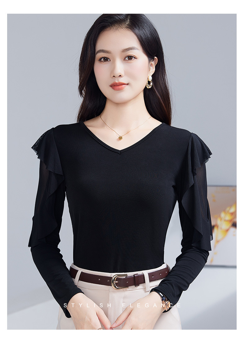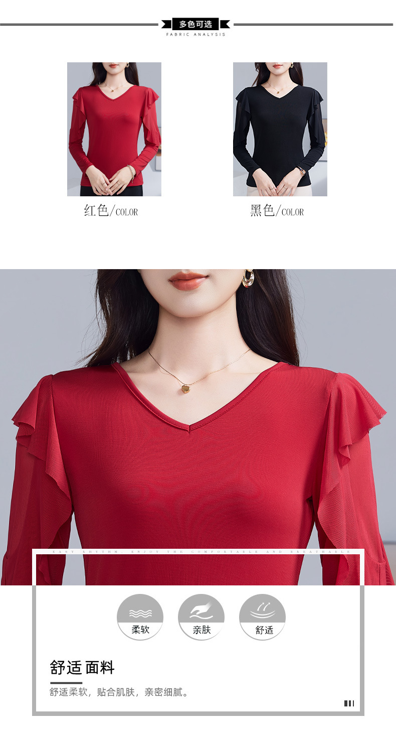 雀说秋季新款V领长袖荷叶边弹力小衫百搭气质打底衫上衣AL53109