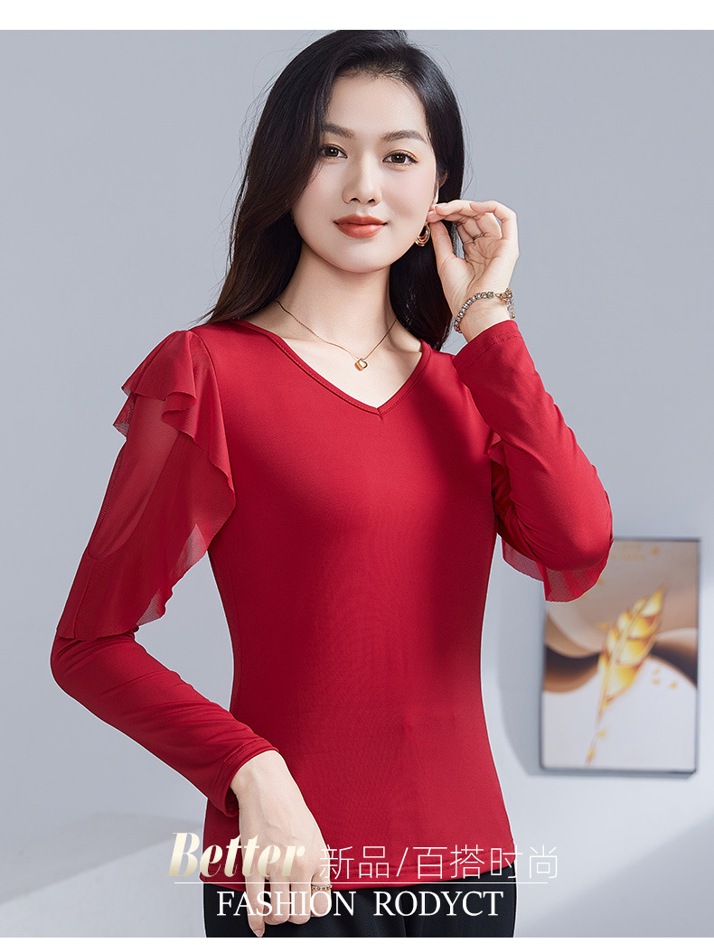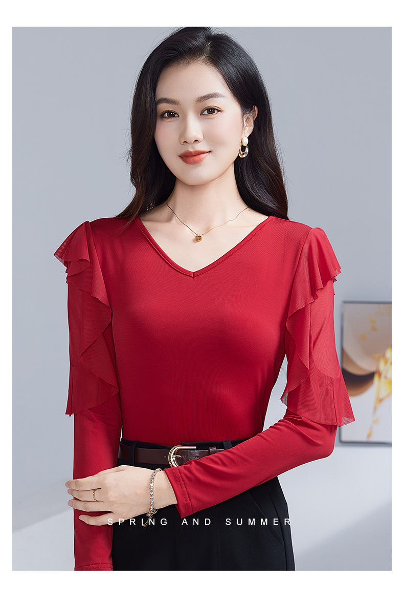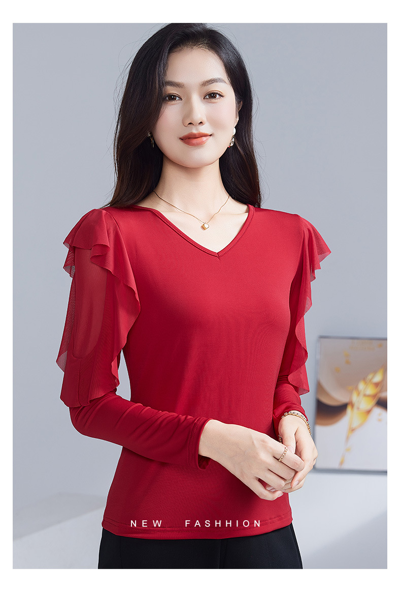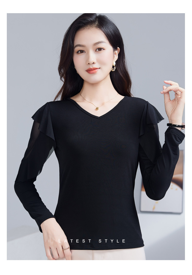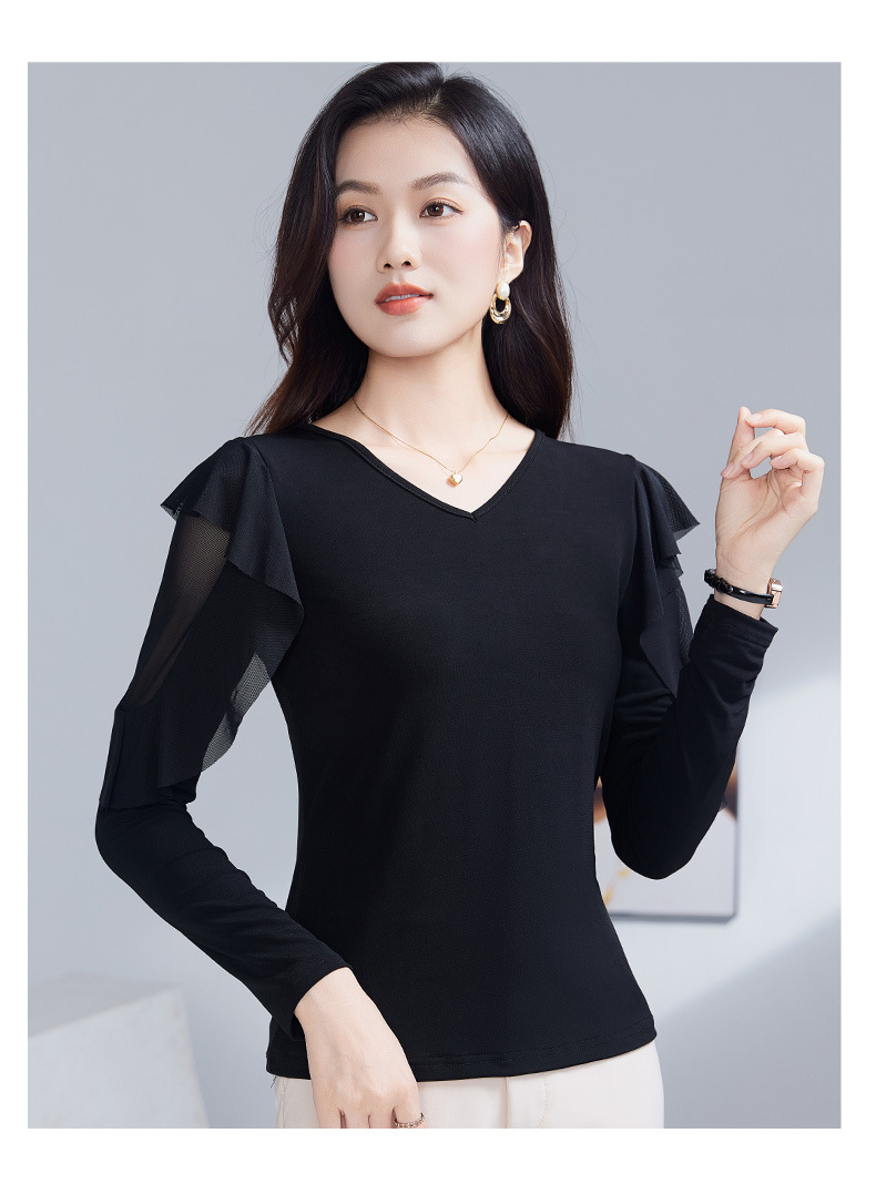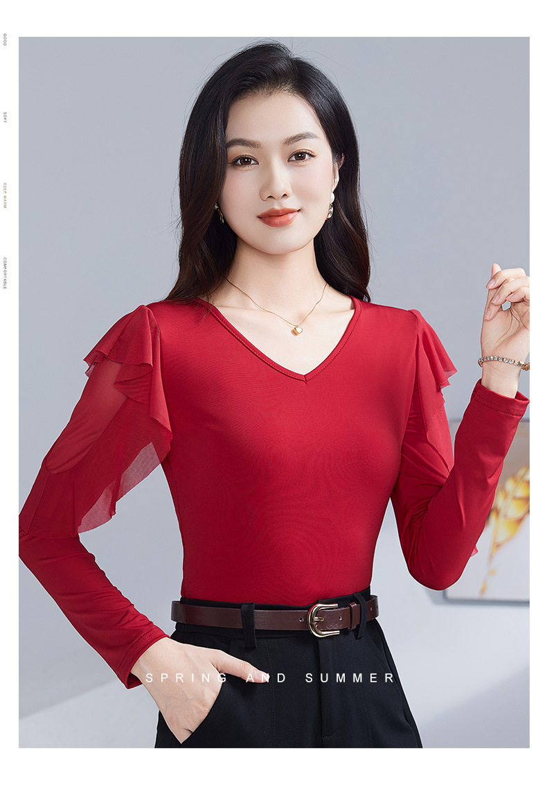 雀说秋季新款V领长袖荷叶边弹力小衫百搭气质打底衫上衣AL53109