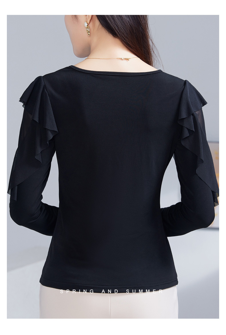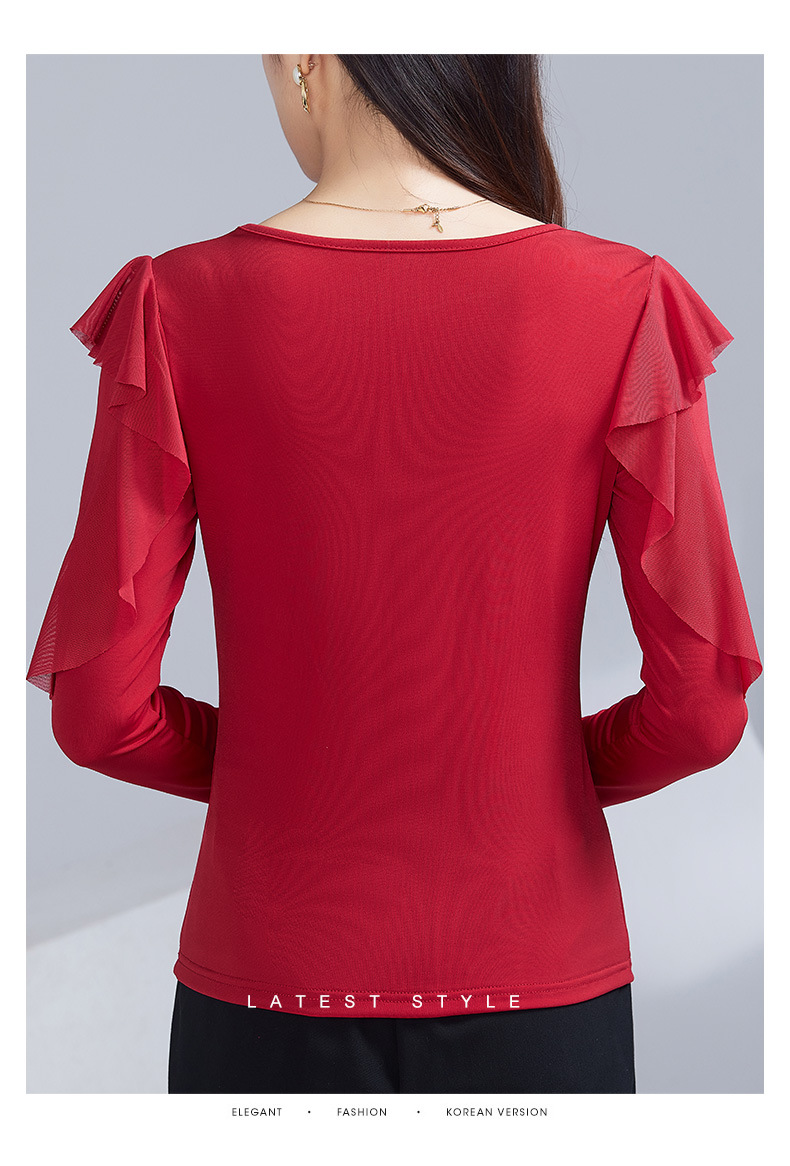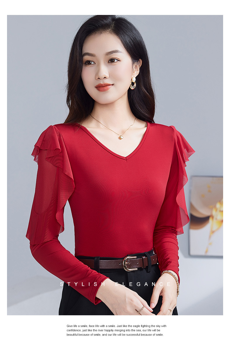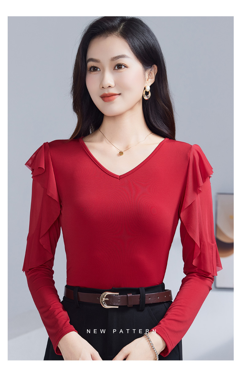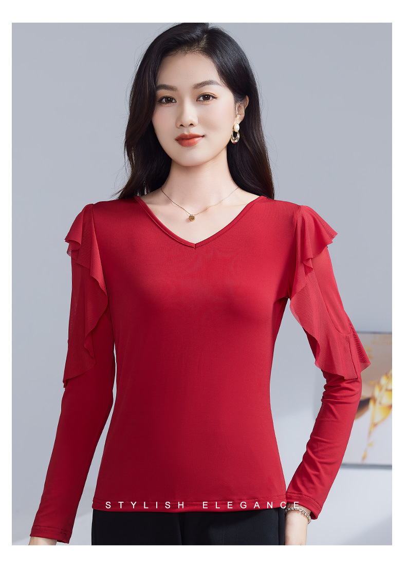 雀说秋季新款V领长袖荷叶边弹力小衫百搭气质打底衫上衣AL53109
