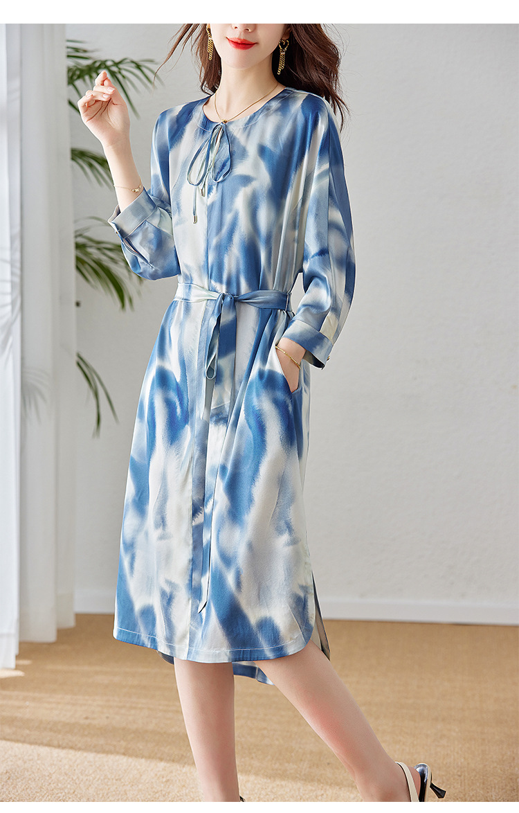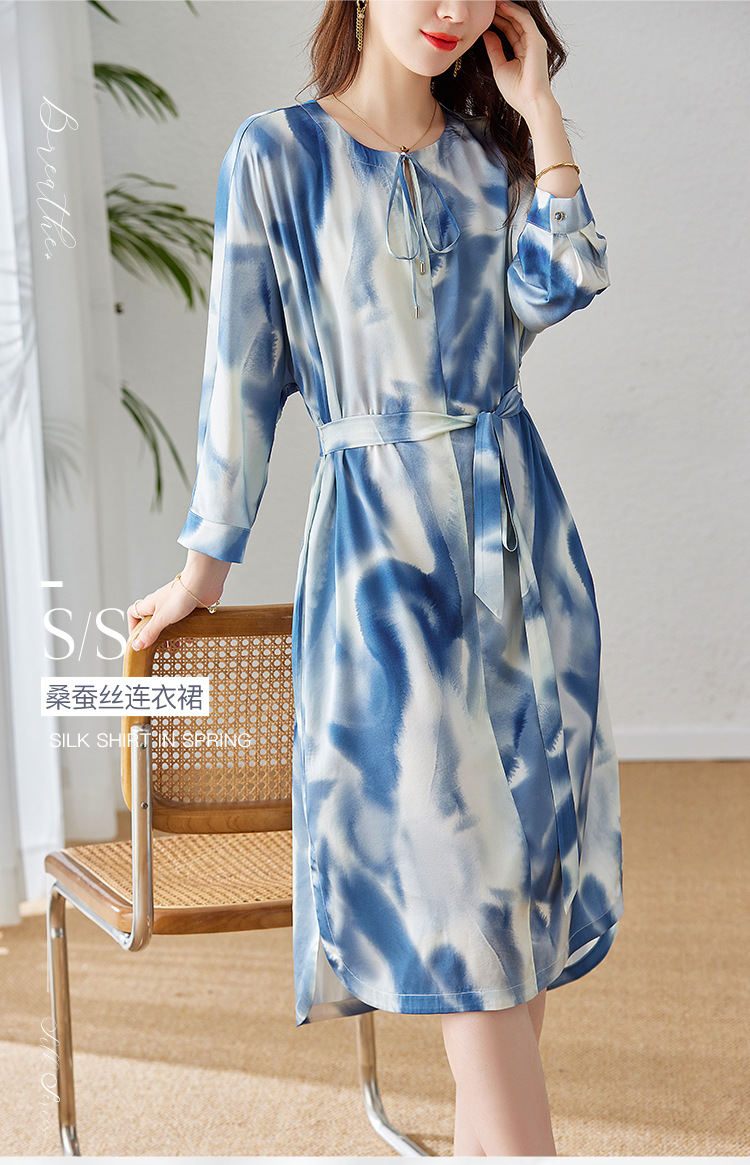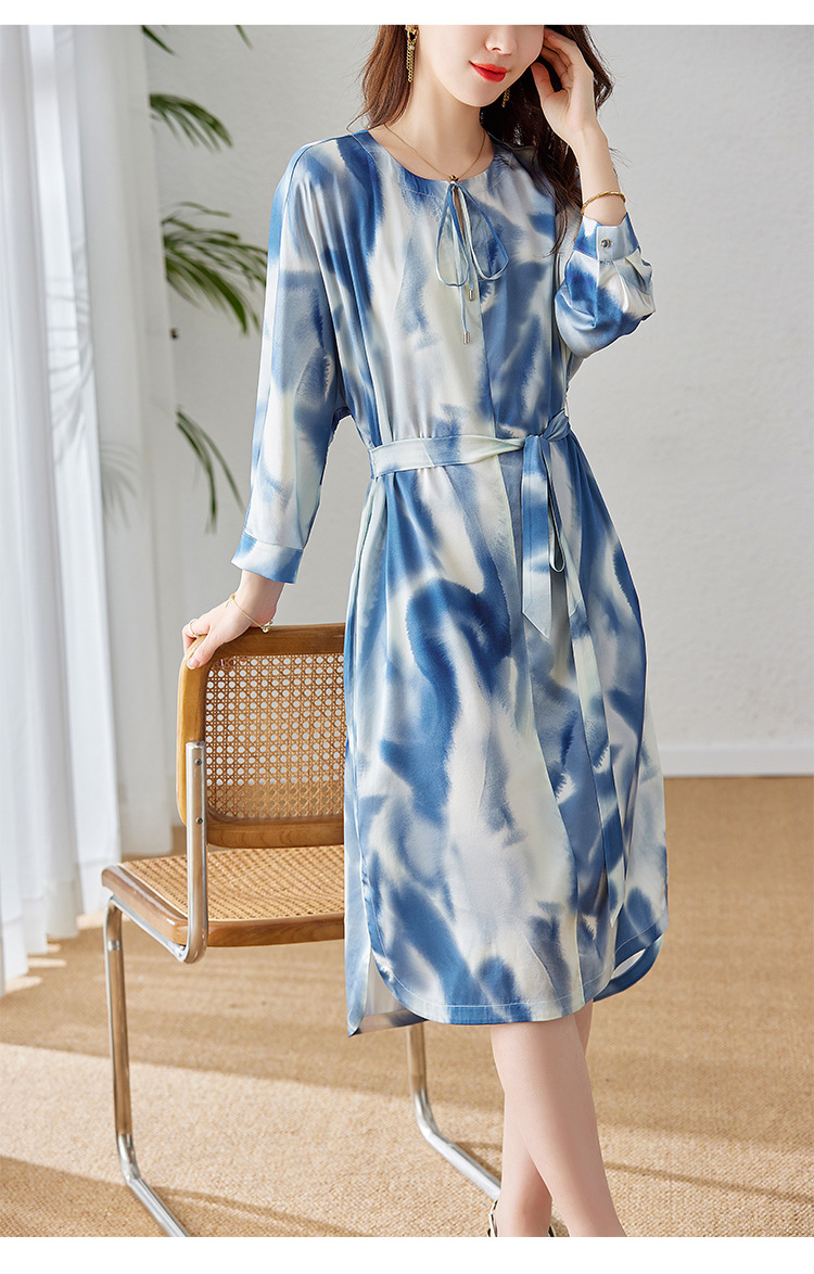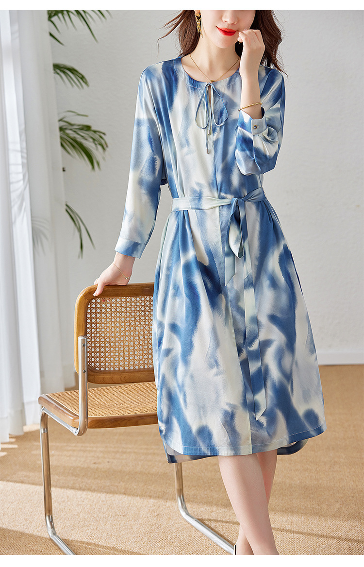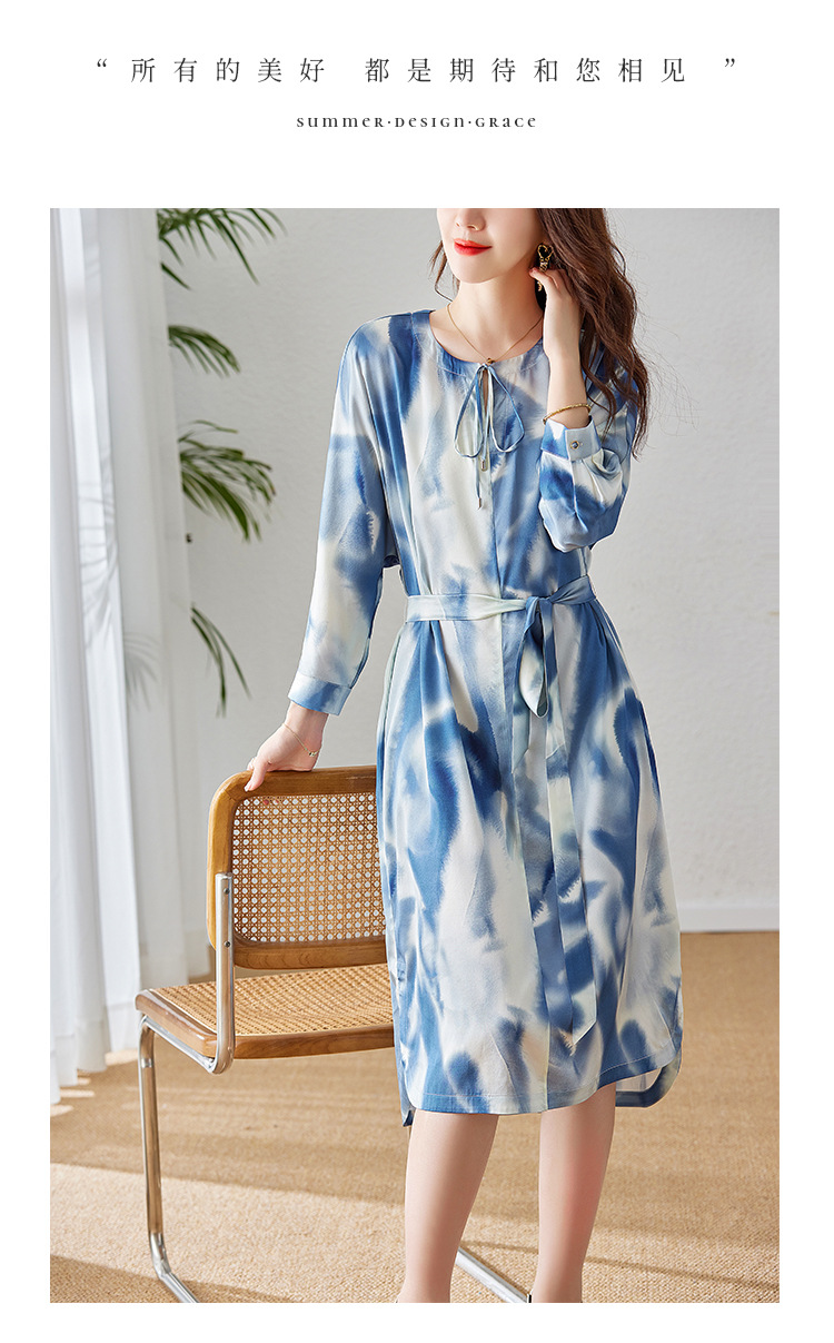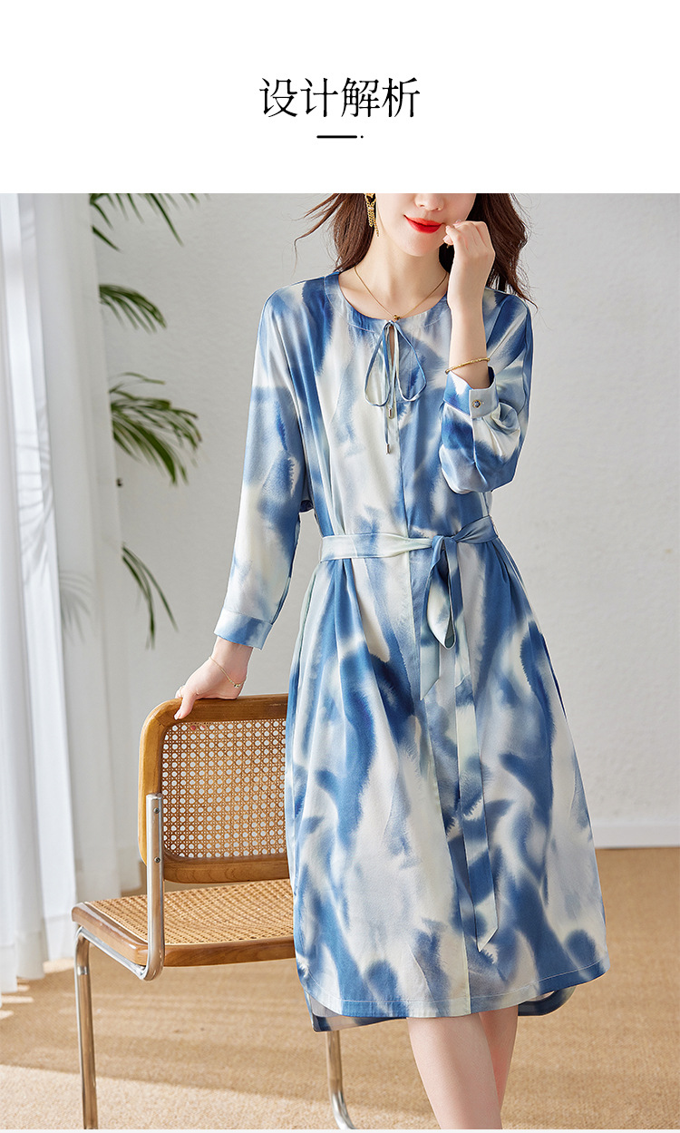 丁摩新款桑蚕丝连衣裙显瘦中年长袖高贵气质真丝印花裙AL3758
