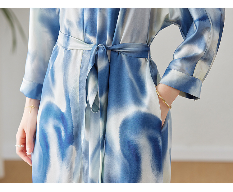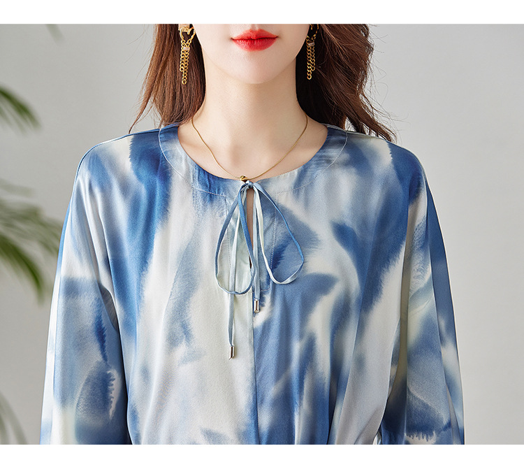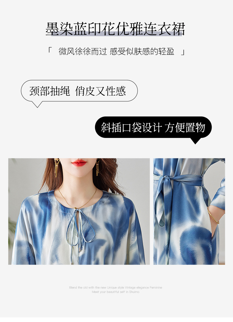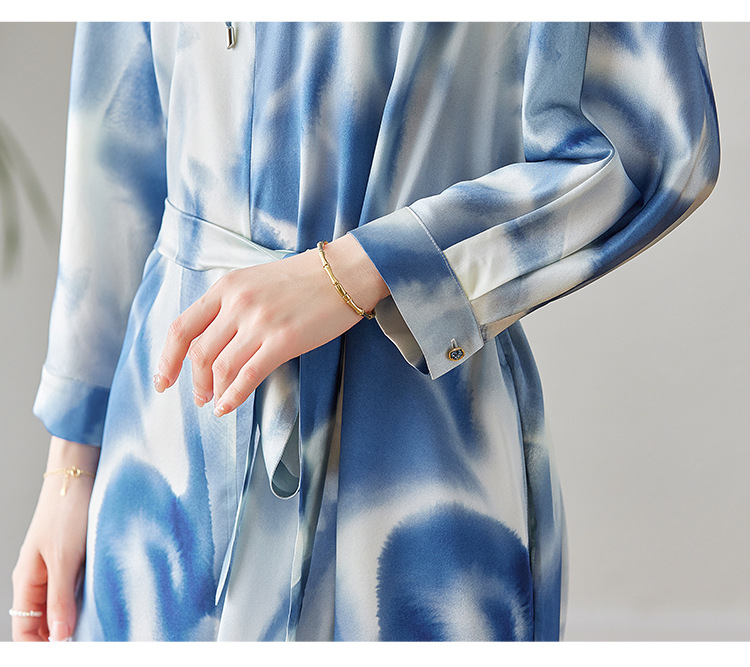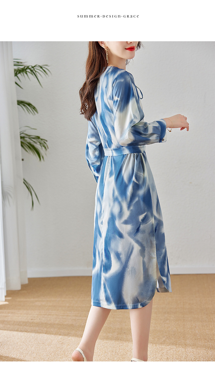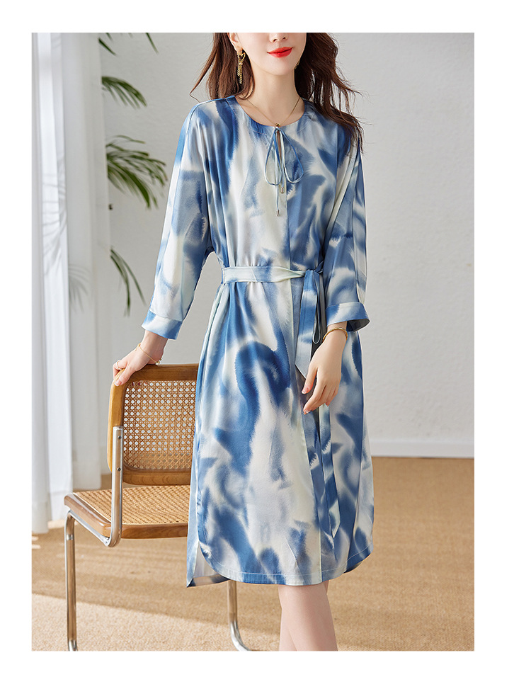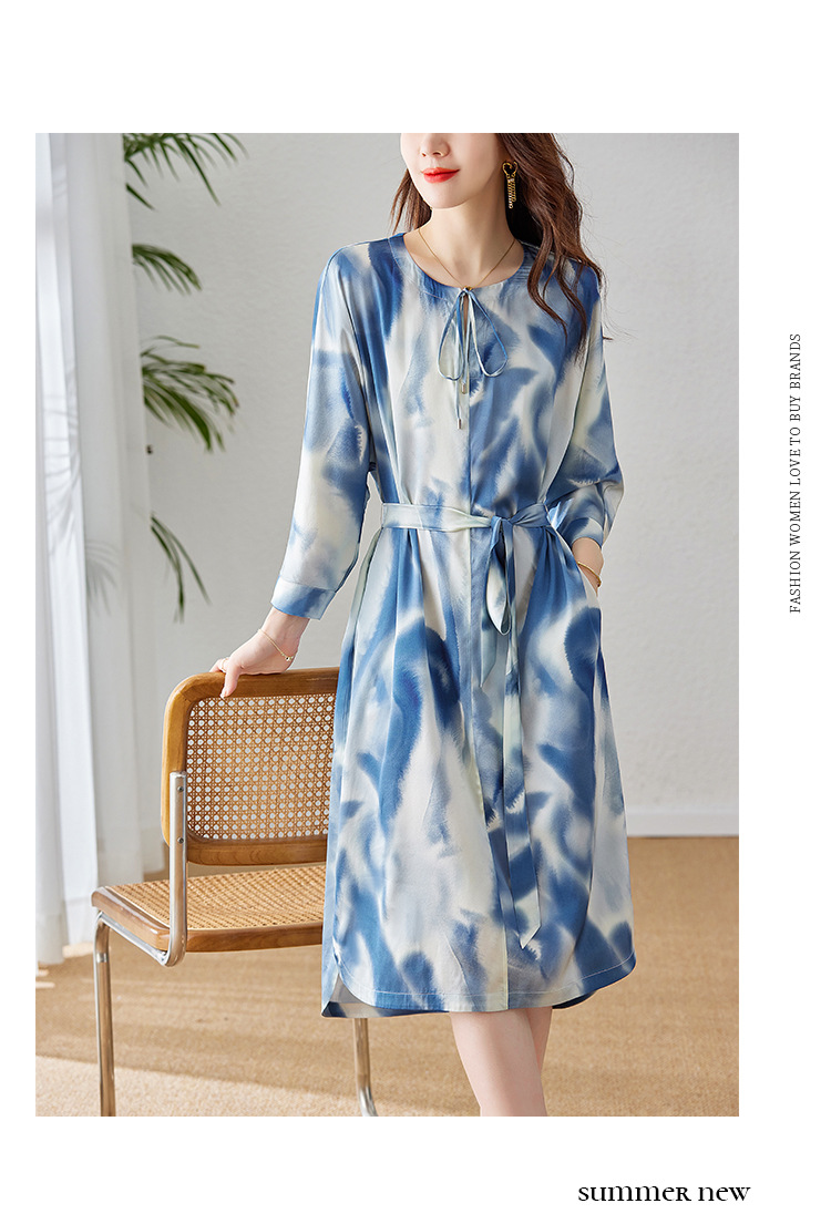 丁摩新款桑蚕丝连衣裙显瘦中年长袖高贵气质真丝印花裙AL3758