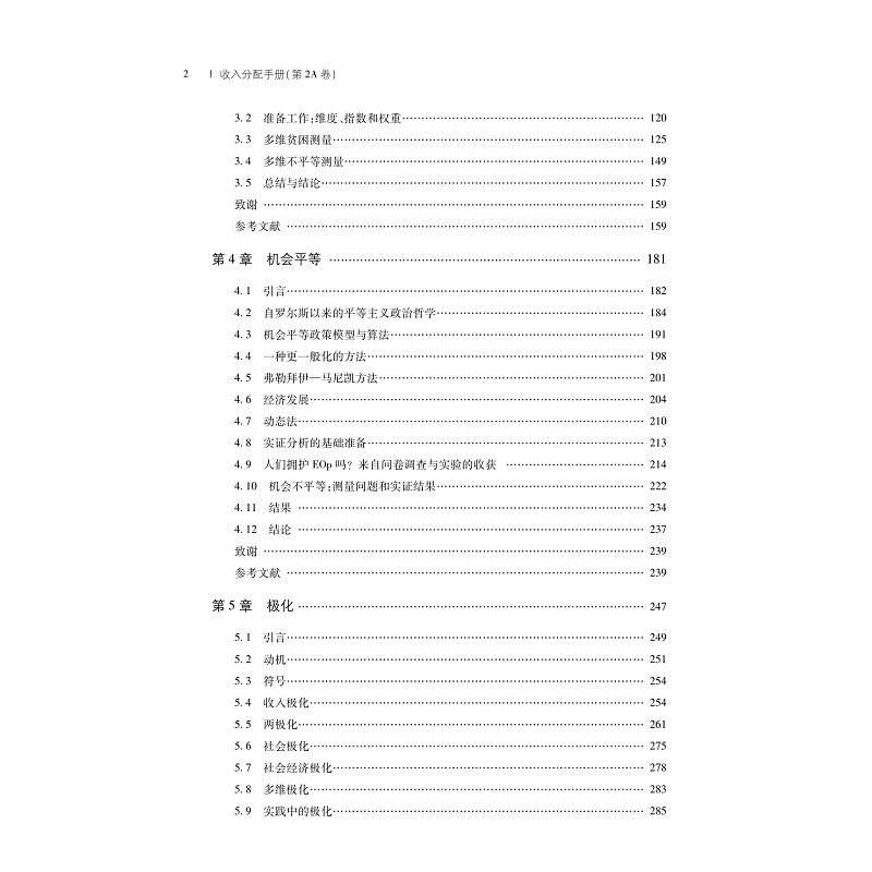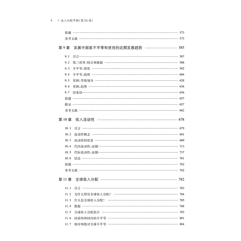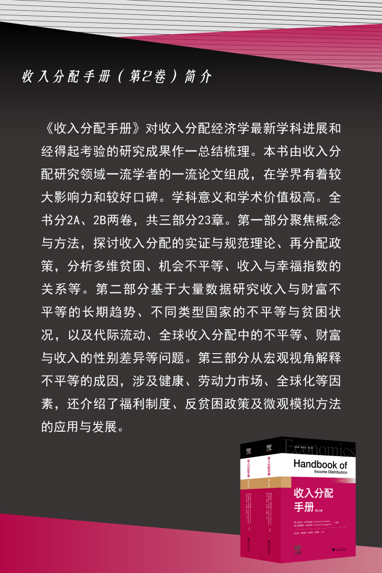 《收入分配手册》对收入分配经济学最新学科进展和经得起考验的研究成果作一总结梳理。本书由收入分配研究领域一流学者的一流论文组成,在学界有着较大影响力和较好口碑。学科意义和学术价值极高。全书分 2A、2B 两卷,共三部分 23 章。第一部分聚焦概念与方法,探讨收入分配的实证与规范理论、再分配政策,分析多维贫困、机会不平等、收入与幸福指数的关系等。第二部分基于大量数据研究收入与财富不平等的长期趋势、不同类型国家的不平等与贫困状况,以及代际流动、全球收入分配中的不平等、财富与收入的性别差异等问题。第三部分从宏观视角解释不平等的成因,涉及健康、劳动力市场、全球化等因素,还介绍了福利制度、反贫困政策及微观模拟方法的应用与发展。