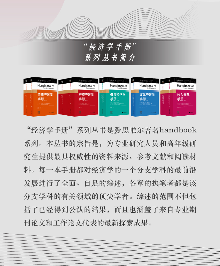 “经济学手册”系列丛书是爱思唯尔著名handbook系列。本丛书的宗旨是,为专业研究人员和高年级研究生提供zui具权威性的资料来源、参考文献和阅读材料。每一本手册都对经济学的一个分支学科的zui前沿发展进行了全面、自足的综述,各章的执笔者都是该分支学科的有关领域的顶尖学者。综述的范围不但包括了已经得到公认的结果,而且也涵盖了来自专业期刊论文和工作论文代表的zui新探索成果。