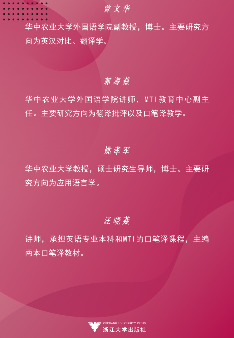 曾文华,华中农业大学外国语学院副教授,博士。主要研究方向为英汉对比、翻译学。