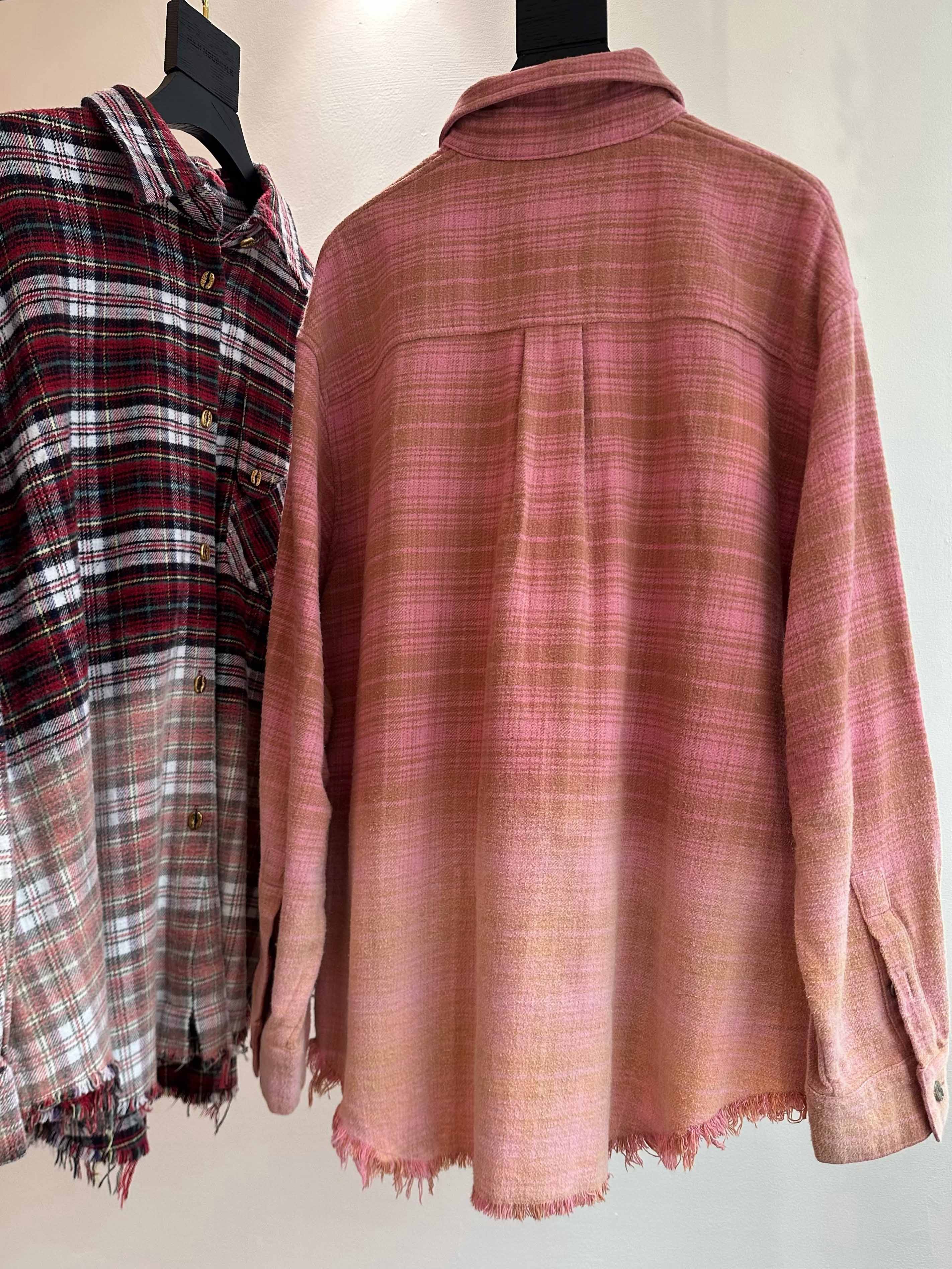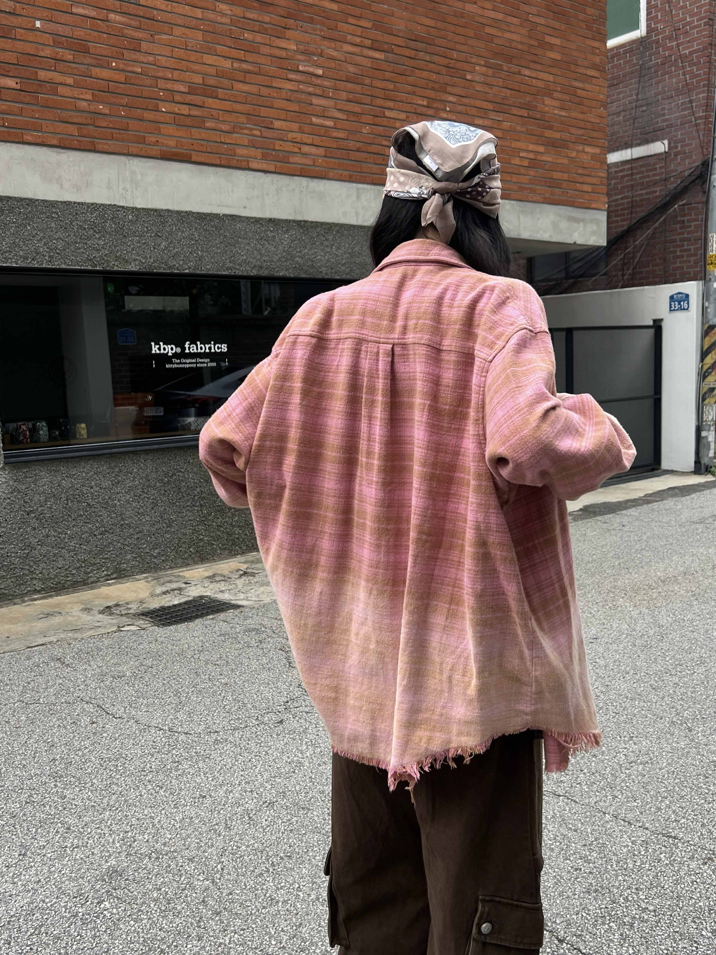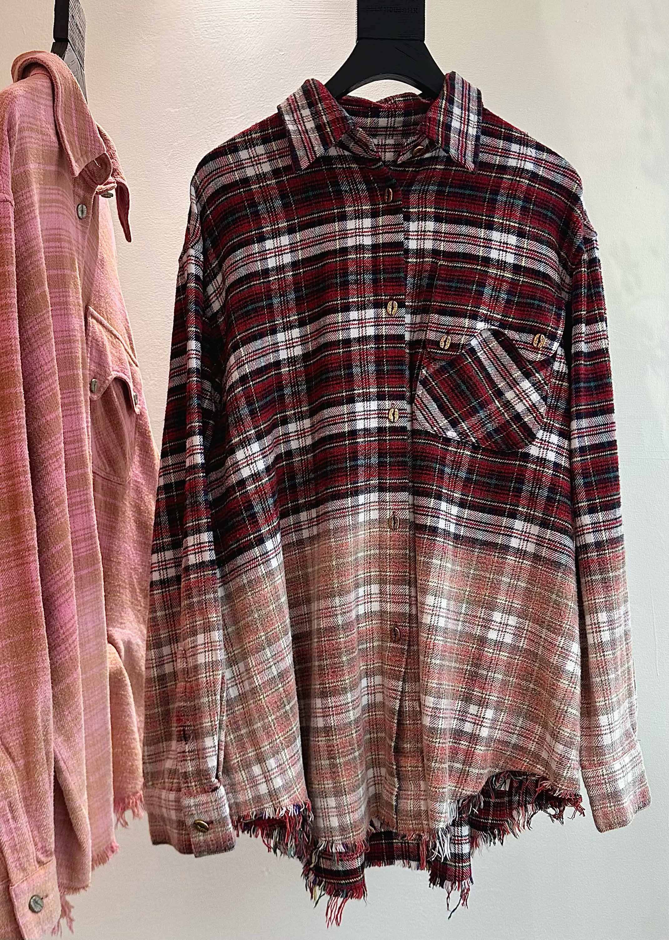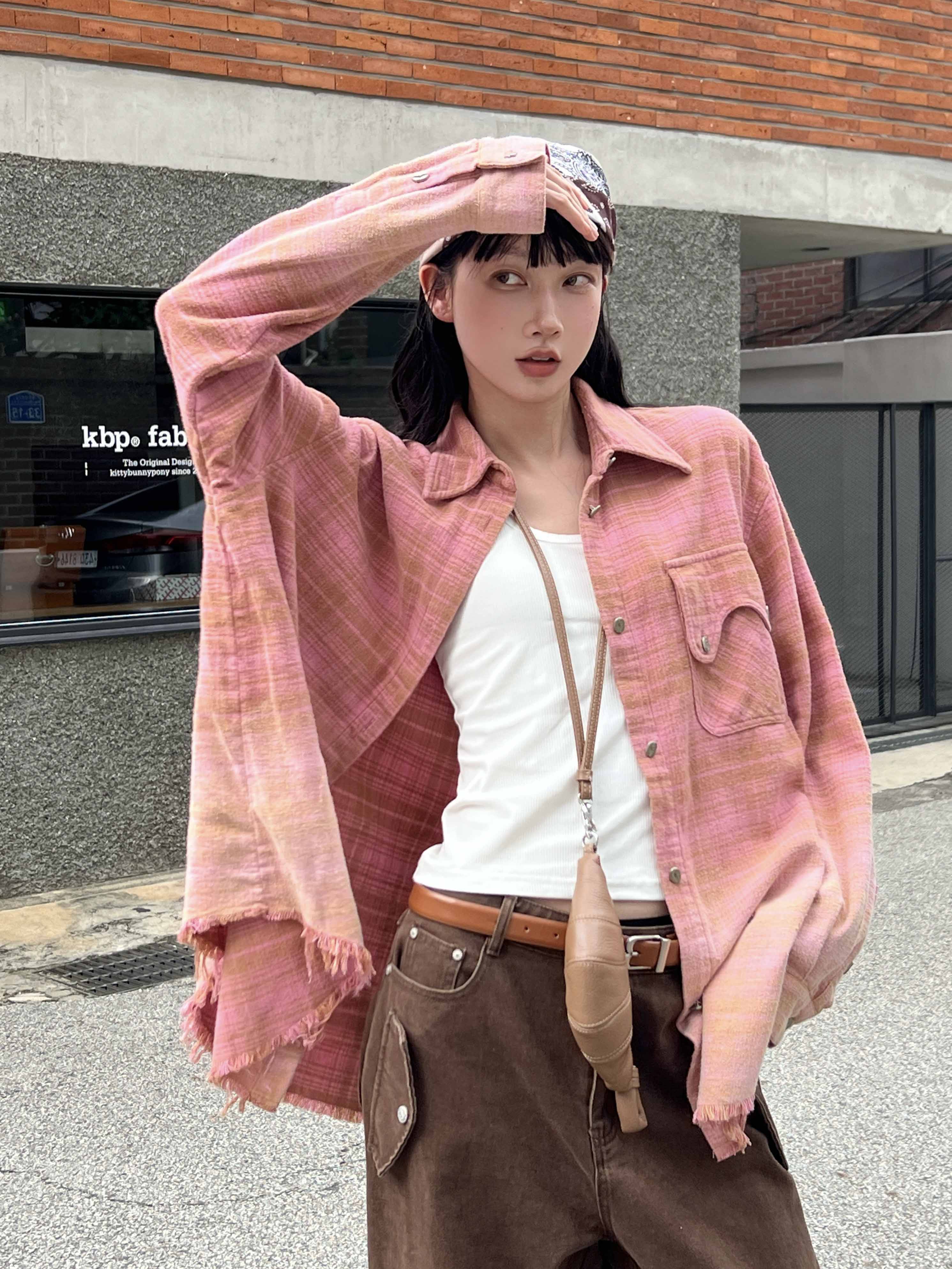 撞色格纹大口袋晕染水洗街头廓形衬衫(男女同款) ·深红色/渐变粉