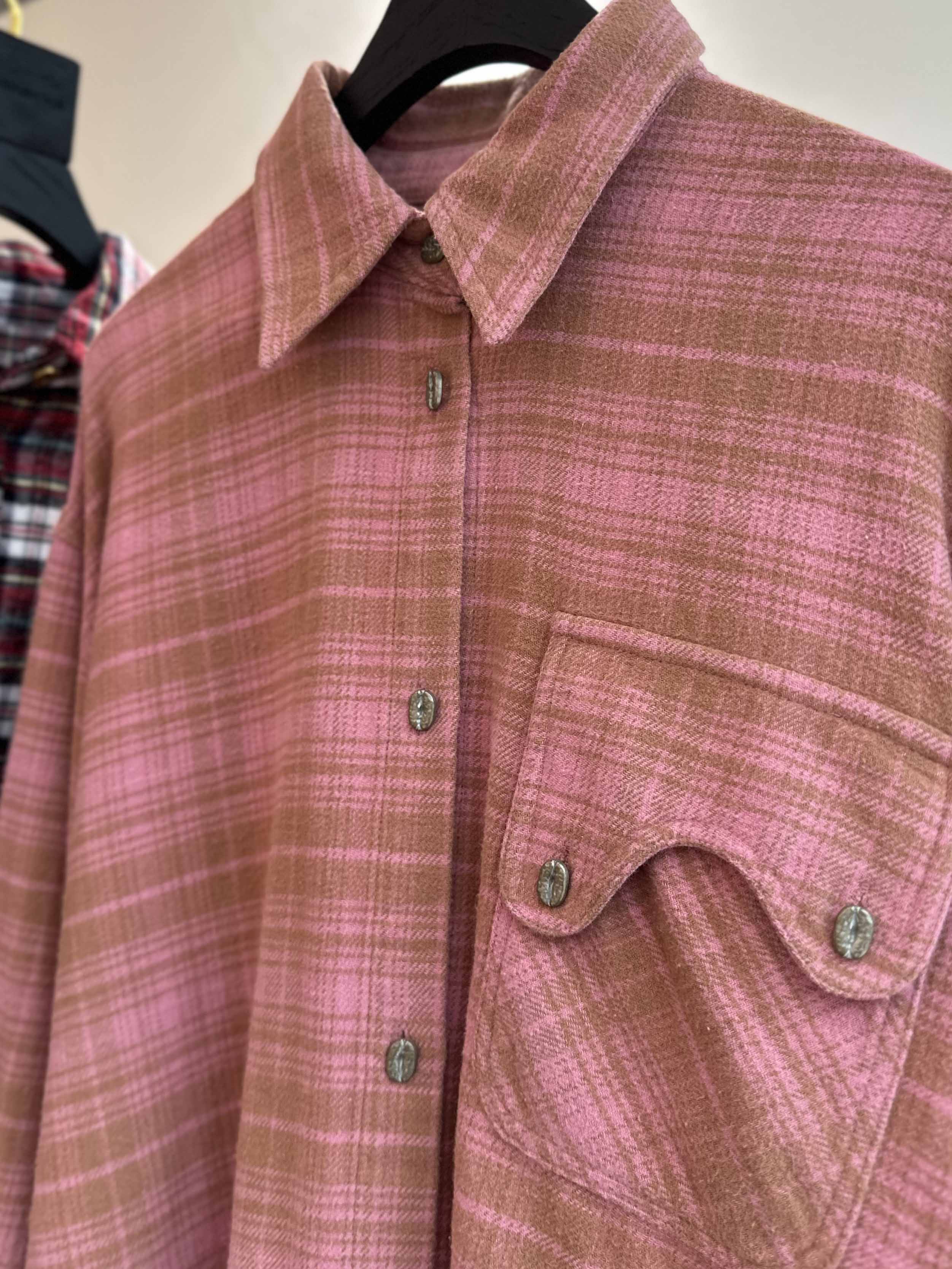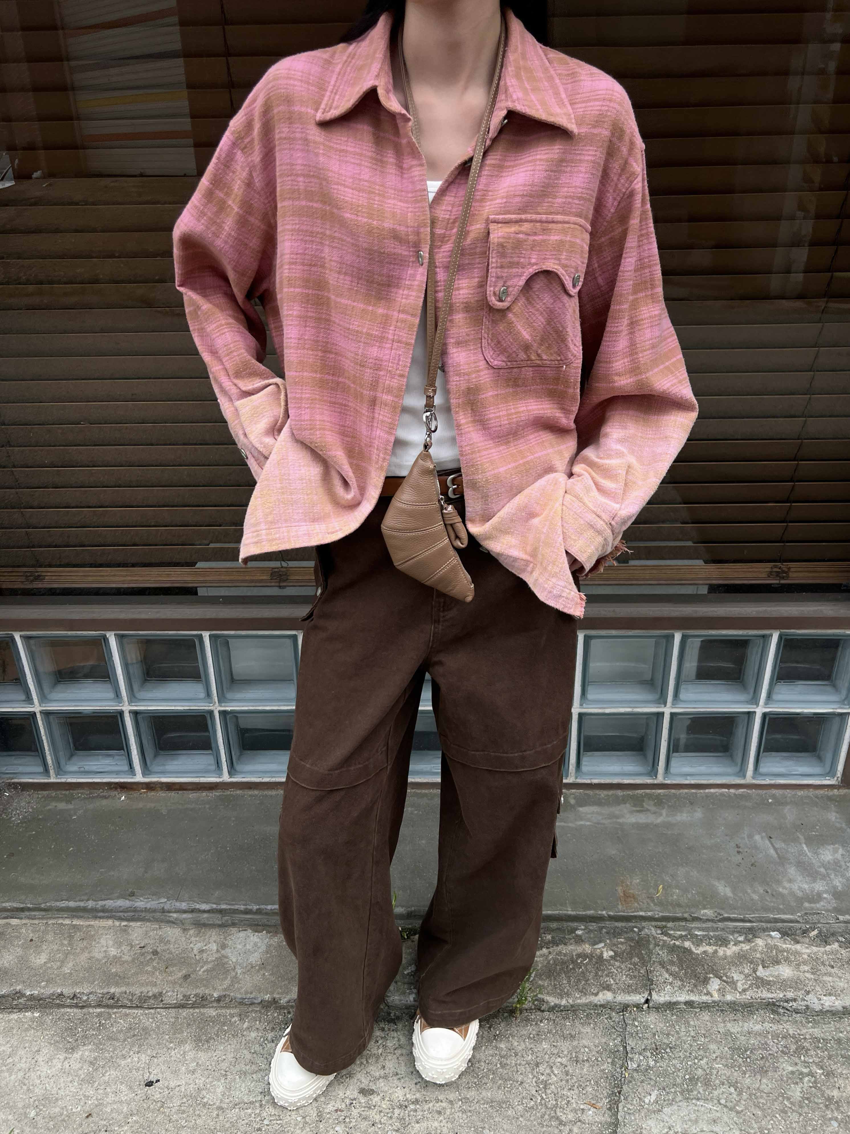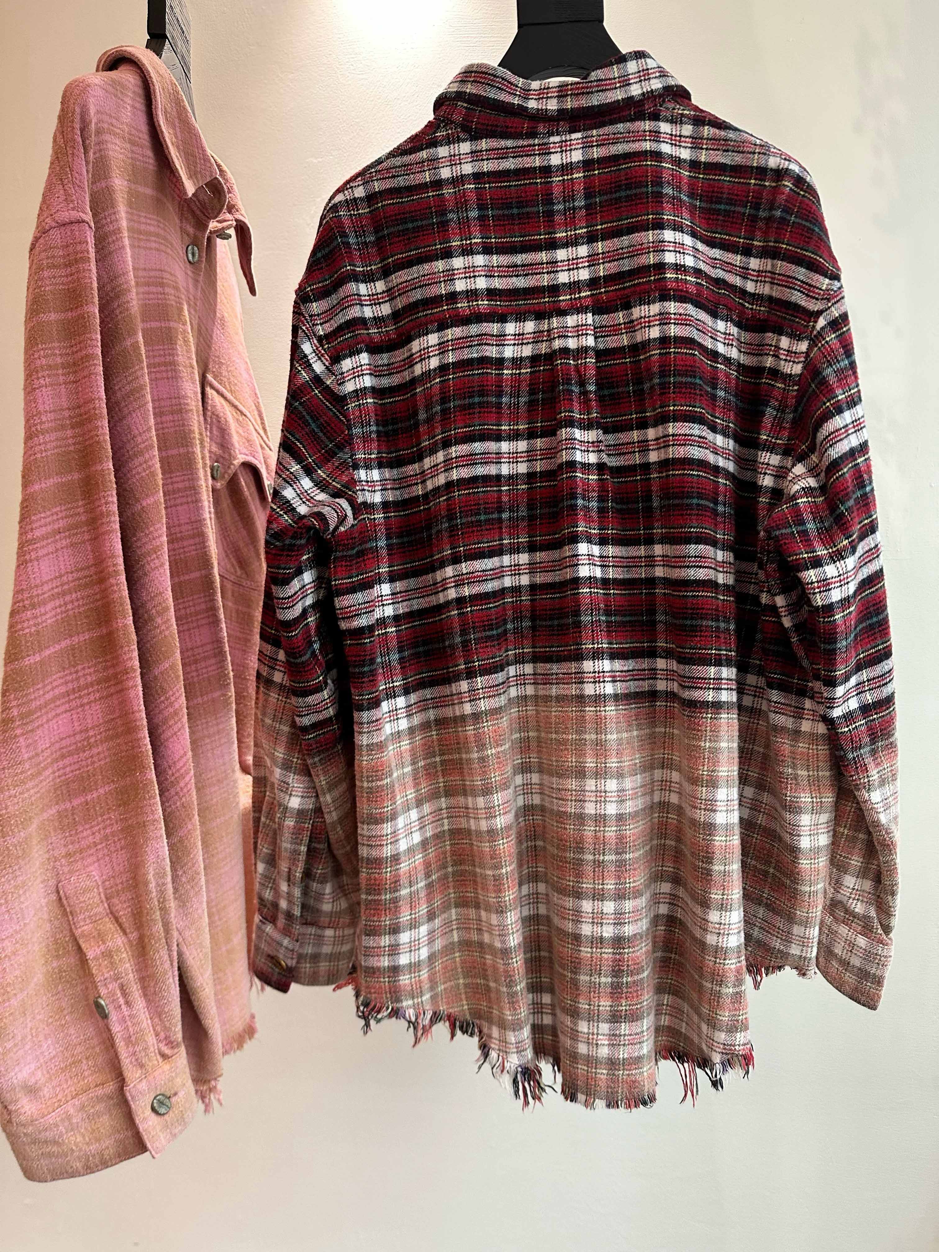 撞色格纹大口袋晕染水洗街头廓形衬衫(男女同款) ·深红色/渐变粉