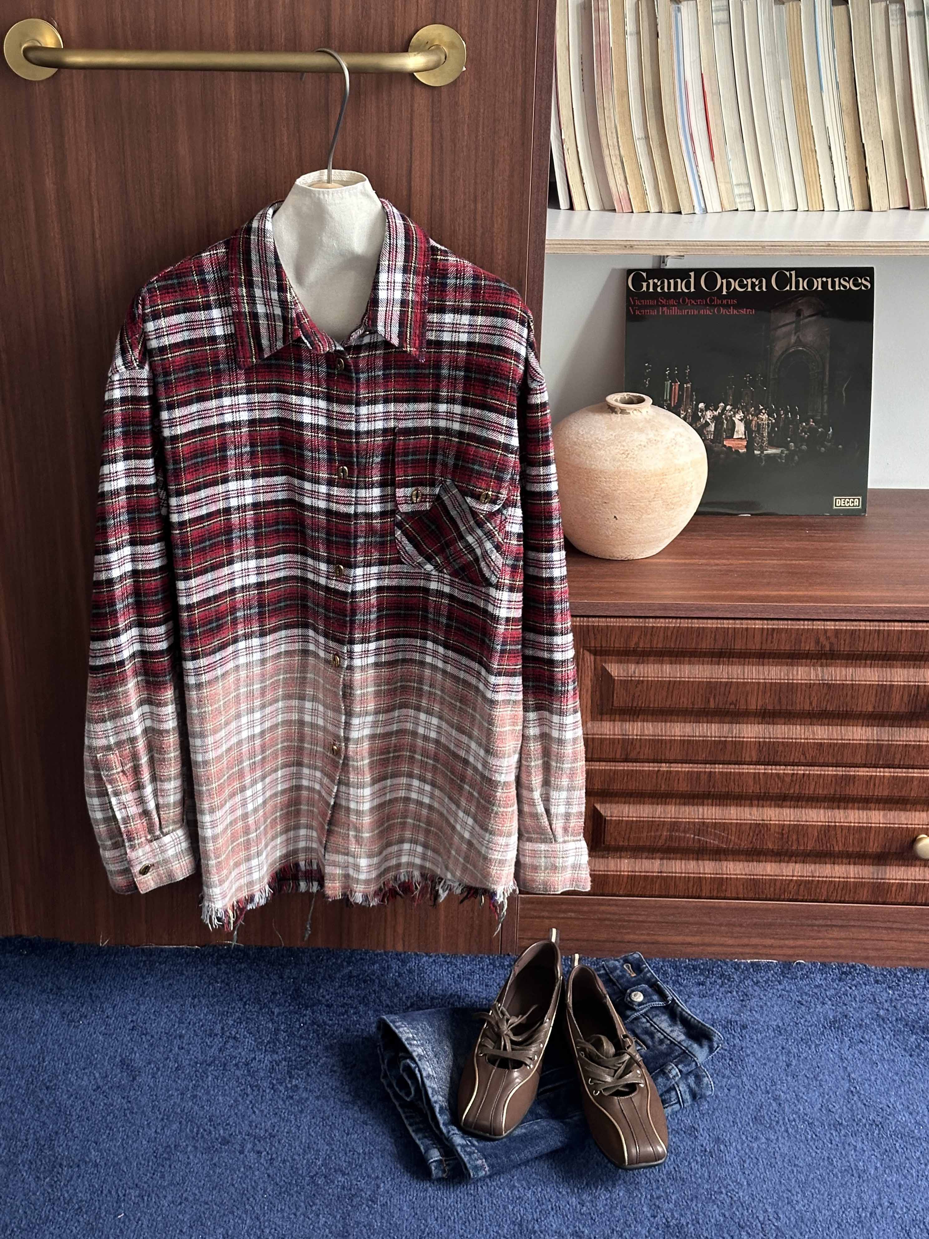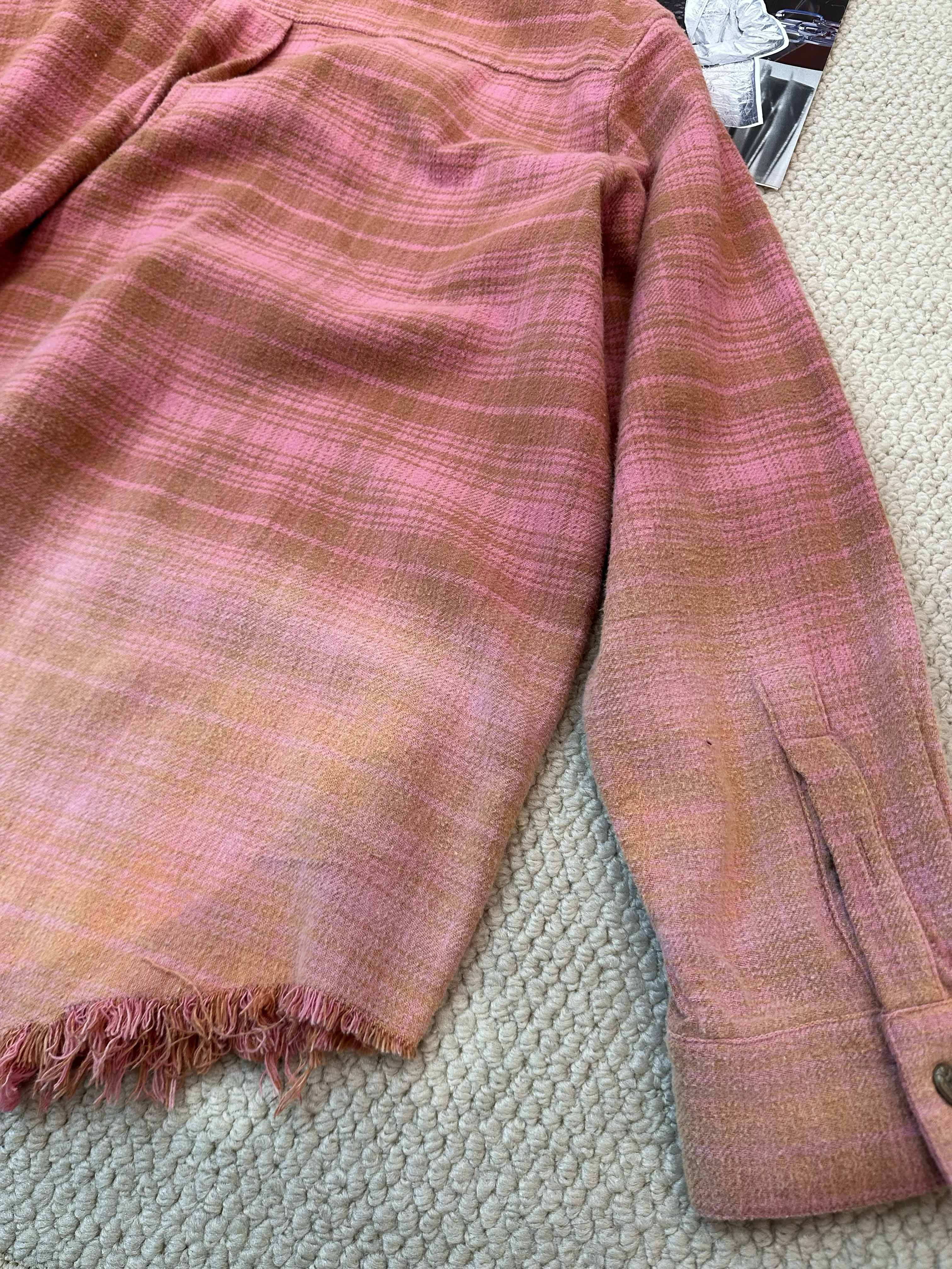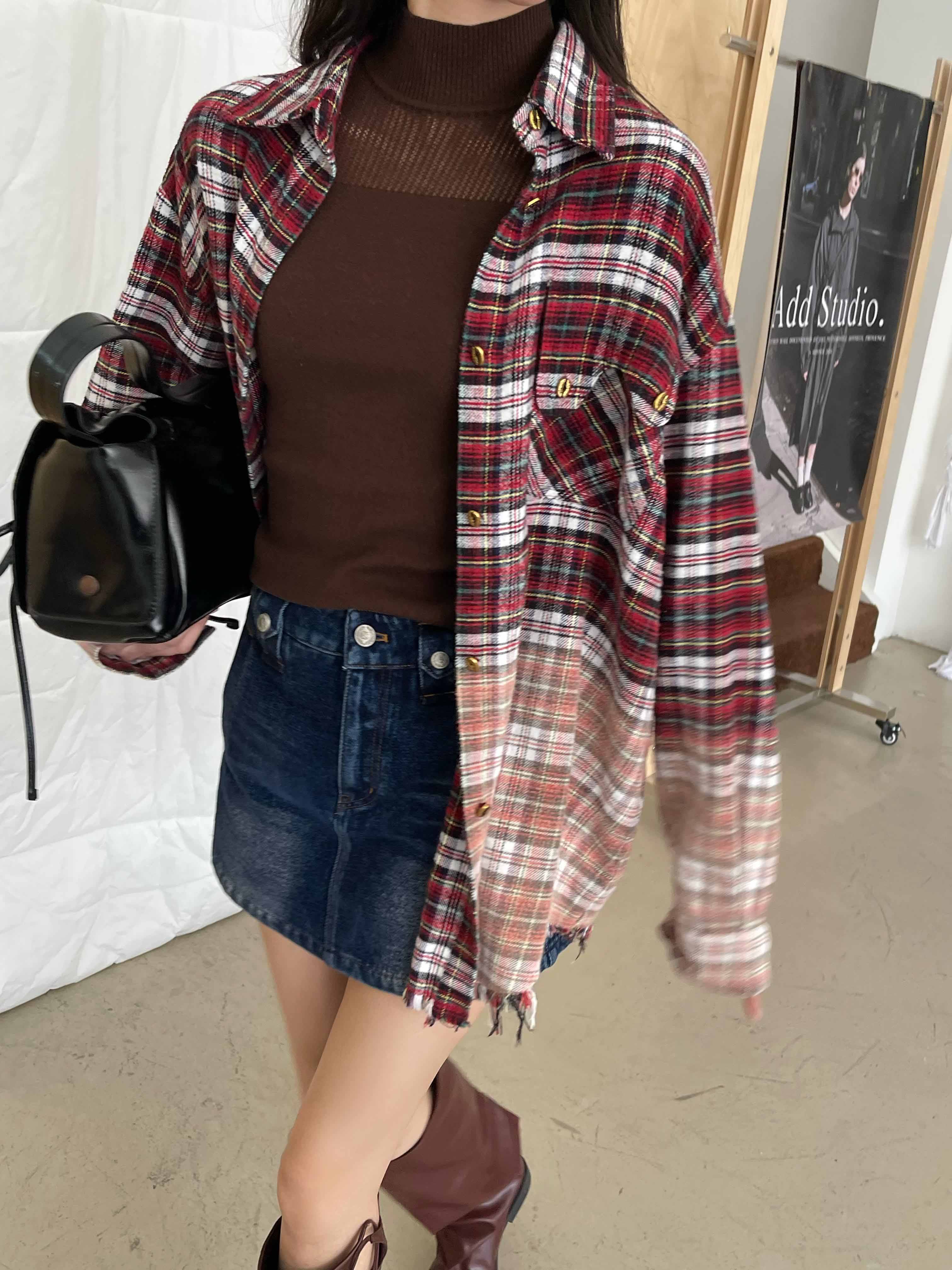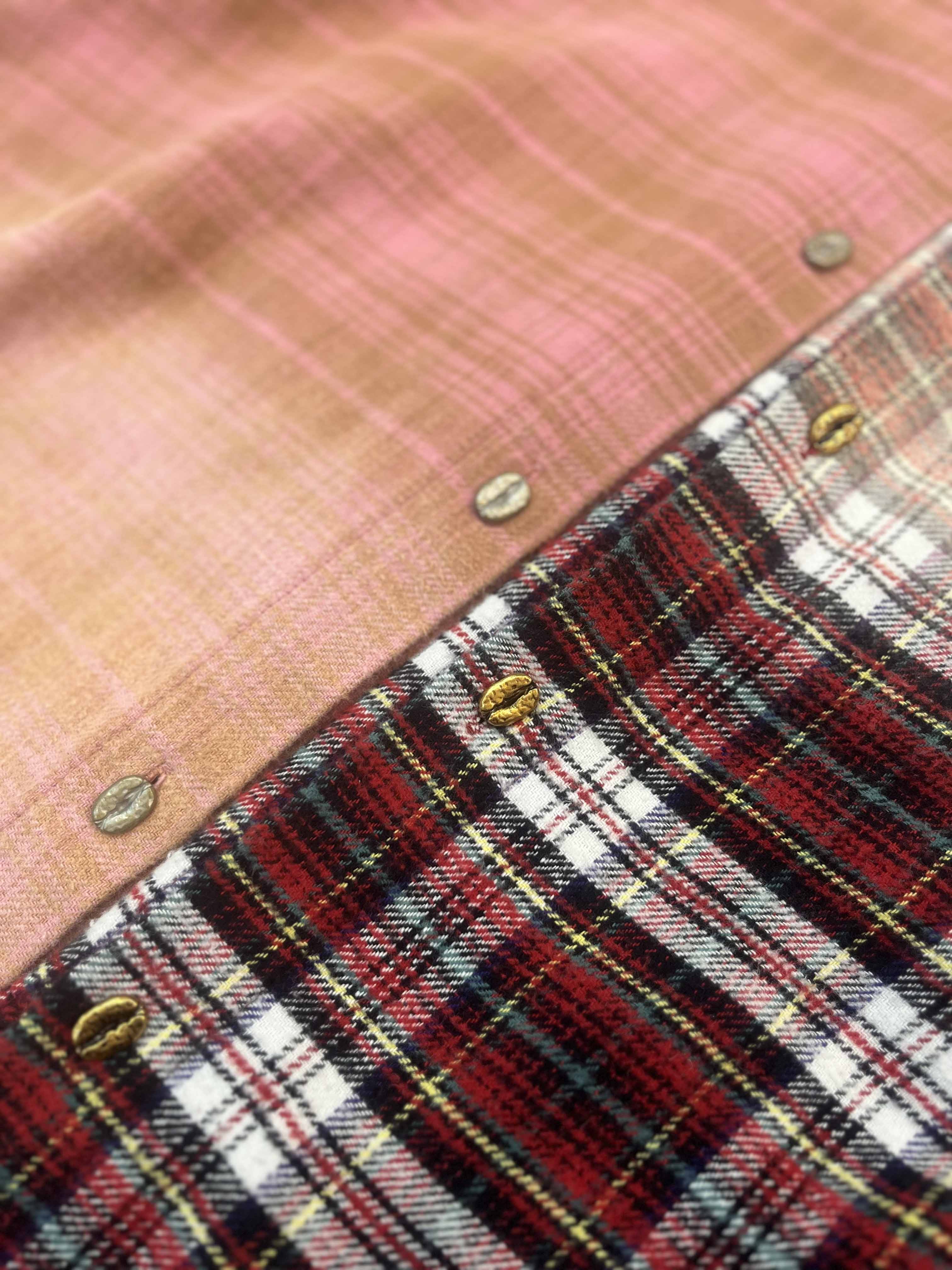 撞色格纹大口袋晕染水洗街头廓形衬衫(男女同款) ·深红色/渐变粉
