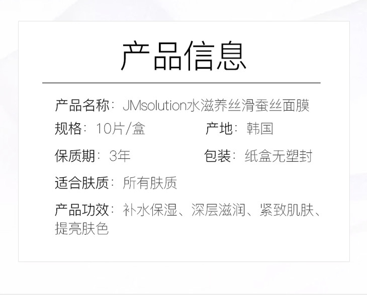 JMsolution 银色白蚕丝大米面膜补水 💦改善暗沉,🌿美白银蚕丝面膜 ,⭐️⭐️提亮肤色使肌肤弹力光滑光洁透亮 !含有珍珠提取物和烟酰胺,蚕丝提取物, ☘️打造透亮光洁的肌肤 ,🎉鼓槌籽將提取物对于雾霾有非常突出的抵抗力 ,🌈🌈有很强的净化功能,帮助肌肤清沽, 恢复肌肤原本活力!