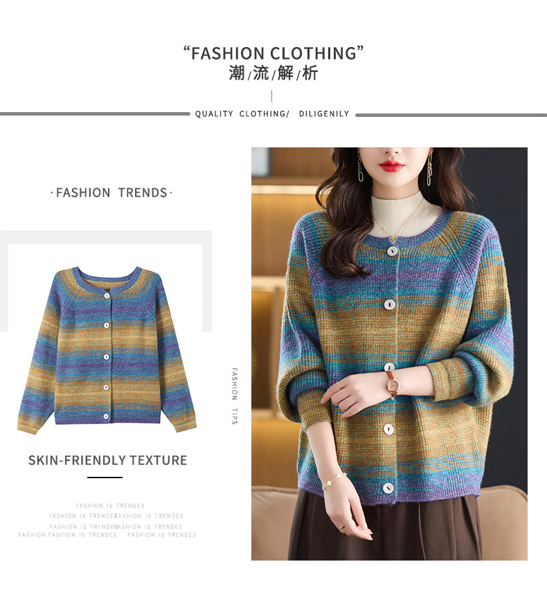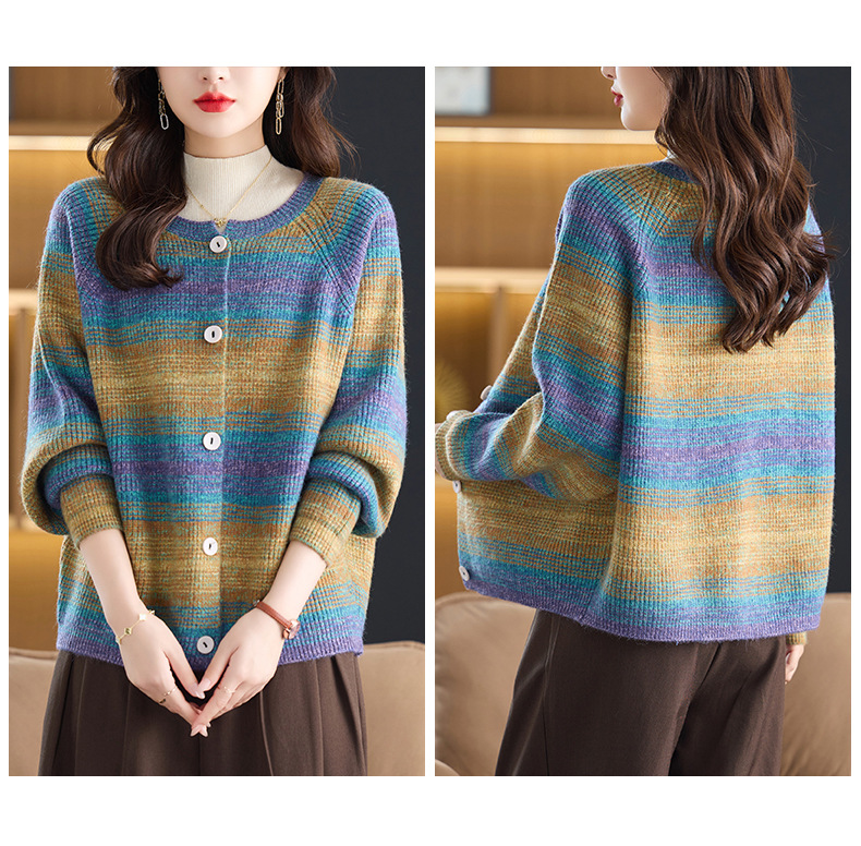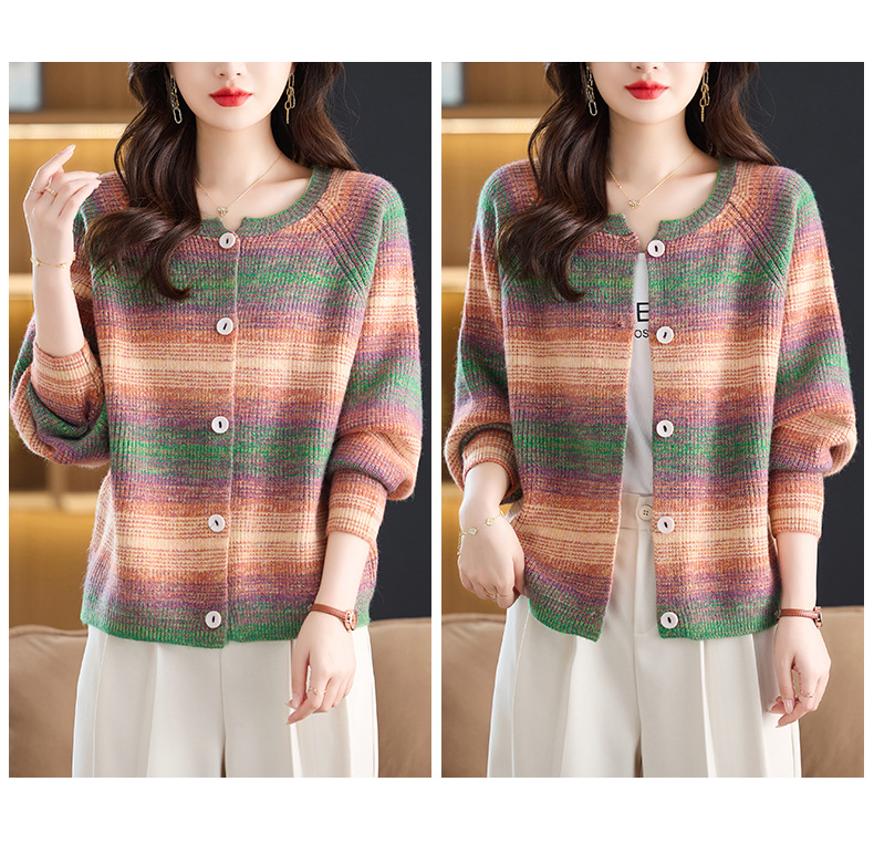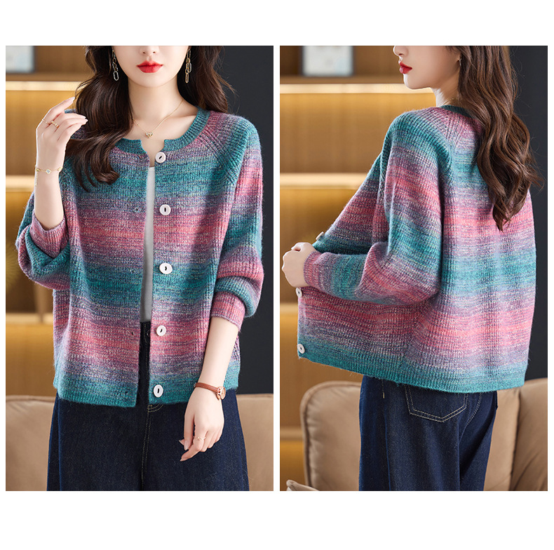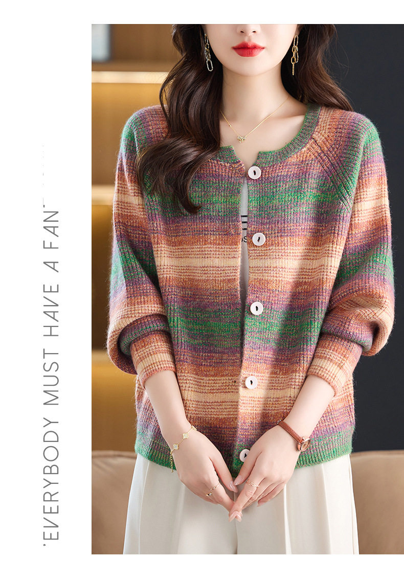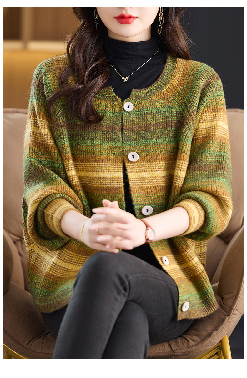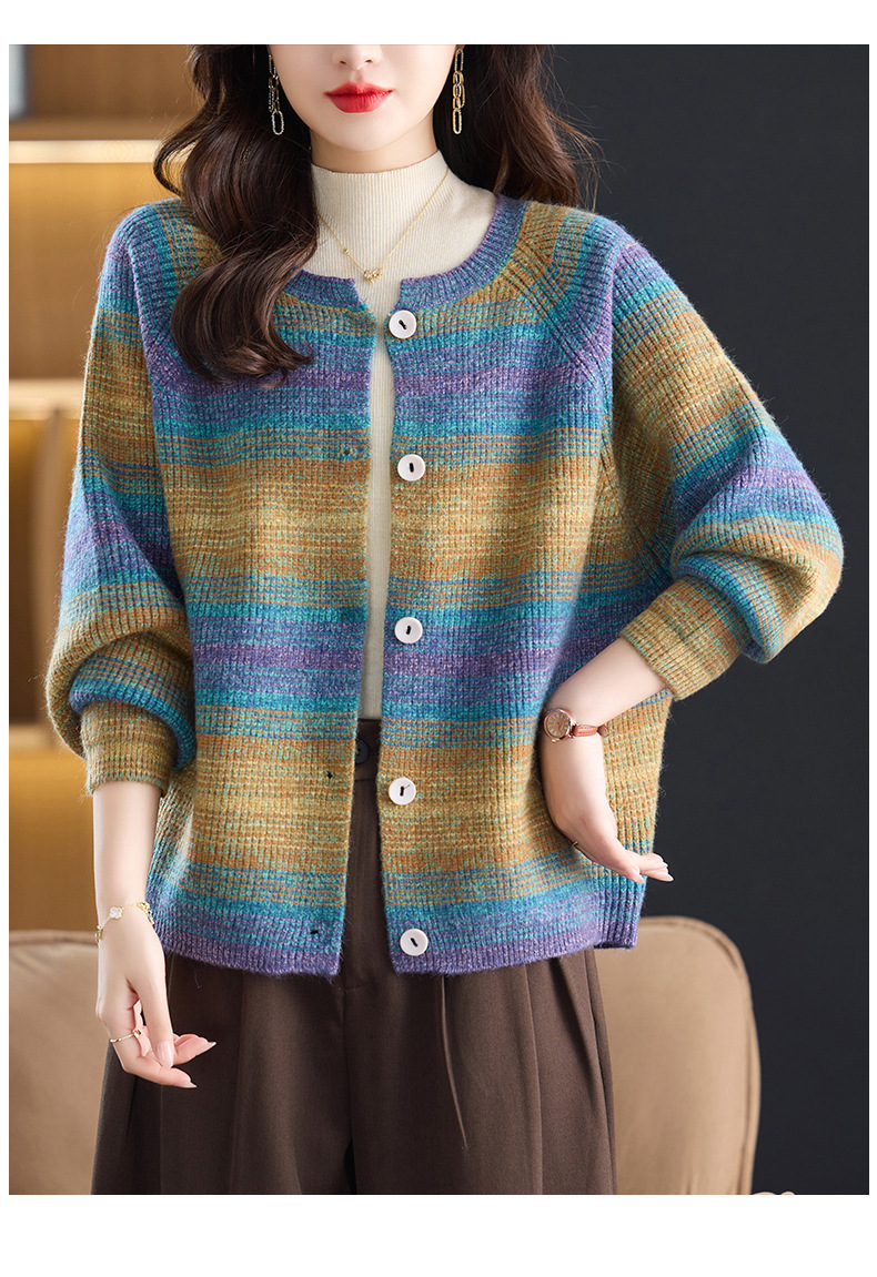 CC设计感撞色彩虹条纹圆领针织开衫2025年秋季韩版减龄蝙蝠毛衣外套
