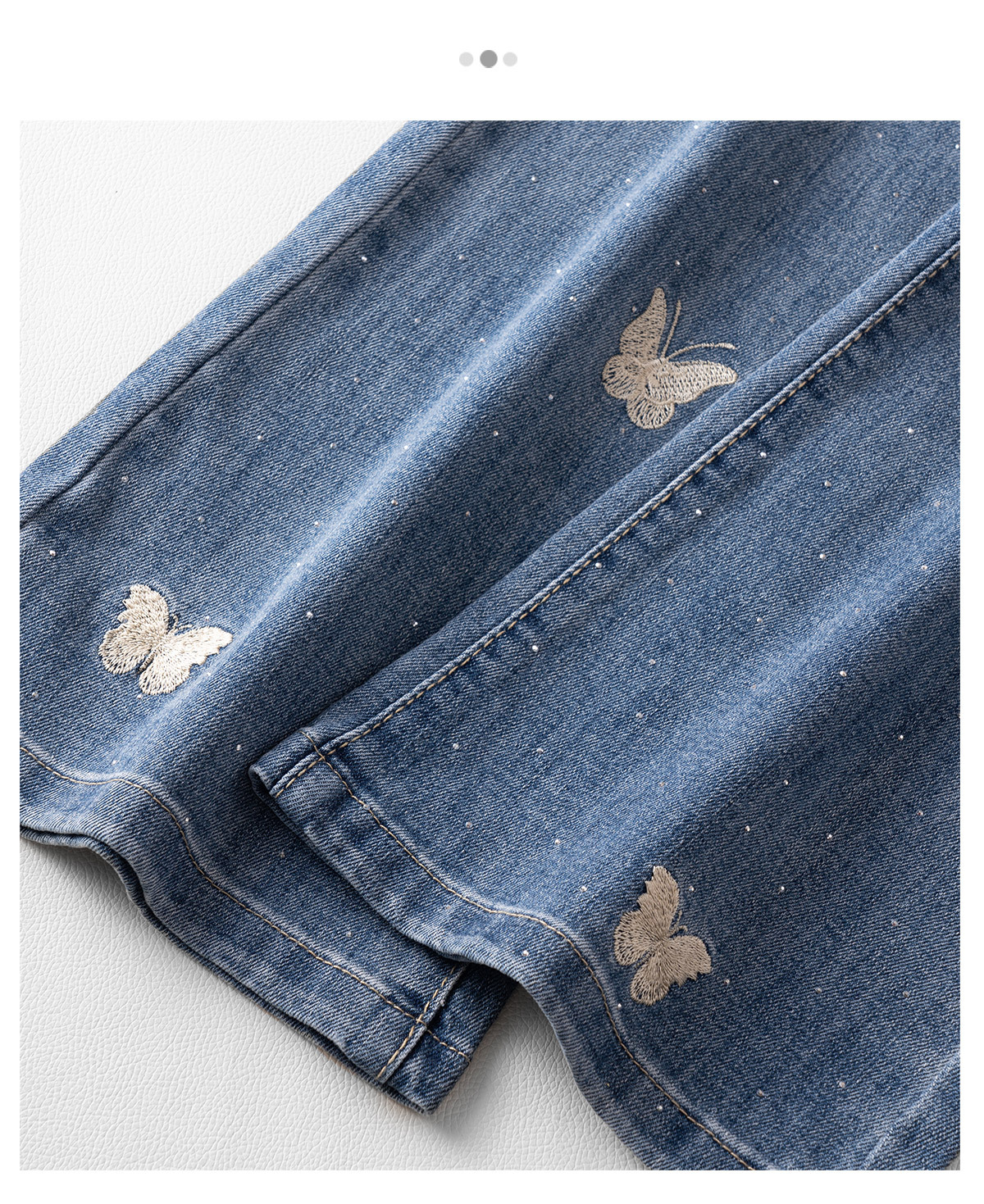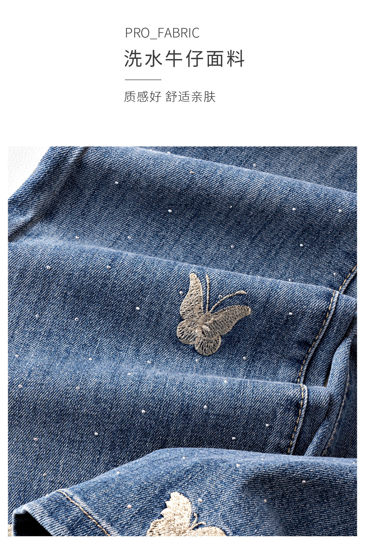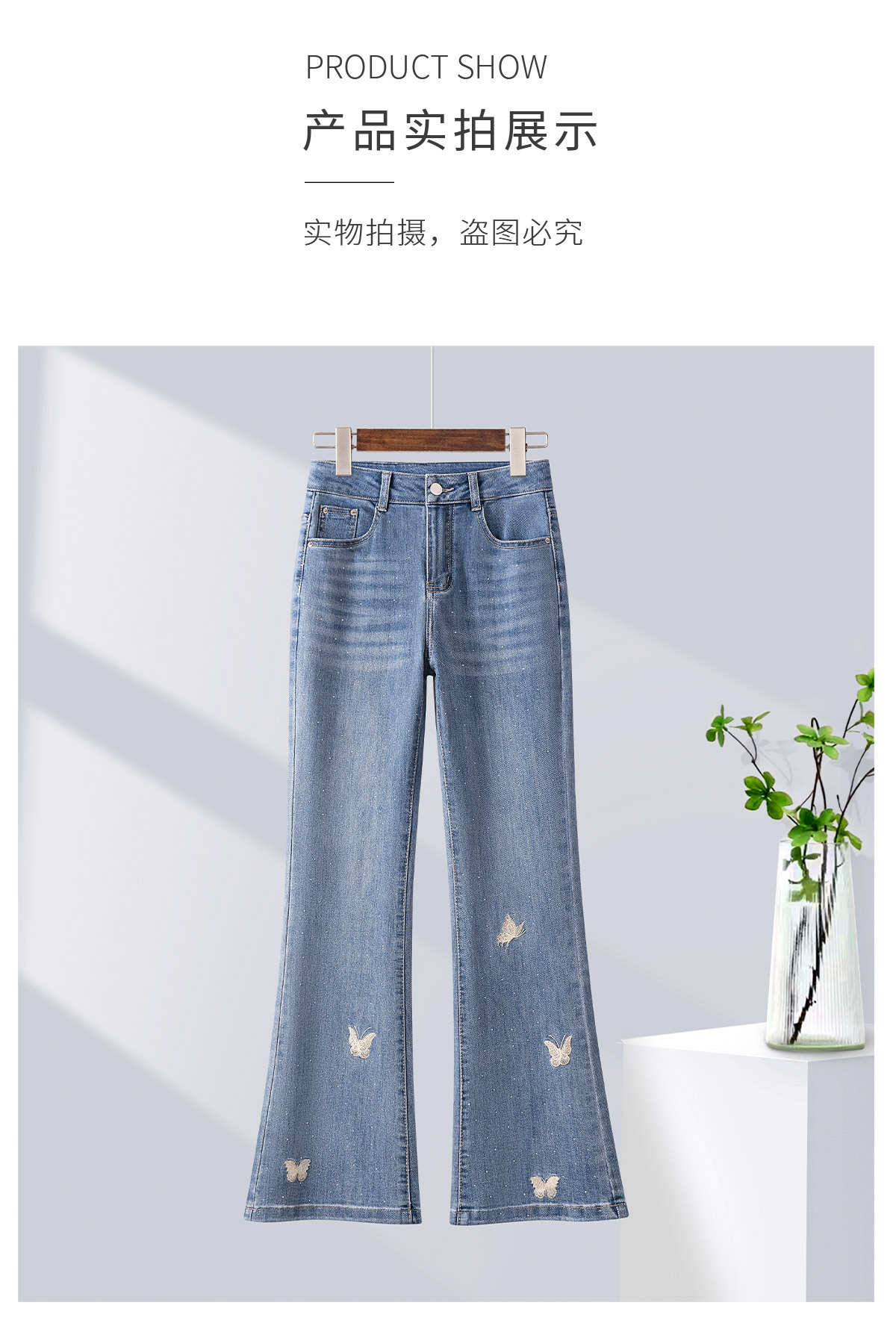「自」全新升级【铂金会员165/天猫219/差价54】(95551)洛诗琳蝴蝶刺绣烫钻牛仔裤2025夏季高腰弹力修身微喇裤女