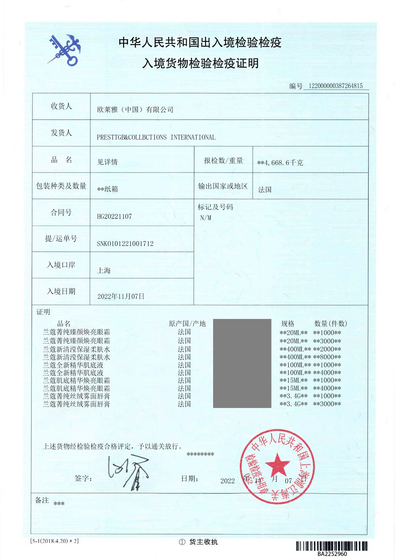 【规格】:400l/瓶