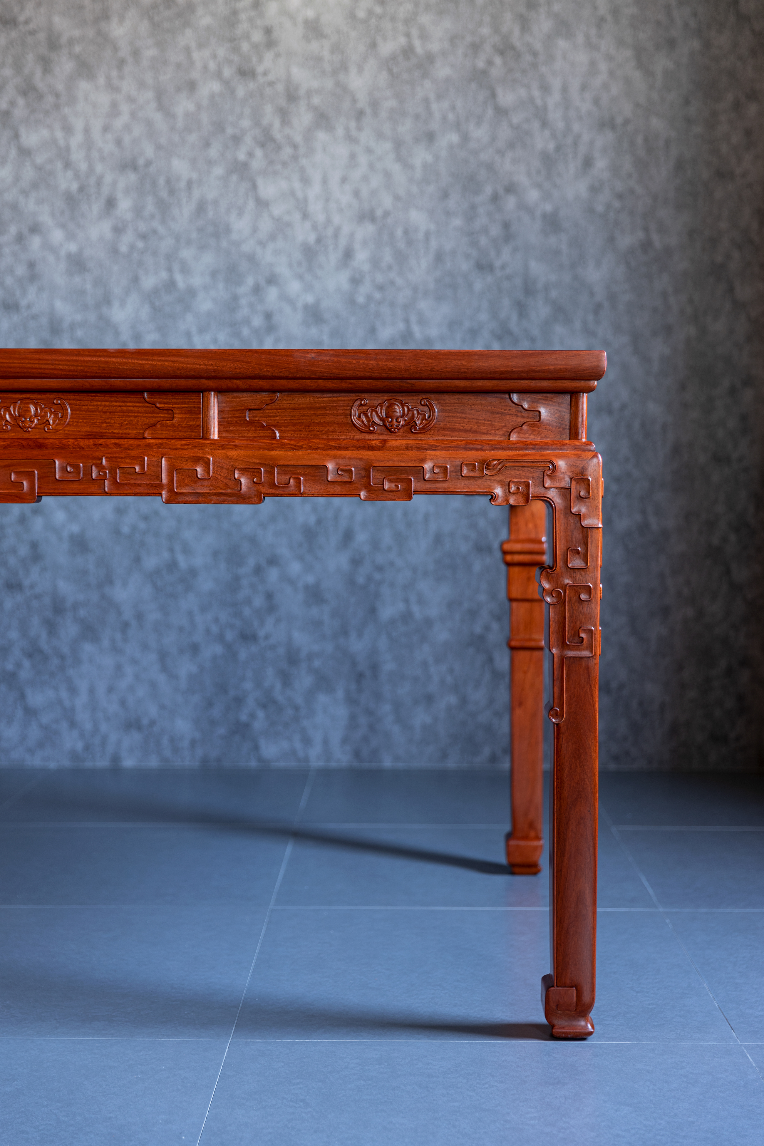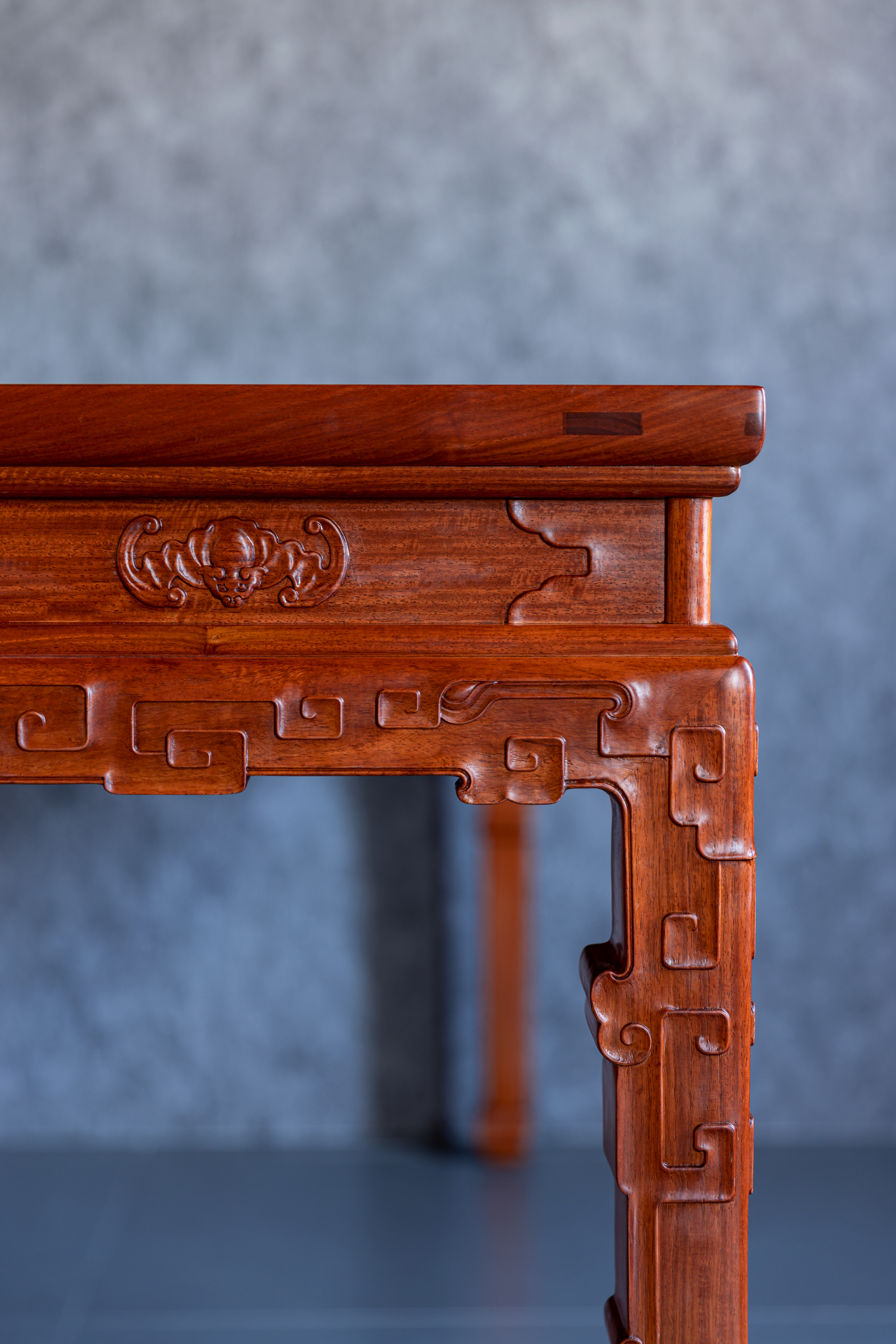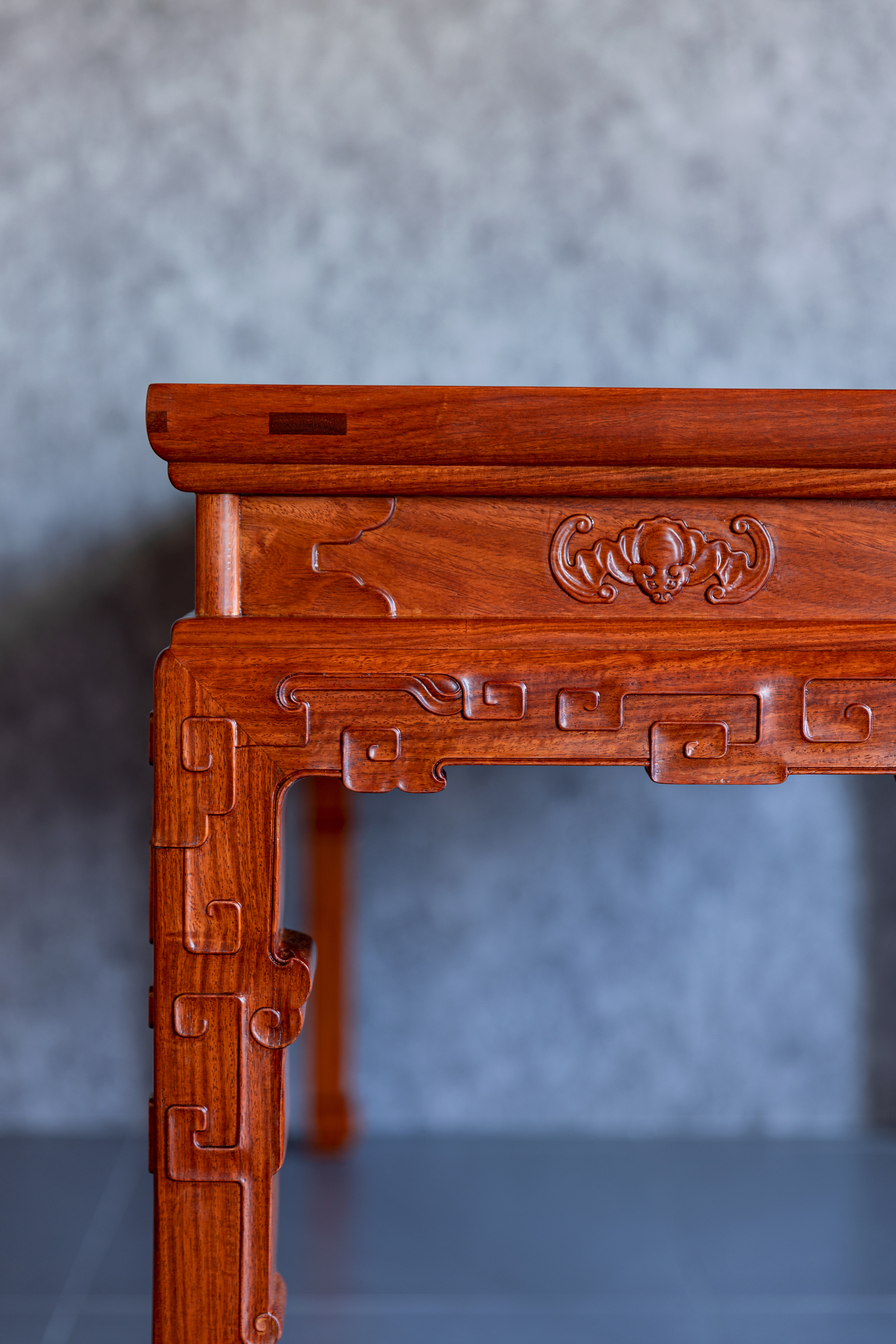 此桌原型来自清中期 紫檀拐子蝠纹条桌,为故宫博物院旧藏,桌面攒框装面芯板,冰盘沿,上舒下敛,高束腰,带有抽屉,面板浮雕蝙蝠纹,蝙蝠谐音“福”,寓意美好。下方牙板雕铲地浮雕拐子纹,回环往复,连绵不断。