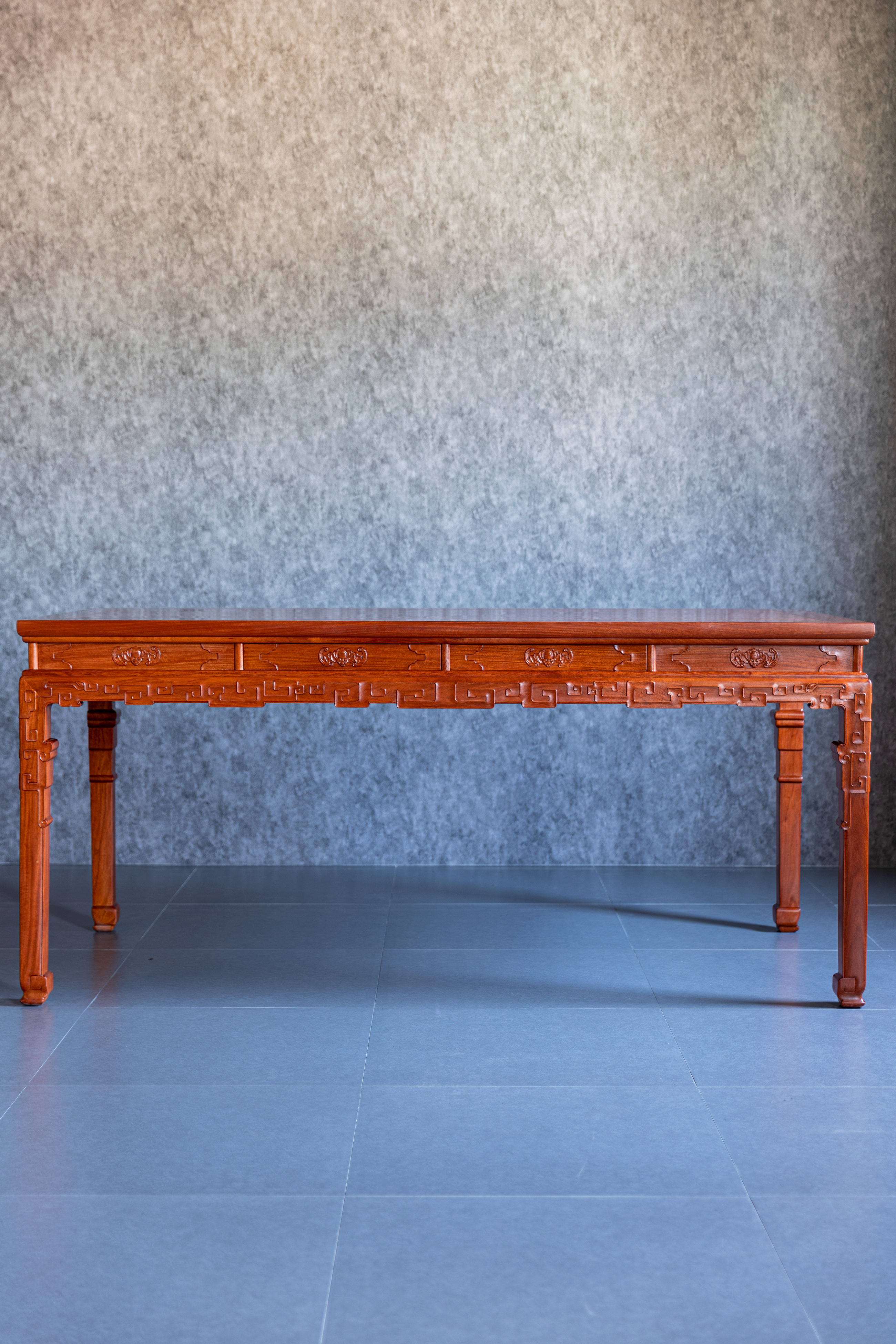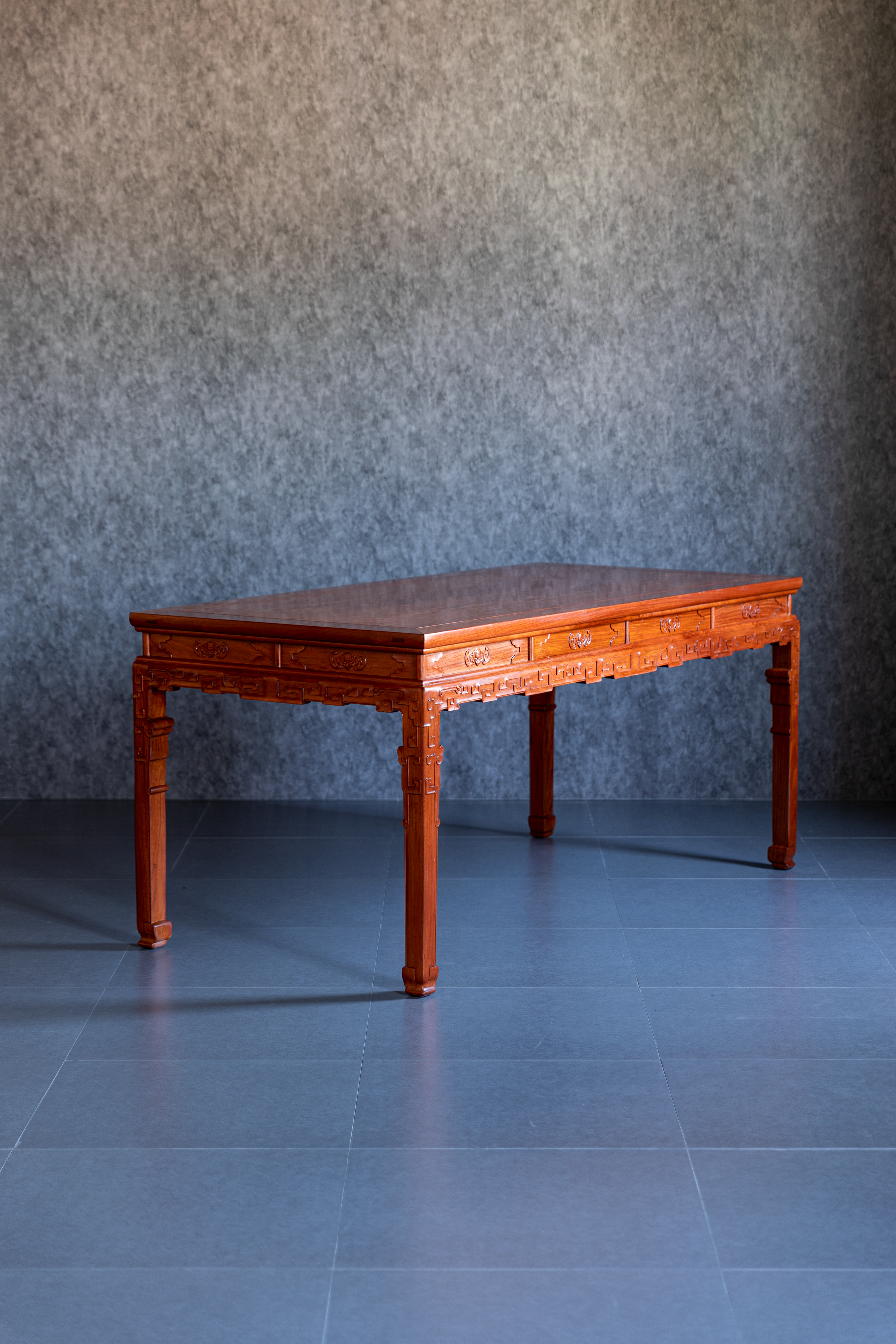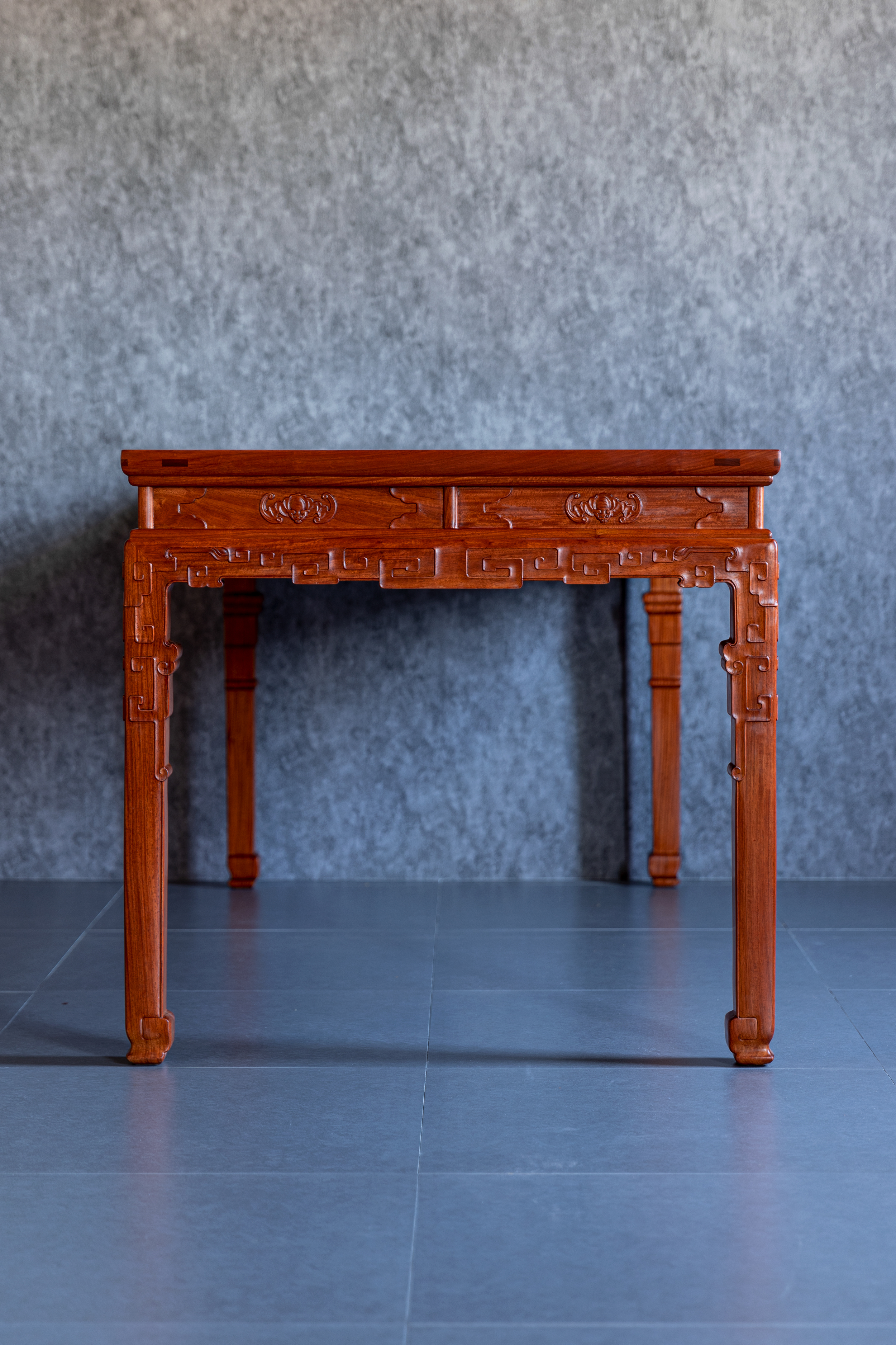 此桌原型来自清中期 紫檀拐子蝠纹条桌,为故宫博物院旧藏,桌面攒框装面芯板,冰盘沿,上舒下敛,高束腰,带有抽屉,面板浮雕蝙蝠纹,蝙蝠谐音“福”,寓意美好。下方牙板雕铲地浮雕拐子纹,回环往复,连绵不断。