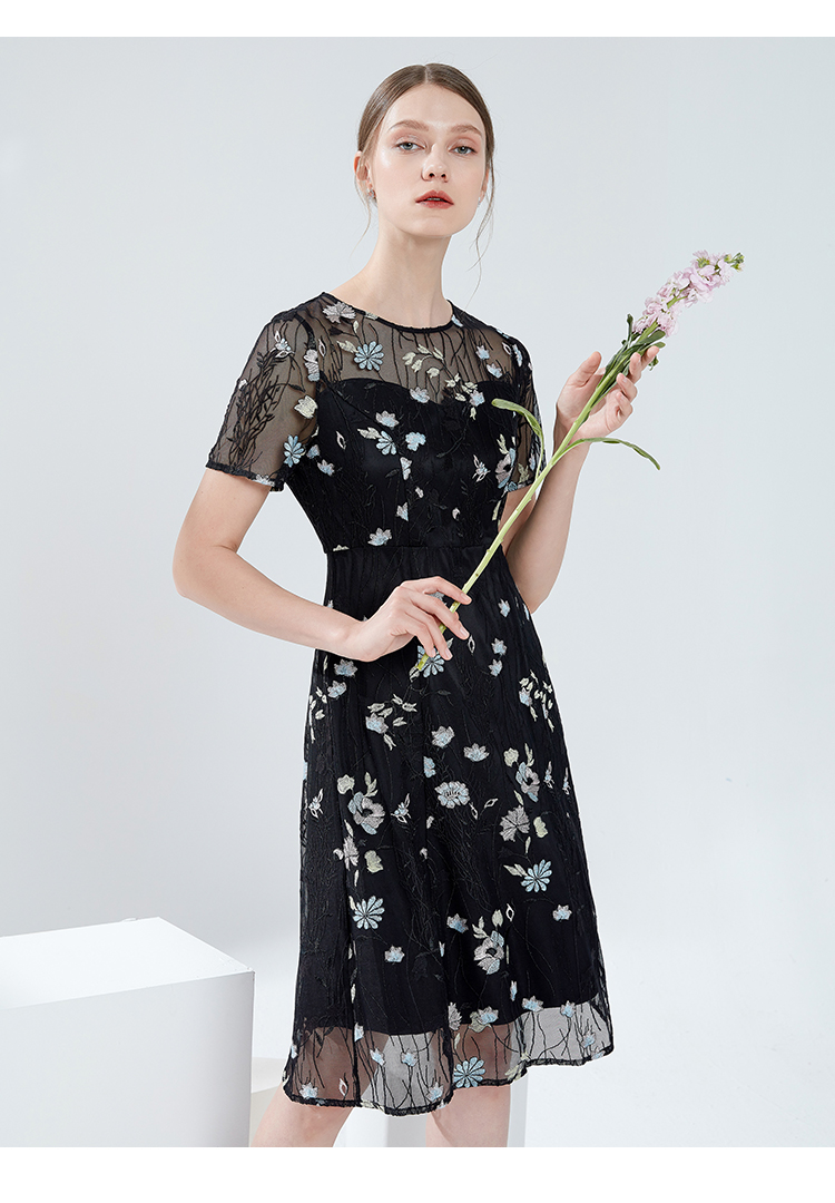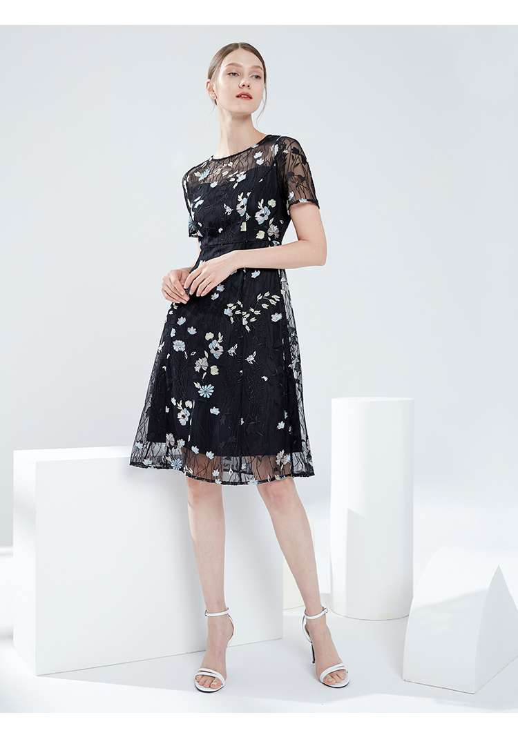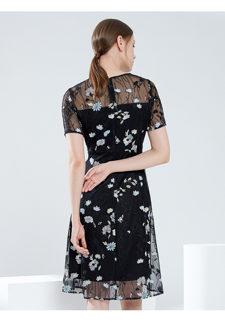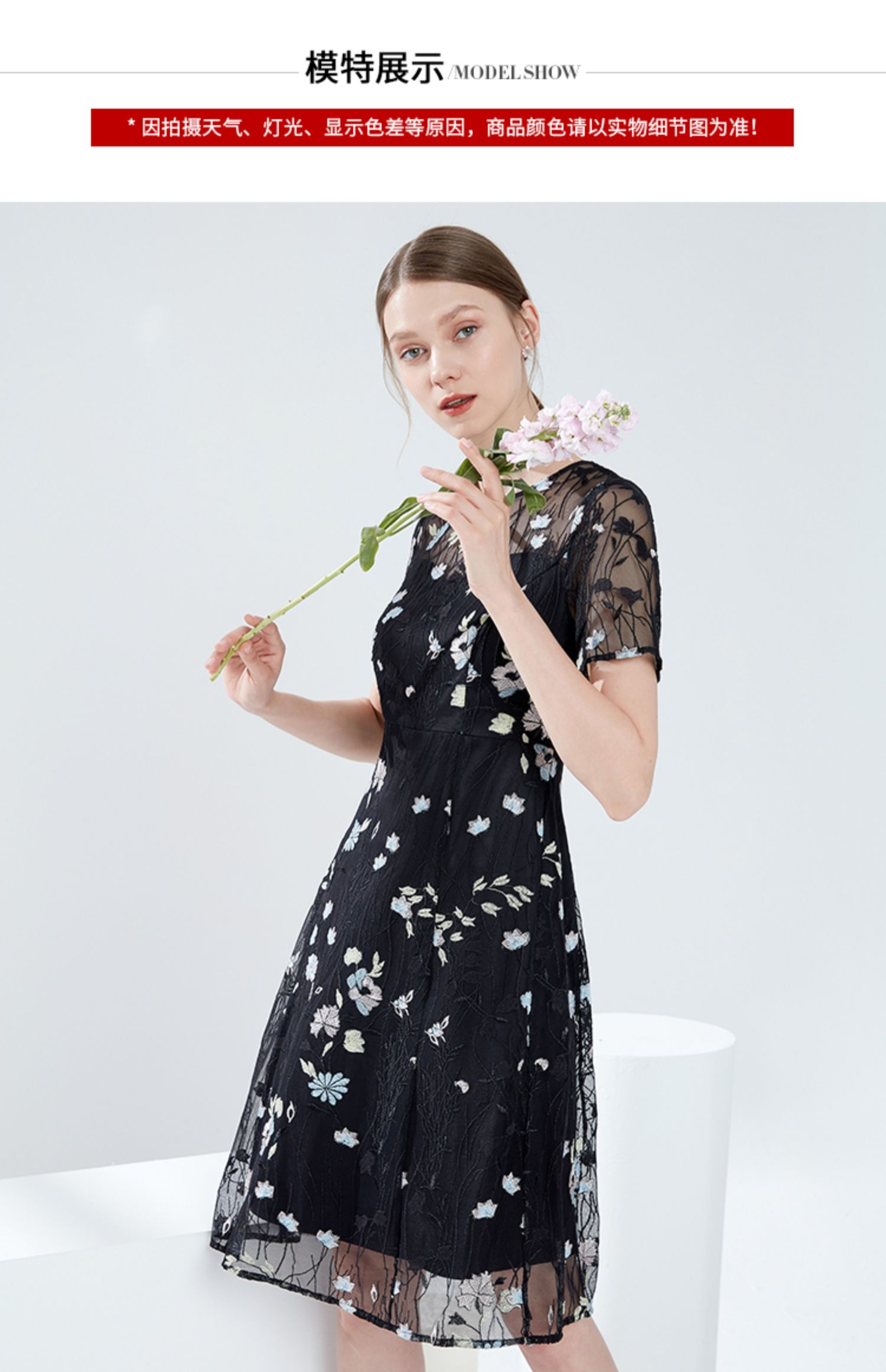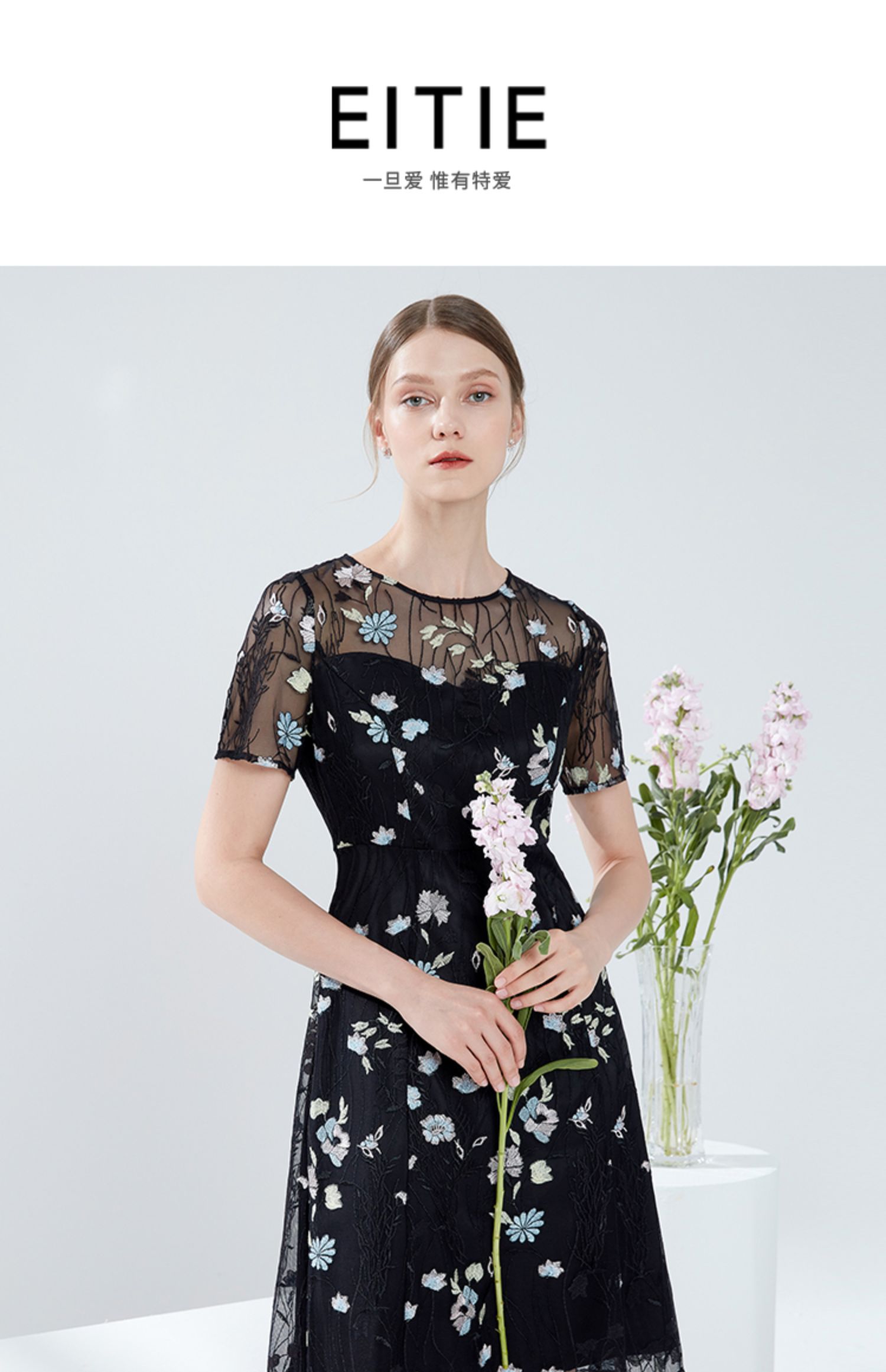 EITIE爱特爱夏季新款时尚镂空网纱印花温柔显瘦收腰A字连衣裙B2107736