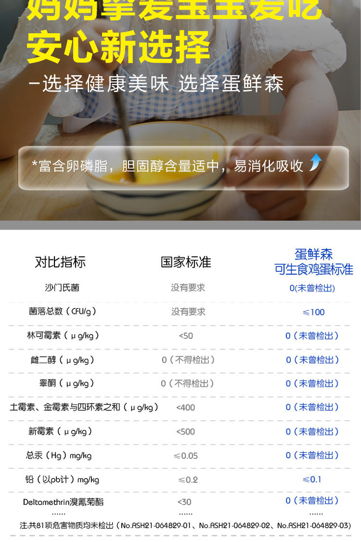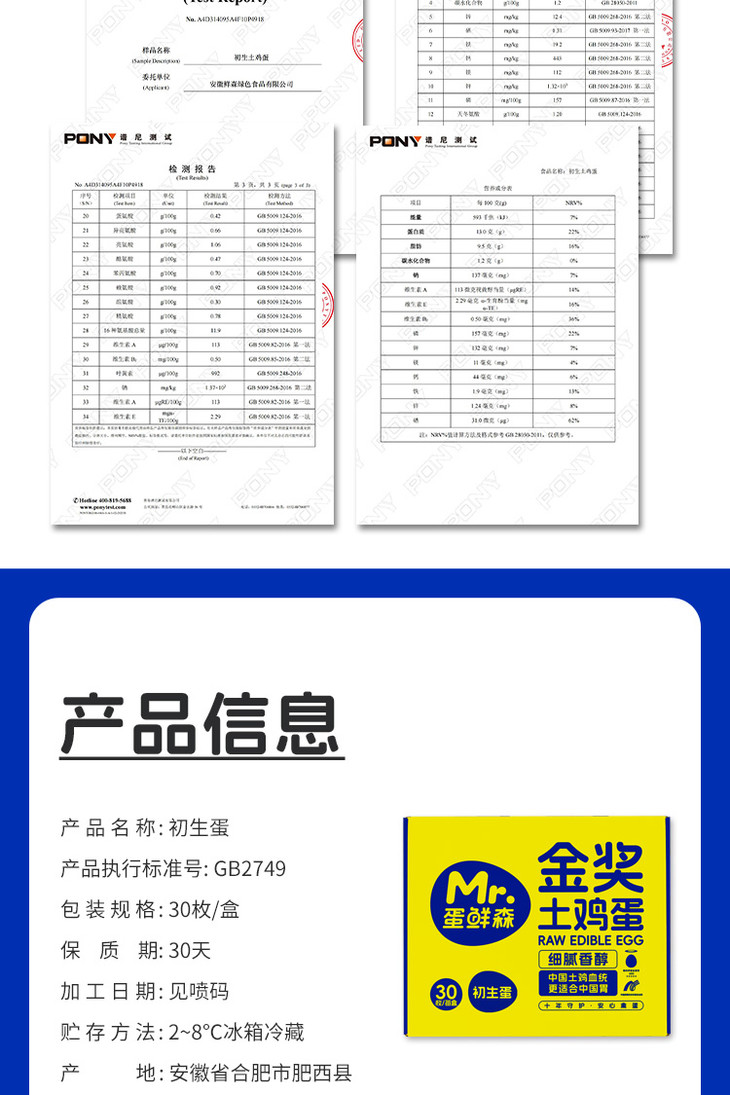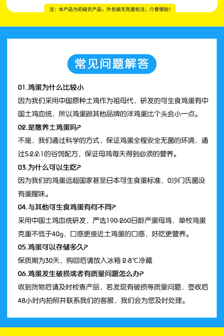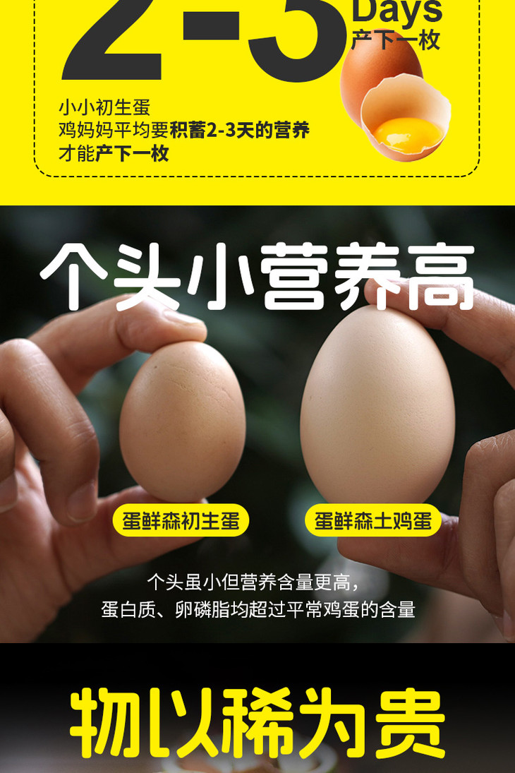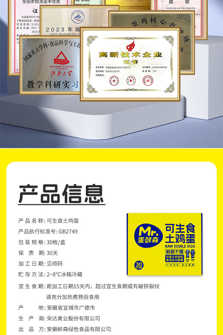 【品名】一年只卖一个月 限量2000盒 蛋鲜森金奖无抗初生蛋 蛋鲜森可生食土鸡蛋 顺丰/京东发 【规格】 土鸡蛋(可生食 1200g 30枚) 土鸡蛋礼袋装(可生食 1200g 30枚) 土鸡蛋(可生食 2400g 60枚) 初生蛋(不可生食 900g 30枚) 【产地】国内 【发货包装】独立包装盒 【发货地】安徽 【发货快递】顺丰、京东随机发 【不发货区域】新疆、西藏、海南、港澳台 【发货时效】48-72小时,周末节假日顺延 【温馨提示】土鸡蛋可生食;初生蛋不可生食,需全熟! 【售后说明】 1、该产品属于食品类,不支持无理由退换货; 2、产品已经发出的情况下,不可更改地址,拒绝任何形式的拒签,收到产品后当场验货; 3、如出现异常情况,请带面单+产品拍照+产品包装照片与我们联系,我们会第一时间处理,如产品有质量问题可在收货24小时之内,联系客服进行售后; 4、留错地址、电话等信息导致货物不能正常送达均不在售后范围内; 5、因快递暴力导致产品品相不好,不影响食用,不在售后范围内不作赔付! |
