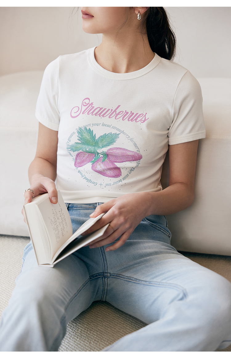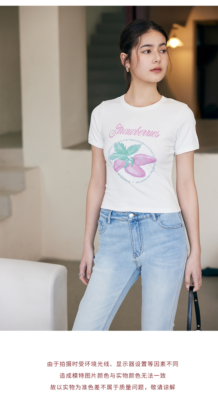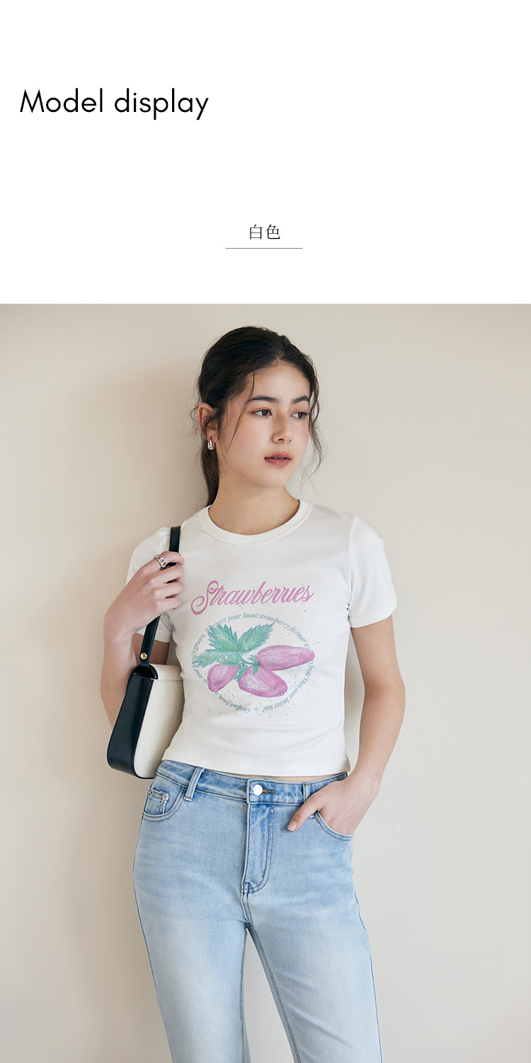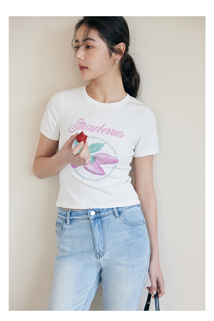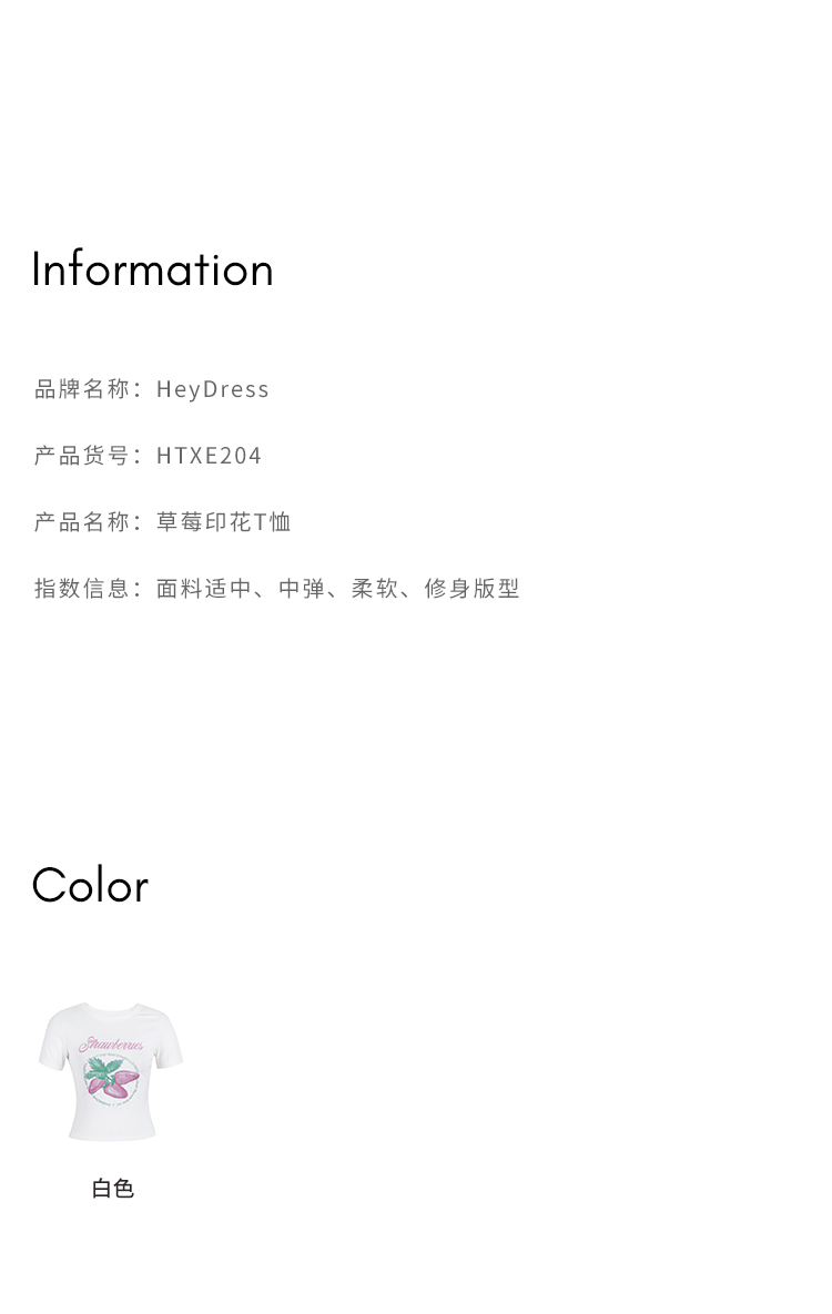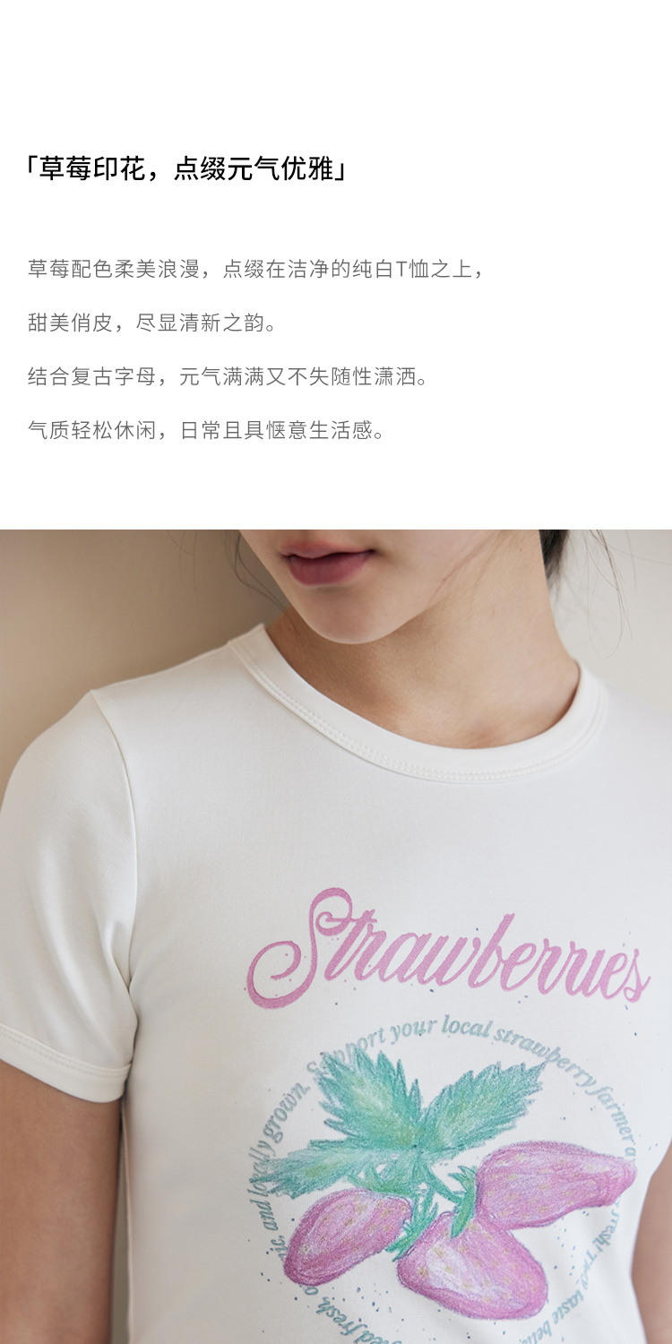 HeyDress草莓印花T恤女夏季圆领修身弹力半袖百搭辣妹短半袖上衣