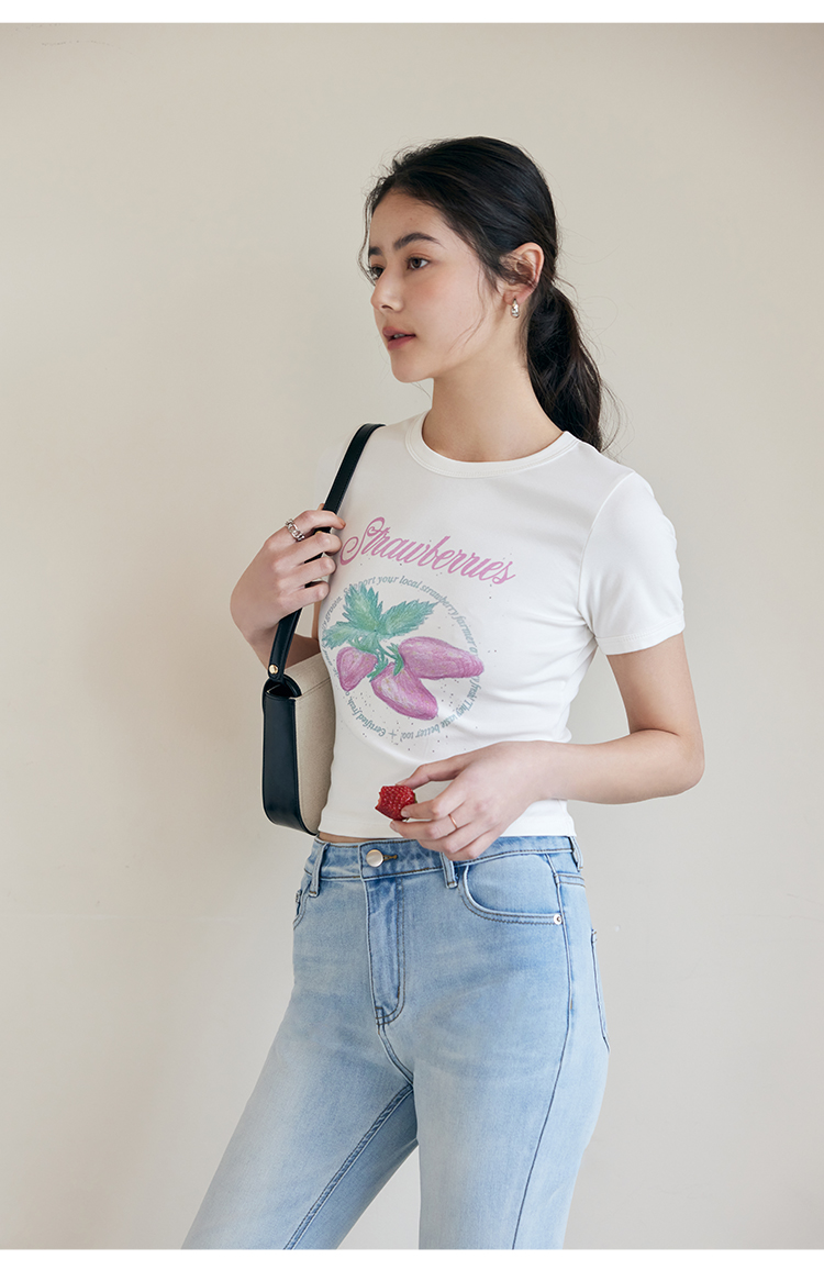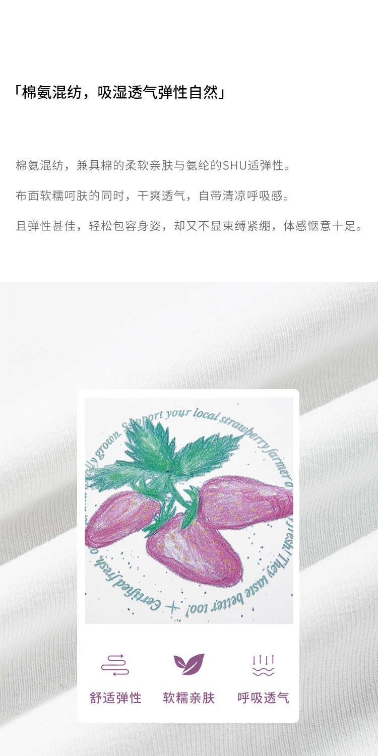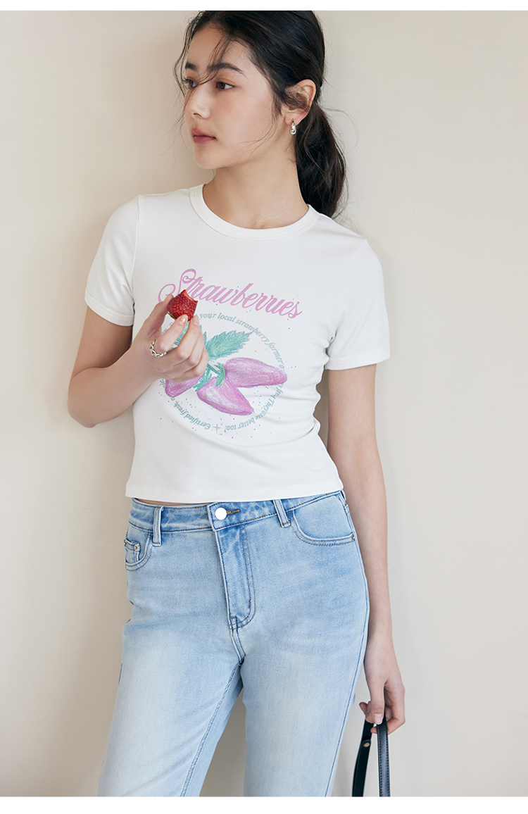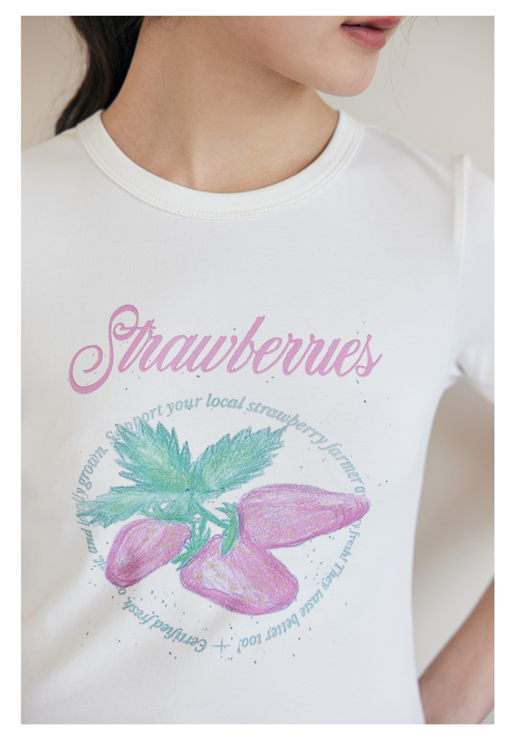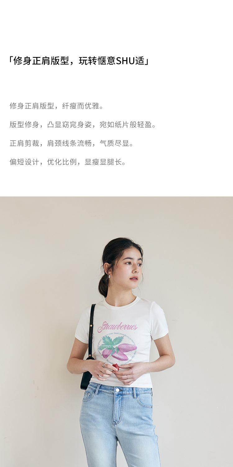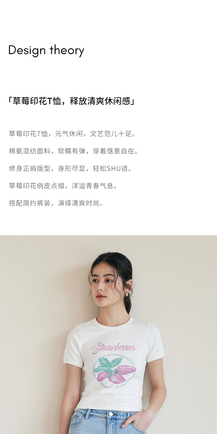 HeyDress草莓印花T恤女夏季圆领修身弹力半袖百搭辣妹短半袖上衣