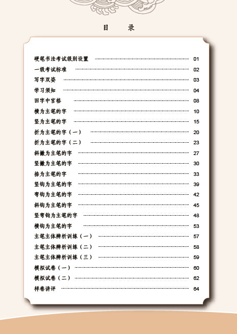 《硬笔书法实训指导 一级》根据教育部《中国书画等级考试大纲》编写,适用于中小学书法课堂教学及考级培训。本册为针对一级能力训练,包含了常用独体字。本套书主编杨忠德从事书法教育近二十年,为中国书画等级考试(东莞)主考官、东莞市中小学写字教育研究推广中心主任。其以多年的写字教育经验以及主考经验,独创田字中宫格专利以及主体主笔辨析法,让学习者更快掌握笔法运用和形状分析,同时帮助考生了解考试标准,轻松掌握考试题型,快速提高应试技巧。