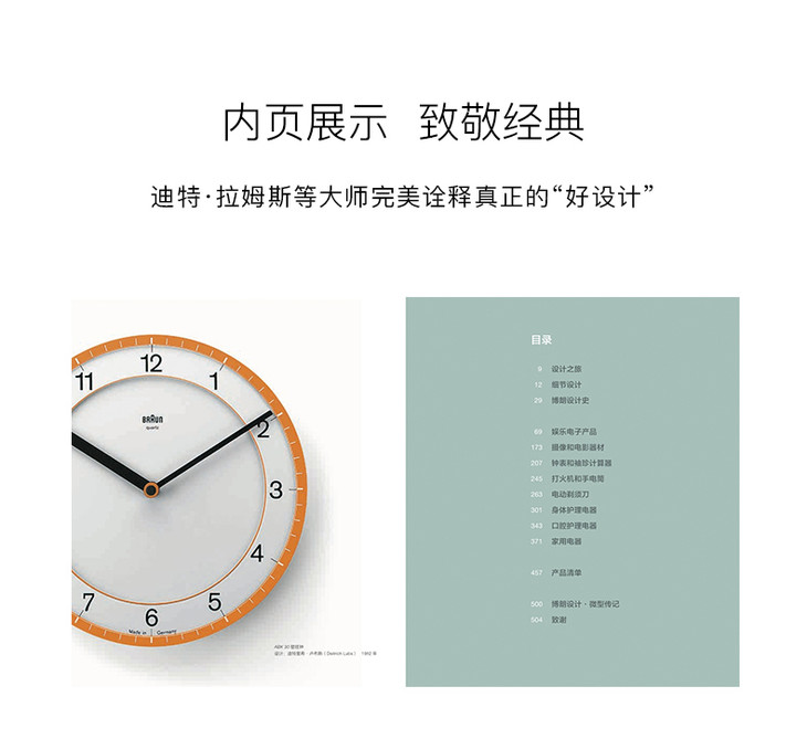 《博朗设计:卓越创新50年》包含以下几个部分:“细节设计”,用细致的特写镜头展现出博朗在历史上和现阶段最具代表性的产品。“博朗设计史”,列举了博朗历史上的主要人物,阐释了博朗设计背后的理念,回顾了从20世纪50年代至今博朗的设计哲学,以及博朗追求创新的历程。本书主体部分由对博朗8条“产品线”的呈现组成,同时针对每条产品线的开发历程进行了概括性介绍,并用精致的图片呈现了8产品线中的50款“里程碑产品”和485款经典产品,高清图片辅以简单的文字描述,清晰地勾勒出了博朗产品线的发展历程。