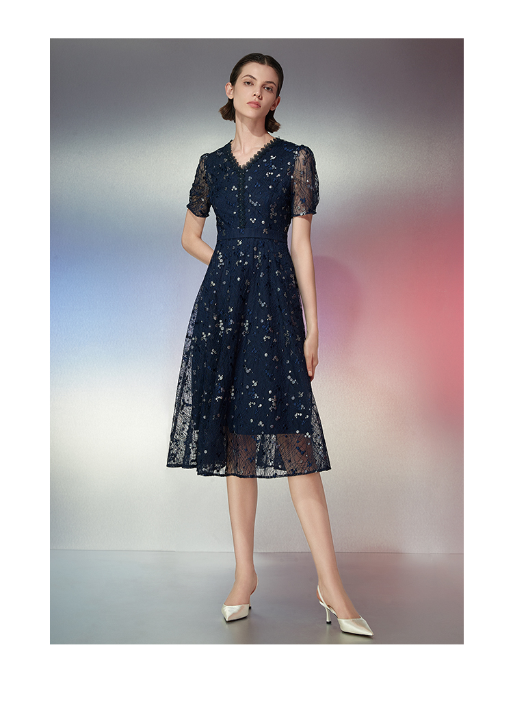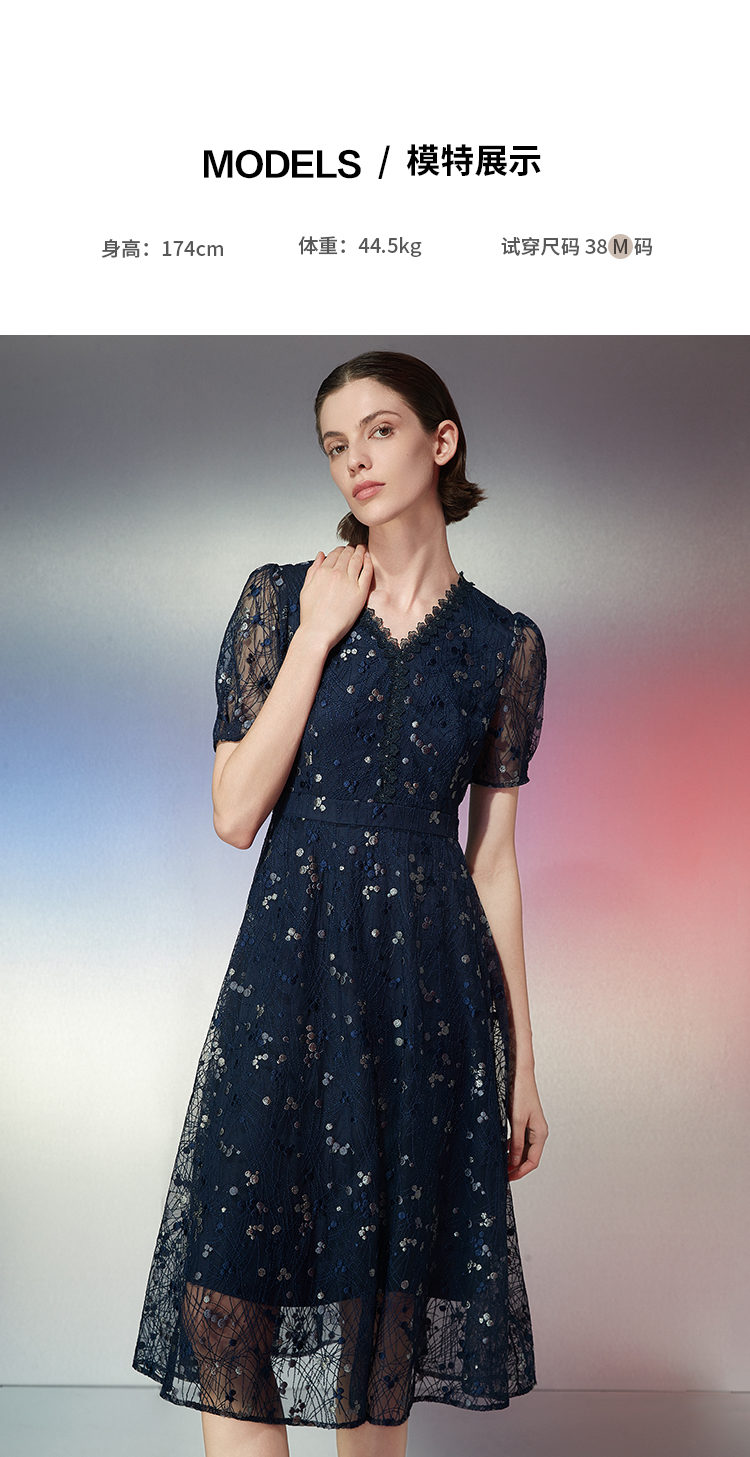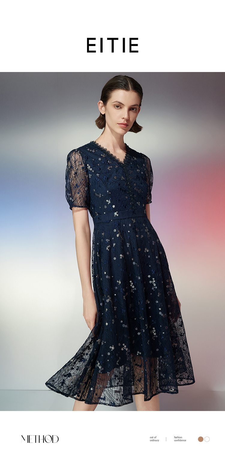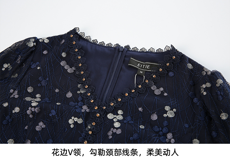 EITIE爱特爱夏季新款a字显瘦通勤气质V领优雅蕾丝连衣裙7807570