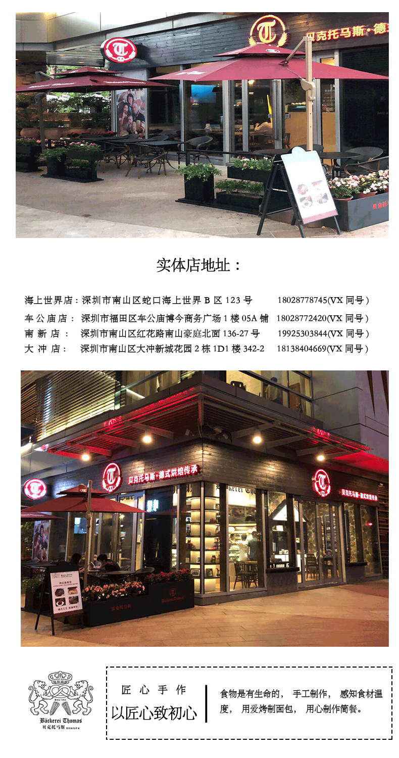 - 贝克托马斯于1904年成立于法兰克福;2012年传到深圳,现有5家实体门店;德国大师坚持以德国传统配方和工艺手工新鲜制作,健康,天然,无添加,用真心烘焙!贝克托马斯一有历史有故事真材实料值得信赖!