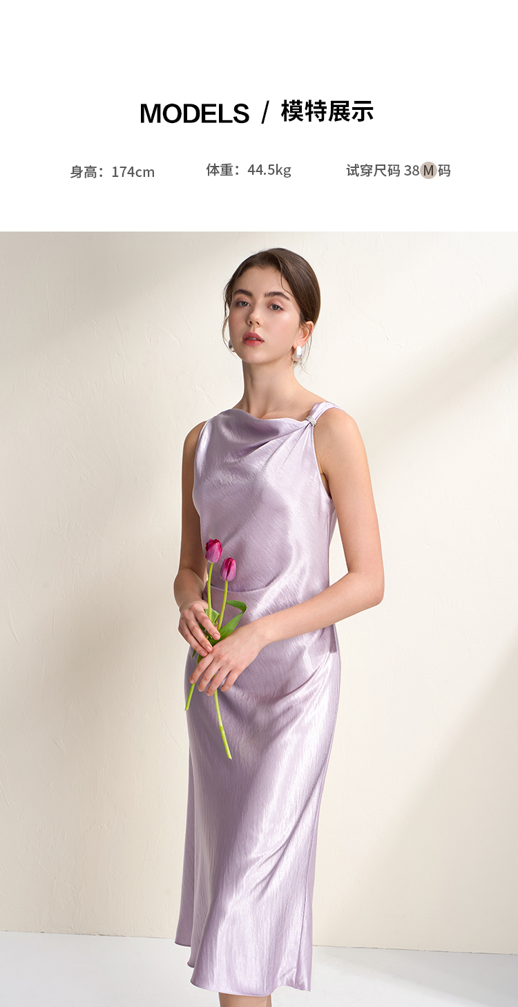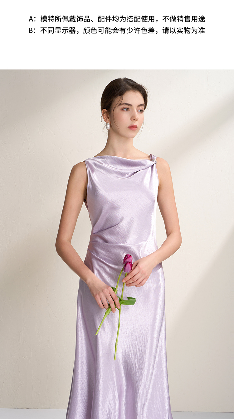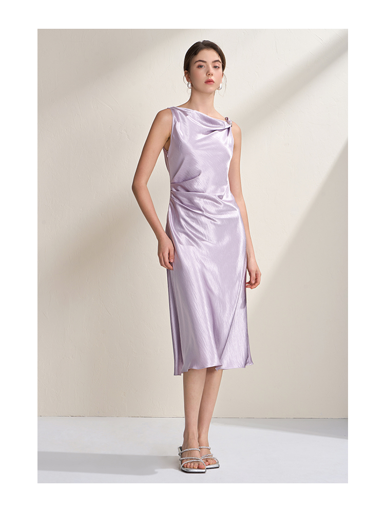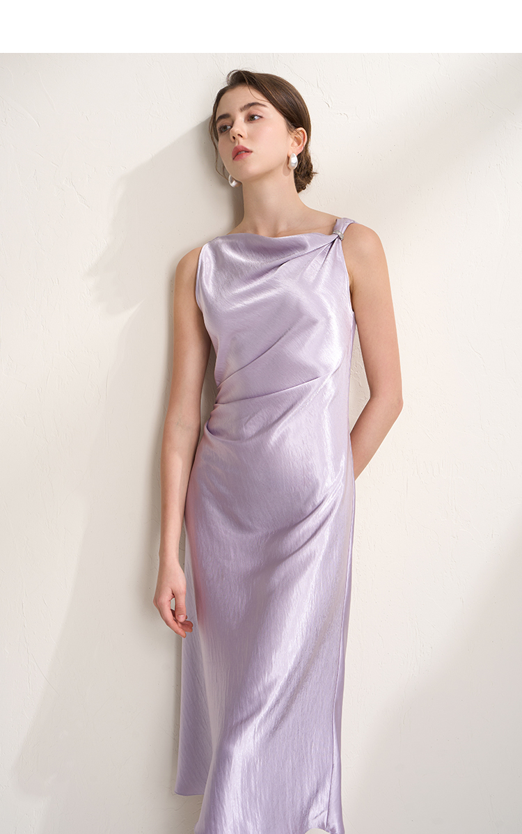EITIE爱特爱法式荡领紫色吊带缎面提褶显瘦连衣裙礼服2026夏新款B2607248