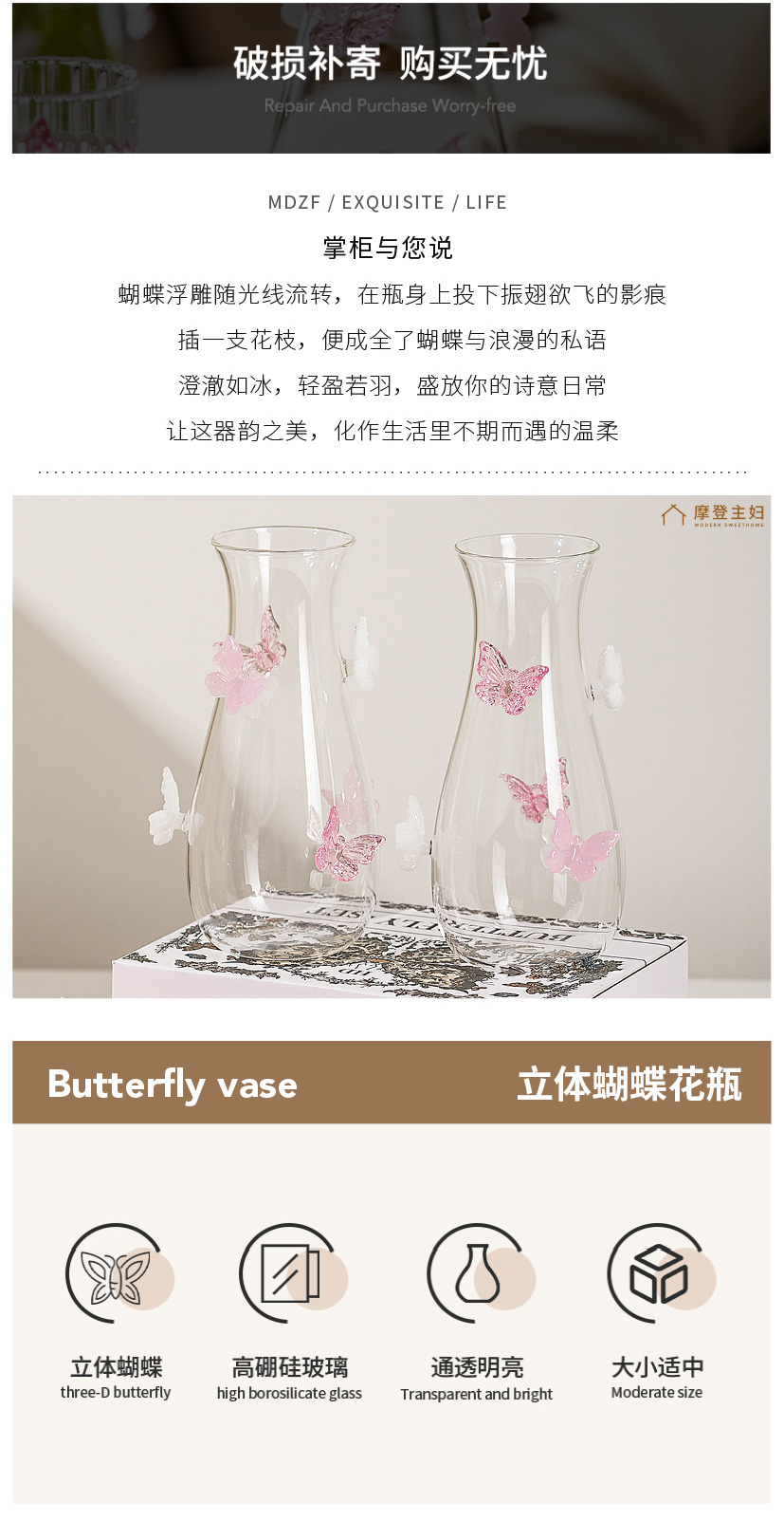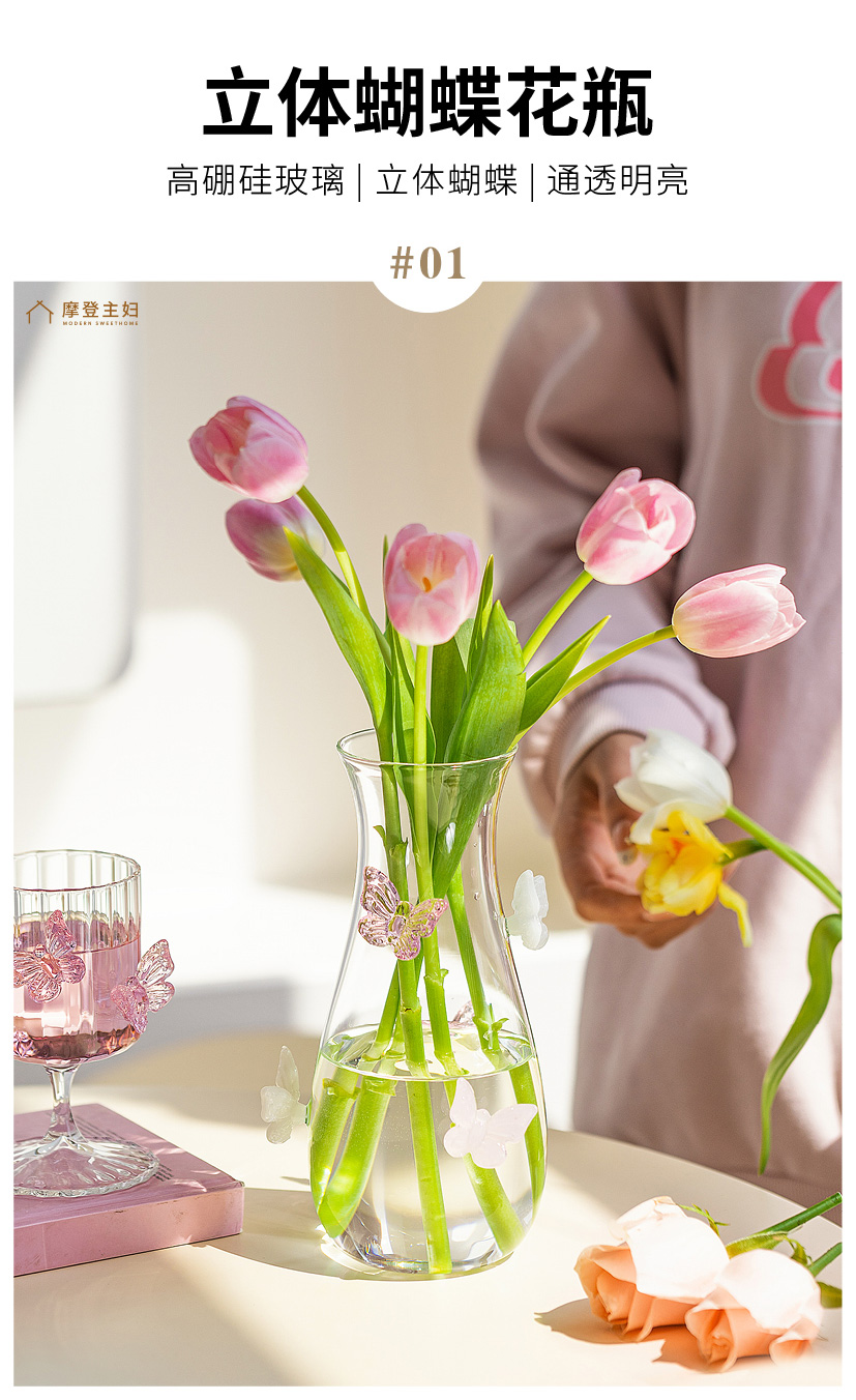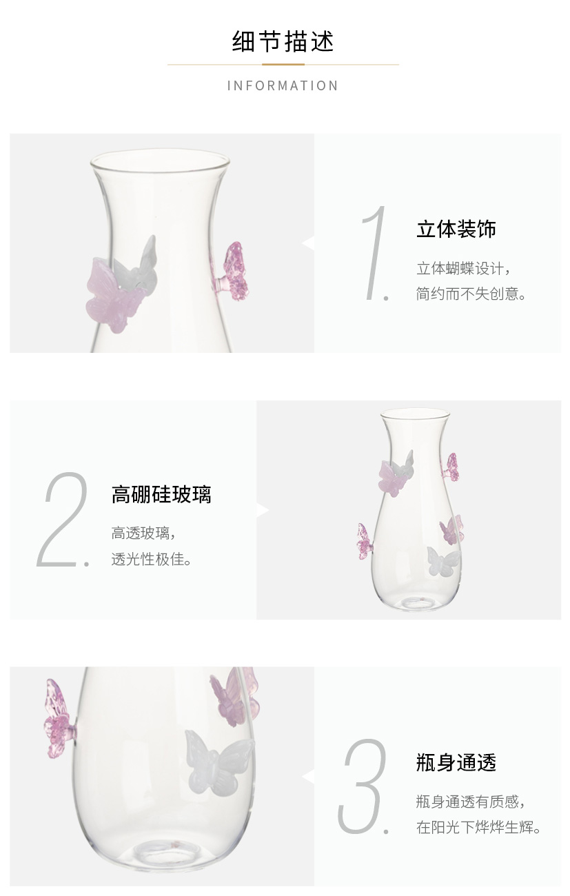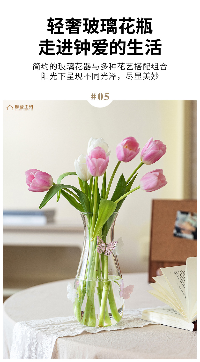 摩登主妇蝴蝶玻璃花瓶摆件客厅水养插花轻奢高级创意小众透明花瓶