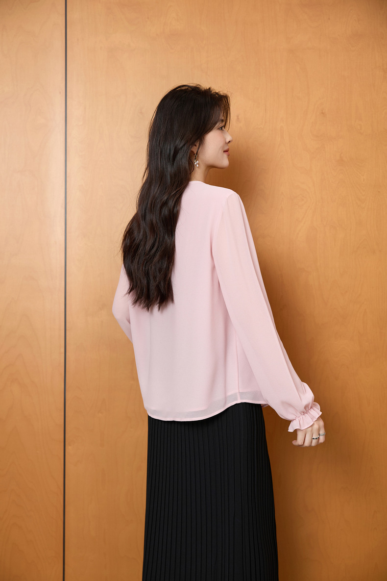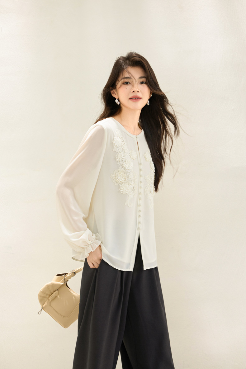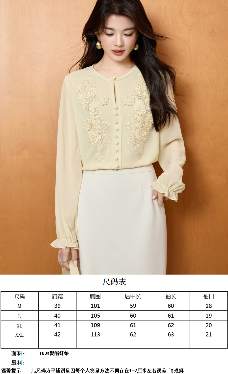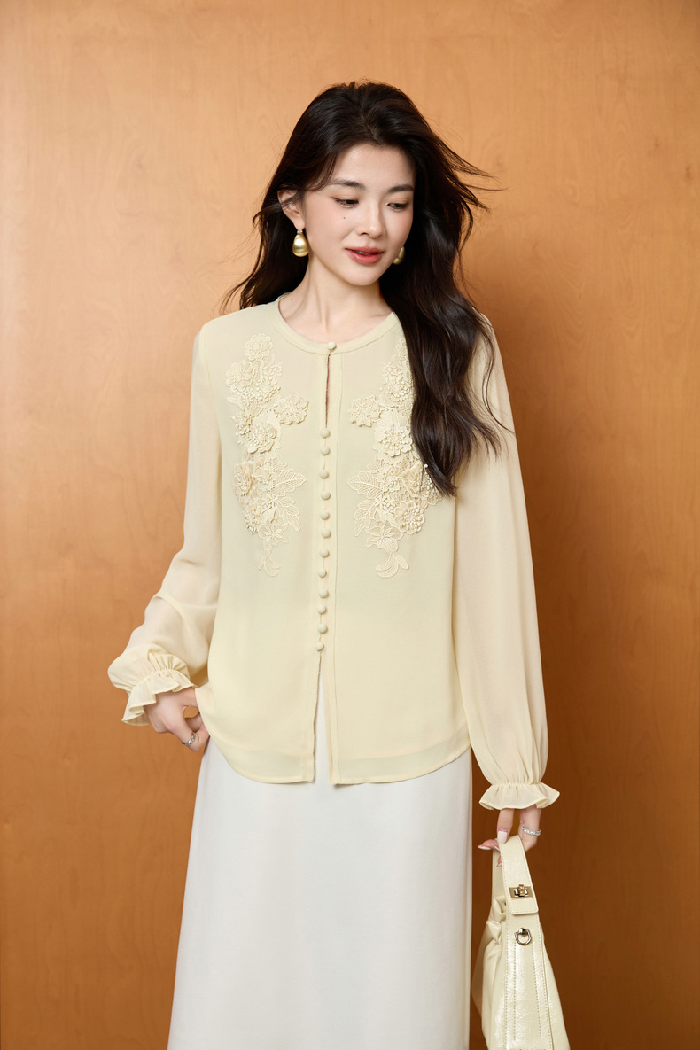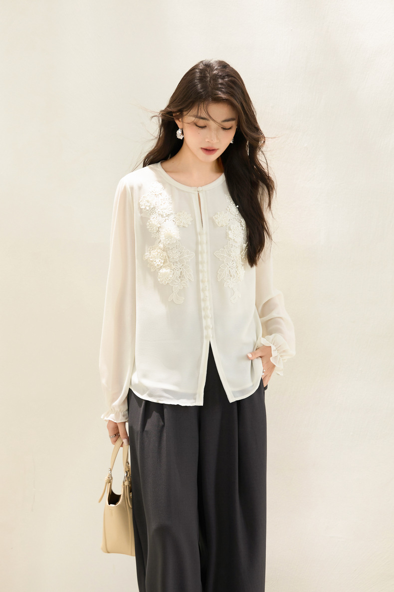 「自」全新升级【铂金会员201/天猫269/差价68】(51116)洛诗琳法式圆领钉珠雪纺衫2025秋季洋气优雅通勤雪纺衬衫女