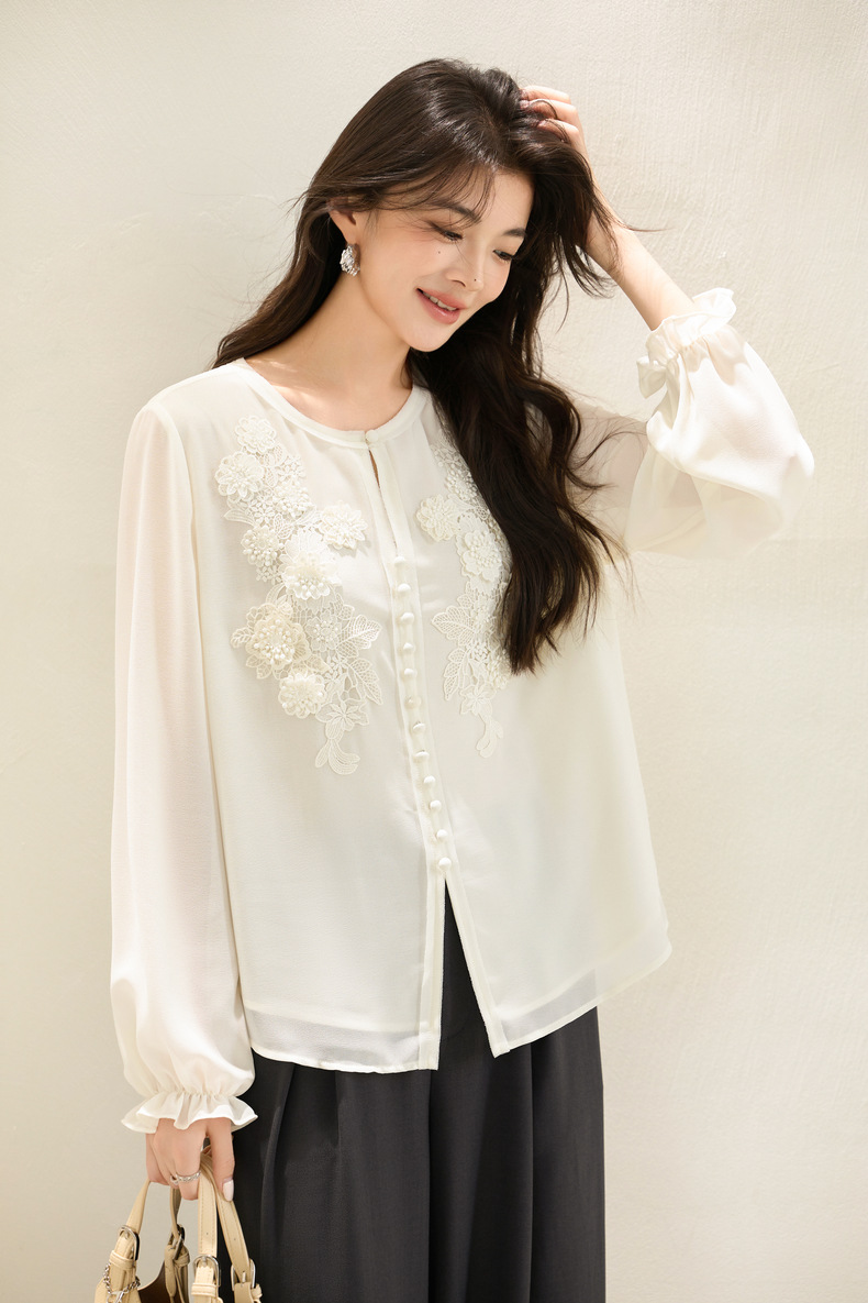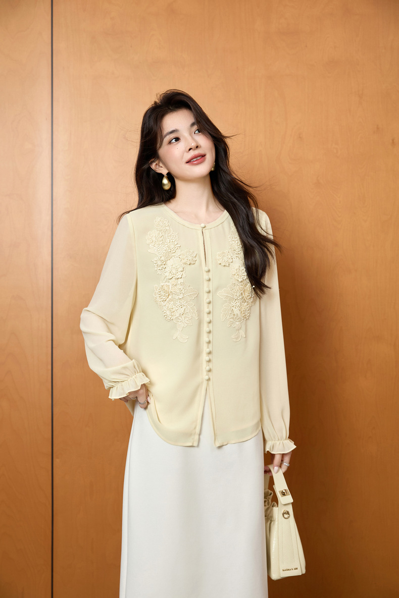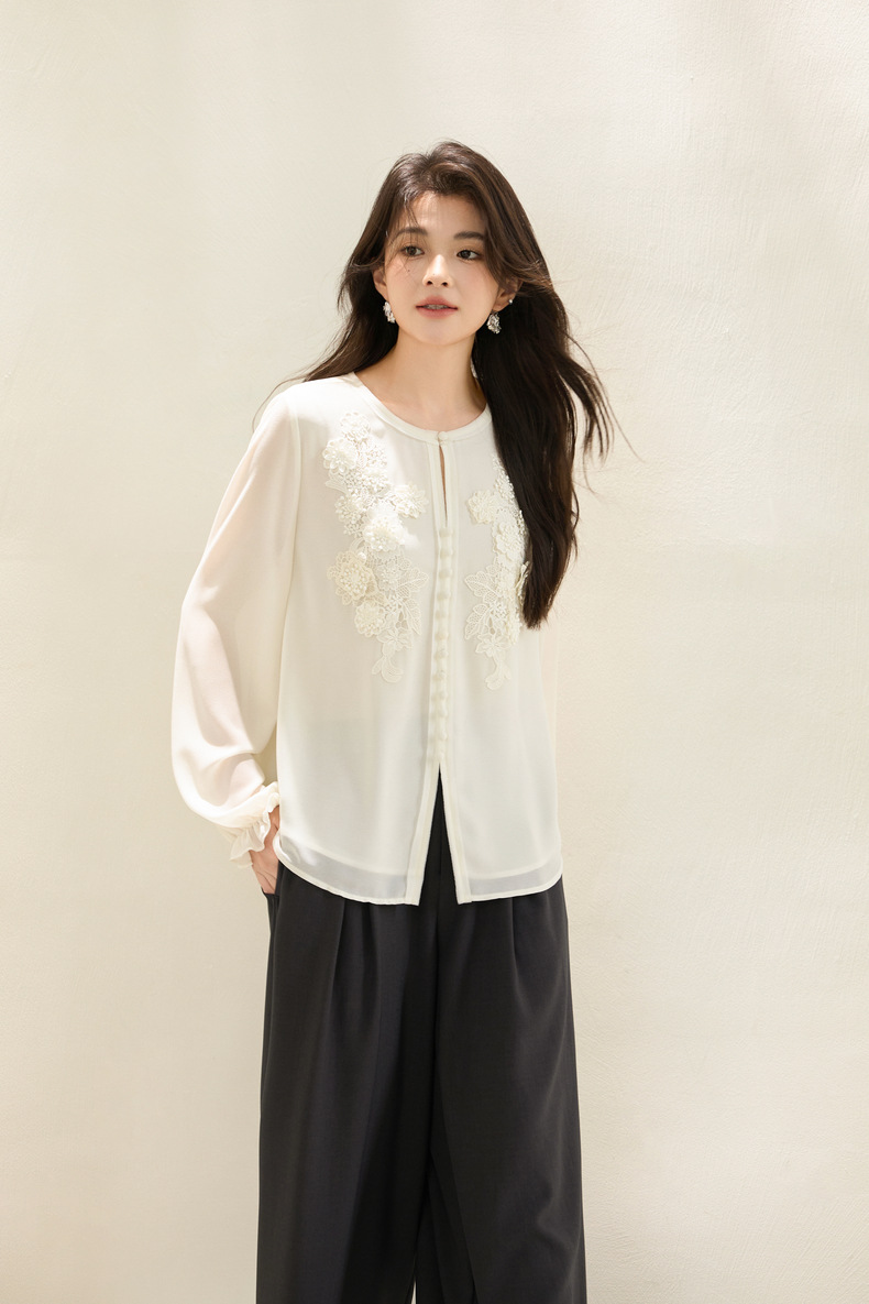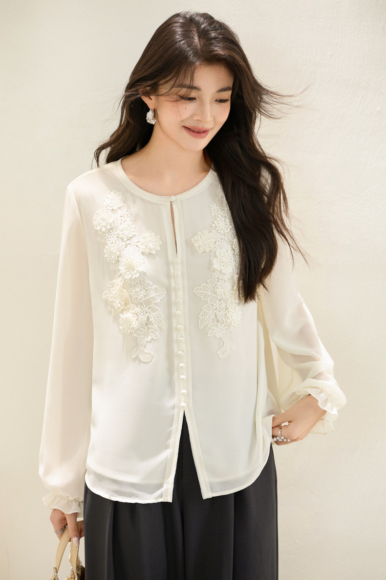 「自」全新升级【铂金会员201/天猫269/差价68】(51116)洛诗琳法式圆领钉珠雪纺衫2025秋季洋气优雅通勤雪纺衬衫女