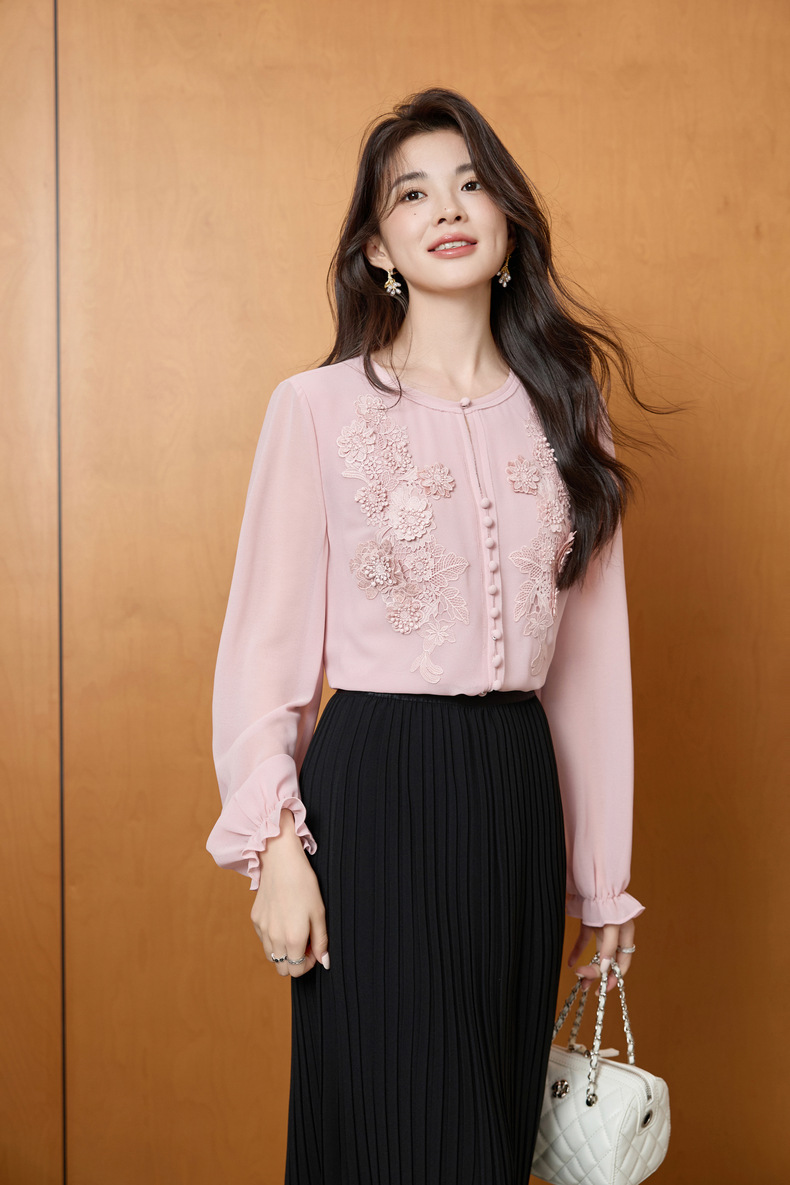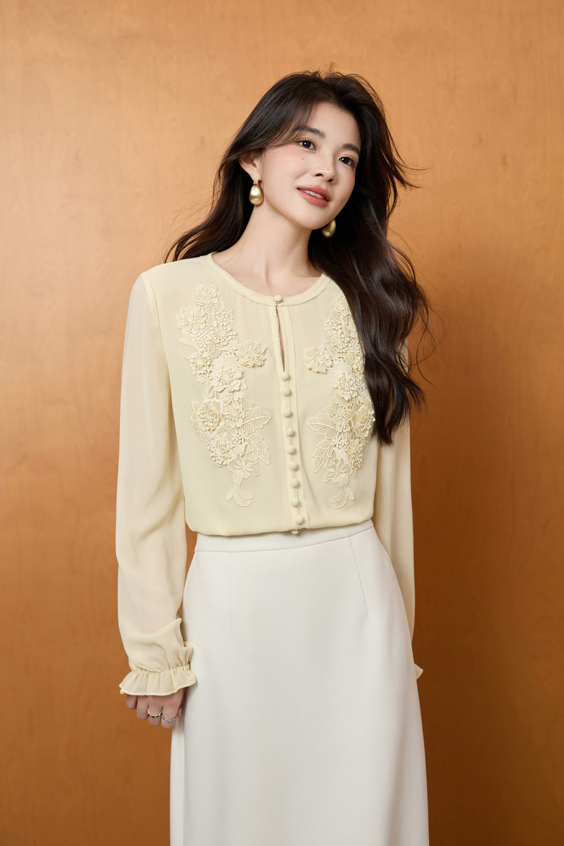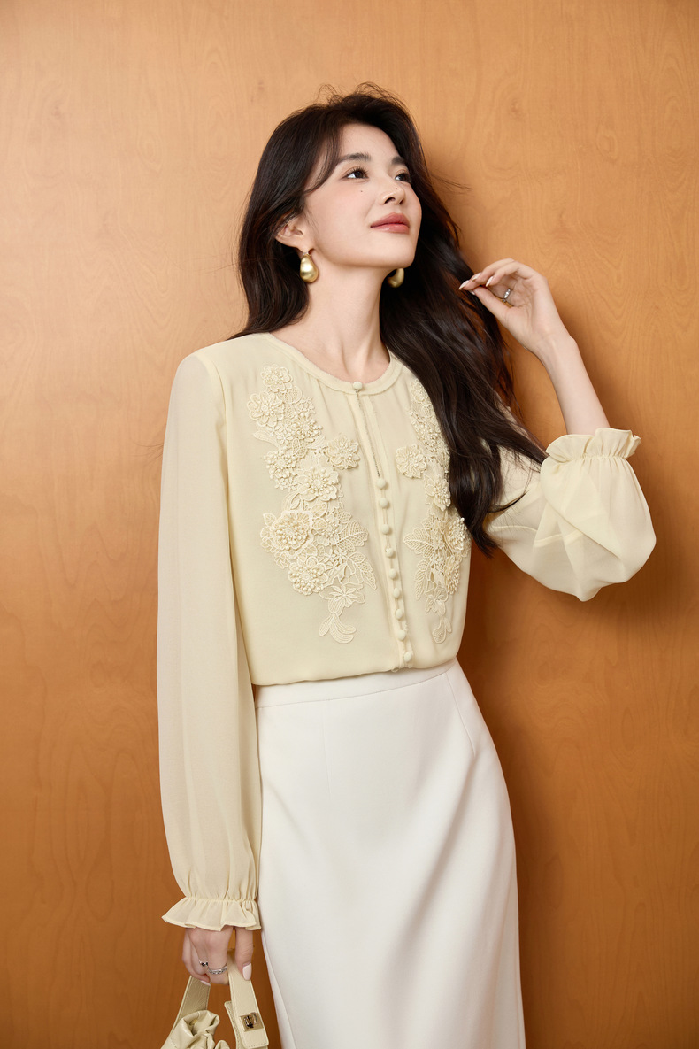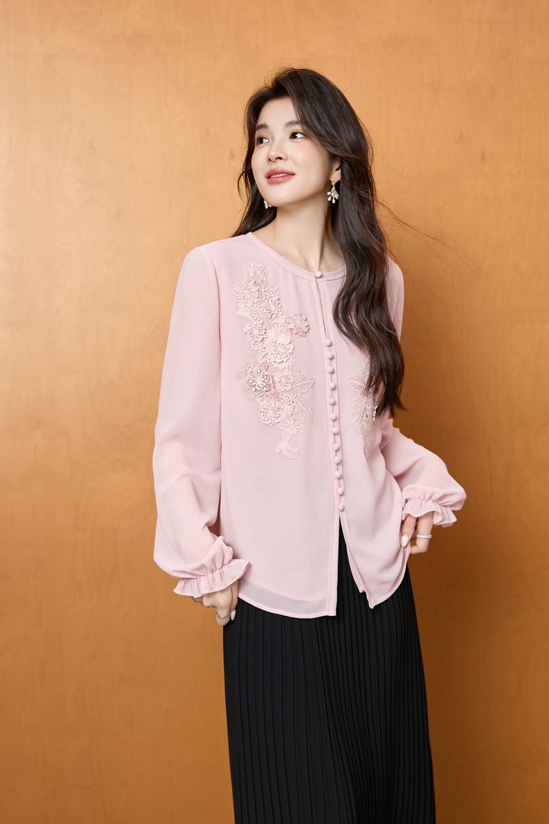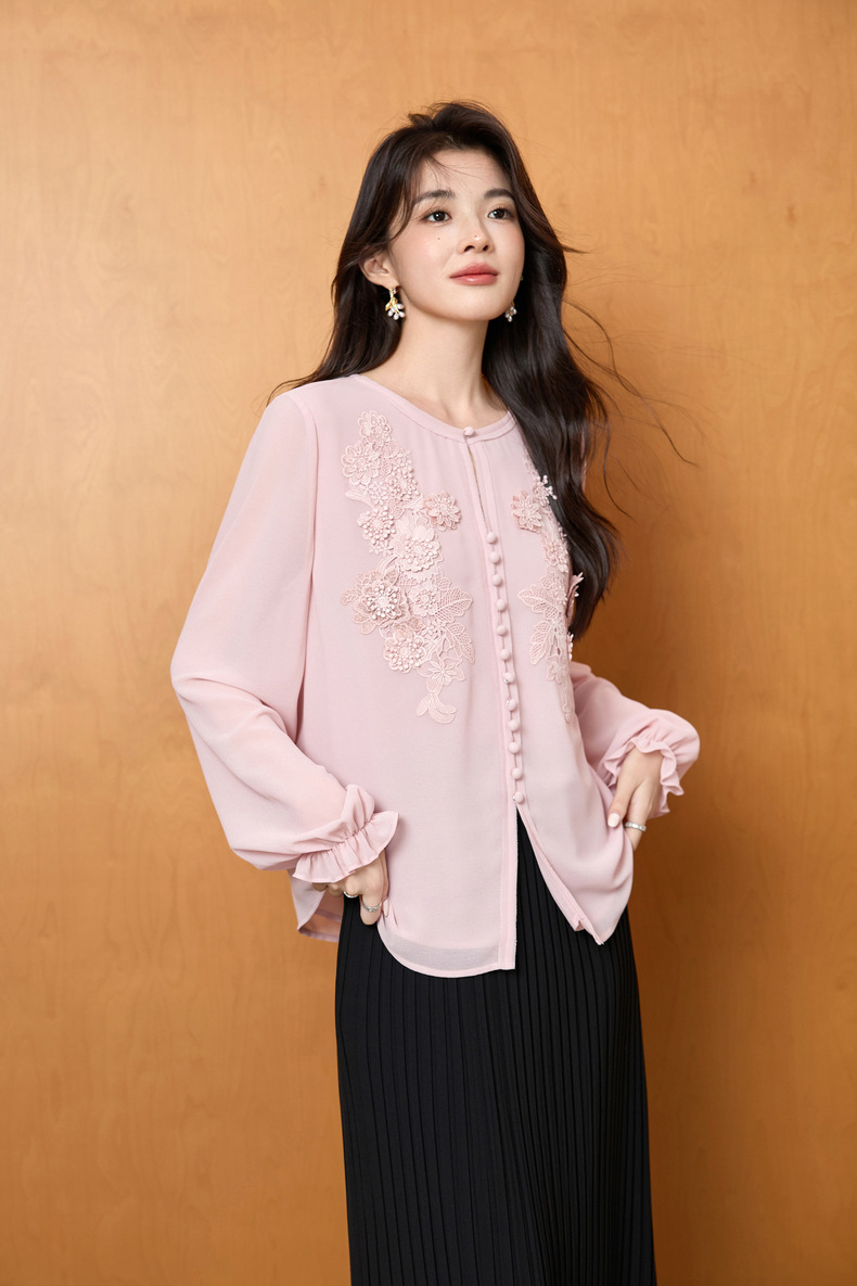「自」全新升级【铂金会员201/天猫269/差价68】(51116)洛诗琳法式圆领钉珠雪纺衫2025秋季洋气优雅通勤雪纺衬衫女