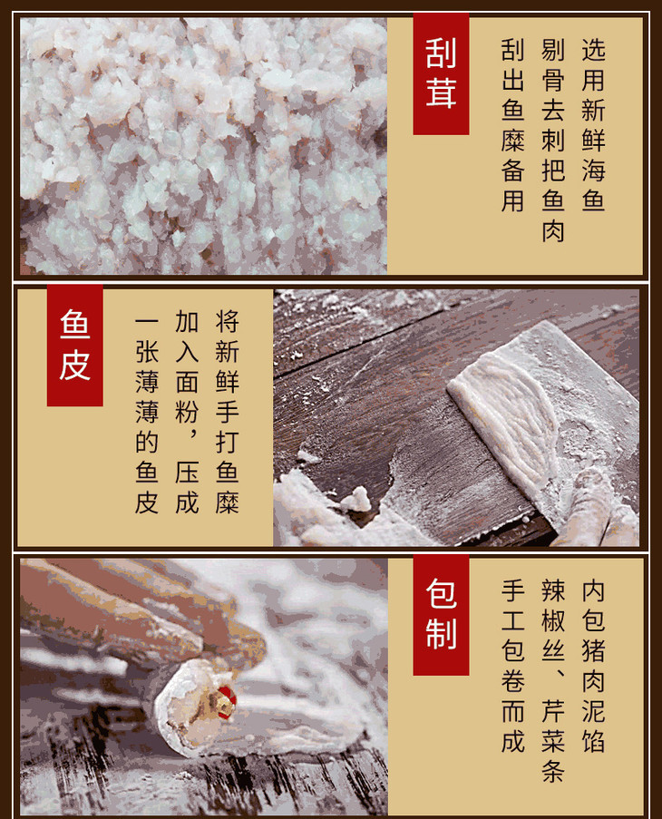 品名:潮汕鱼皮饺@鱼册 规格1:鱼皮饺16个250g/盒*6盒(配料3包沙茶+3包辣椒+3包蒜蓉酥) 规格2:鱼册9个250g/盒*6盒(配料3包沙茶+3包辣椒+3包蒜蓉酥) 规格3:250g/盒*3盒组合(鱼皮饺*3+鱼册*3;配料3包沙茶+3包辣椒+3包蒜蓉酥);拍几份发几个包裹,不一定能同时到达,请耐心等待; 发货地/产地:广东潮州 包装方式:泡沫箱+冰袋+盒装 物流信息:默认顺丰/京东冷链,不支持指定快递 发货区域:新疆、西藏、内蒙、宁夏、甘肃、青海不发; 物流详情:周六、周日及节假日除外,正常48小时内发货,到货时间约为2~5天,请耐心等待 售后说明:收到货后有质量问题,在24小时内都可以拍照(坏品+快递单面箱子一起拍)上传,申请按坏品比例理赔或联系客服,生鲜性质特殊,不支持7天无理由退换货;因地址错误,手机号联系不上,拒收等造成的损失无法售后,请理解; 温馨提示:由于制作工艺问题,鱼肉间的软骨会出现轻微碎裂,导致鱼皮饺鱼册出现部分骨碎和小刺,这种情况在制作过程中无法避免,属于正常现象,并非质量问题,不影响食用,介意者慎拍;收到货有时冰袋融化属于正常现象,并不代表产品变质,介意者慎拍; |