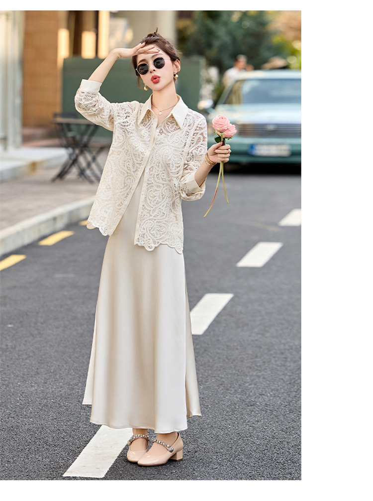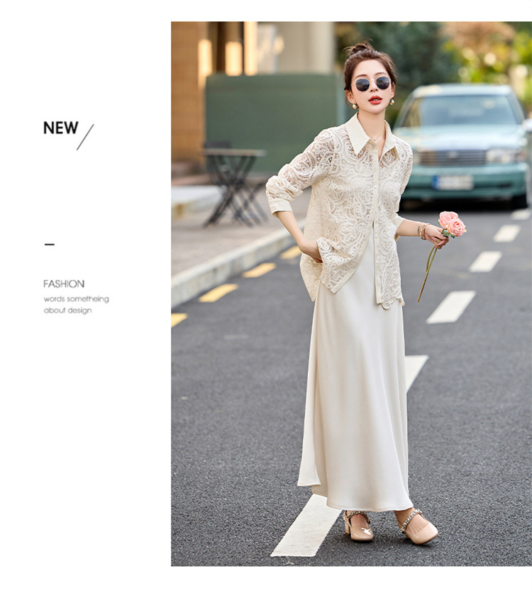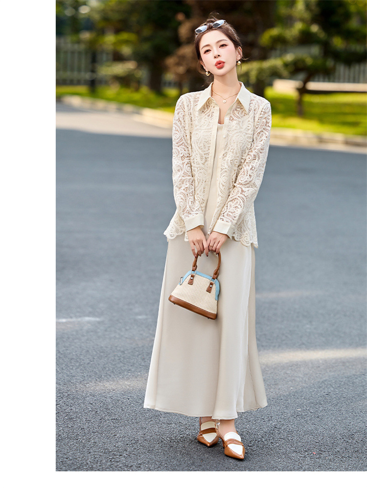HR CPYY8122蕾丝镂空衬衫吊带连衣裙两件套遮肉显瘦时尚套装裙 商品图0