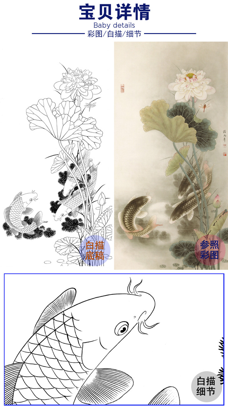 竖幅工笔花鸟白描底稿-路雨年-荷花鲤鱼-A007