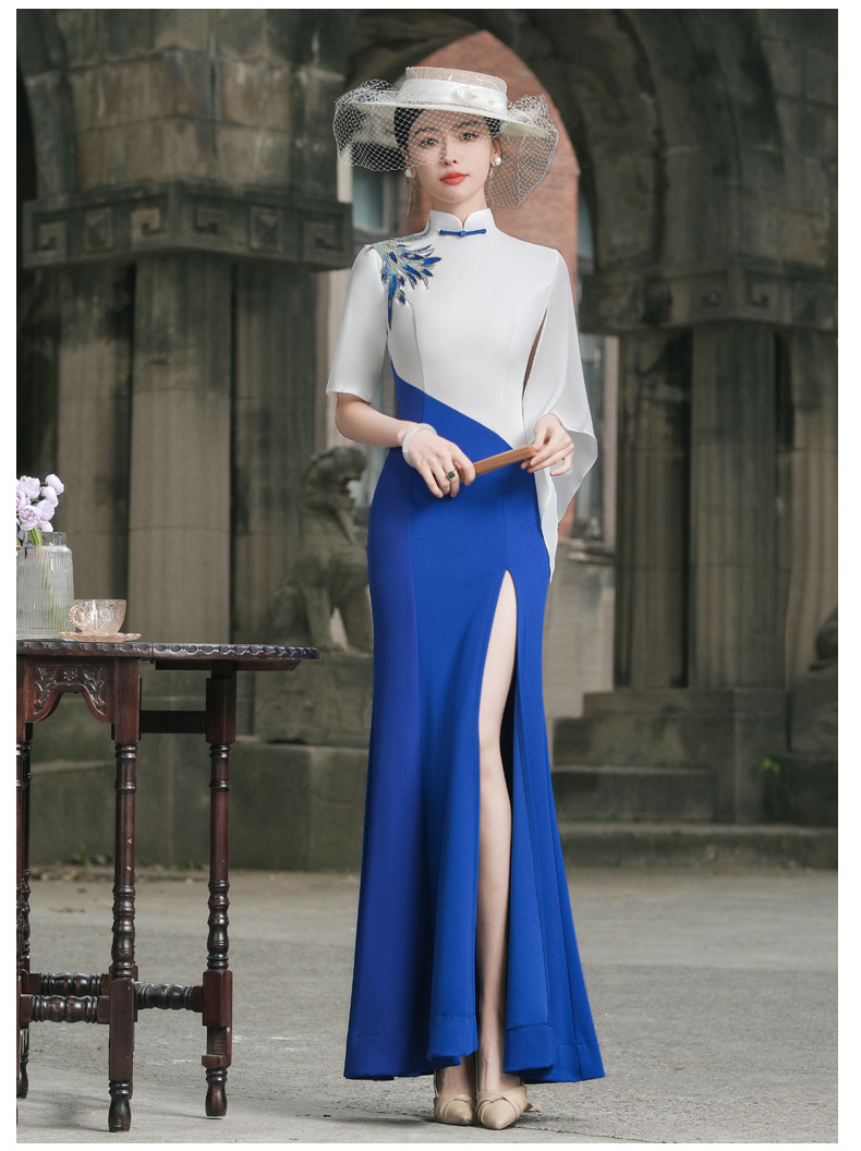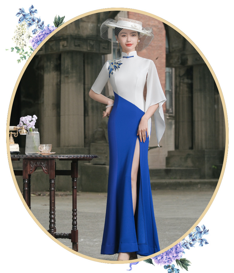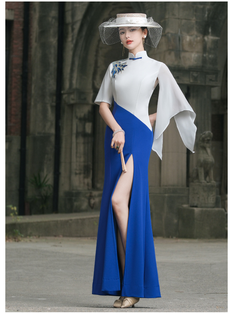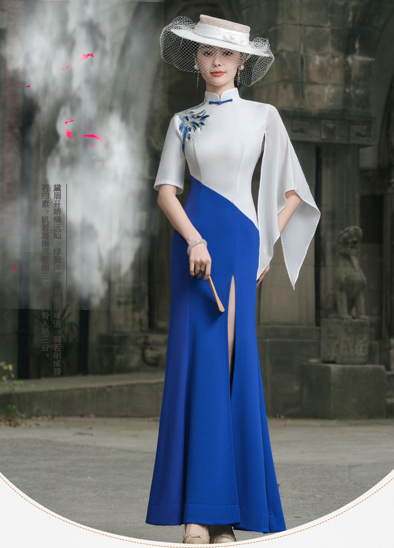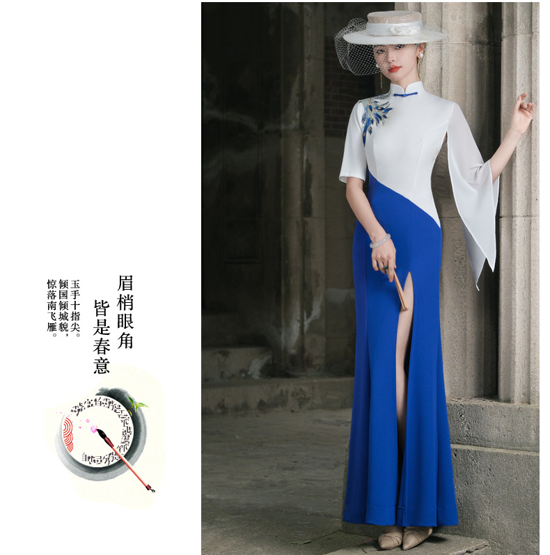 新款撞色拼接复古高端时尚改良走秀礼服演出服加长款年轻款旗袍