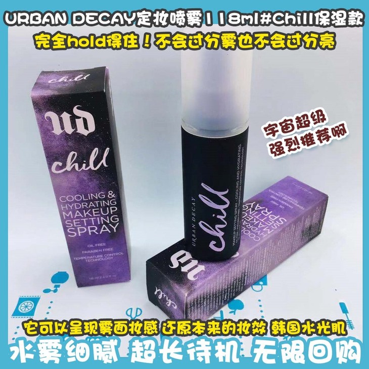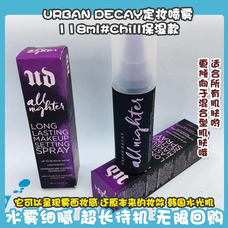 URBAN DECAY定妆喷雾118ml#Chill保湿款/#All Nighter持久款👍宇宙超级强烈推荐啊❗❗❗它可以呈现雾面妆感🌬,还原本来的妆效,韩国水光肌✨完全hold得住😋!不会过分雾也不会过分亮🌟,保湿效果也是ok滴💦,水雾细腻,超长待机🕒。无限回购🤗!🖤#Chill保湿款适合中性或干性肤质的小姐姐。🖤#All Nighter适合所有肌肤哟,更倾向于混合型肌肤哦。⚠使用前摇匀,再上完底妆后使用。距离脸部15-20cm处对面部喷2-4次😁,然后等待成膜就好啦~