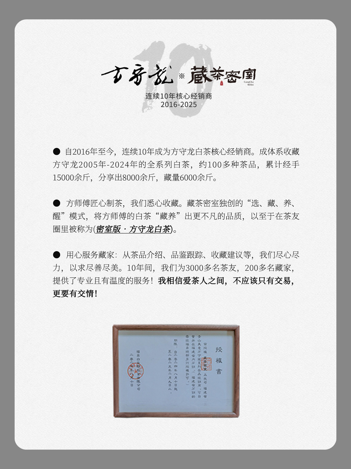 - 2021年,嘉木会创办了“藏茶密室”,开启了全新的藏茶模式,秉持“不将就,不迎合”的理念,通过“选、藏、养、醒”的方式,再度诠释藏茶的深意,沉醉杯汤,苦乐自知,茗透于心,迷之不悔!