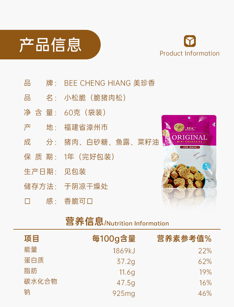 【2025.9.21库存清仓 介意慎拍】美珍香 原味小松脆(脆猪肉松)60g(随机发30g*2或60g*1包)