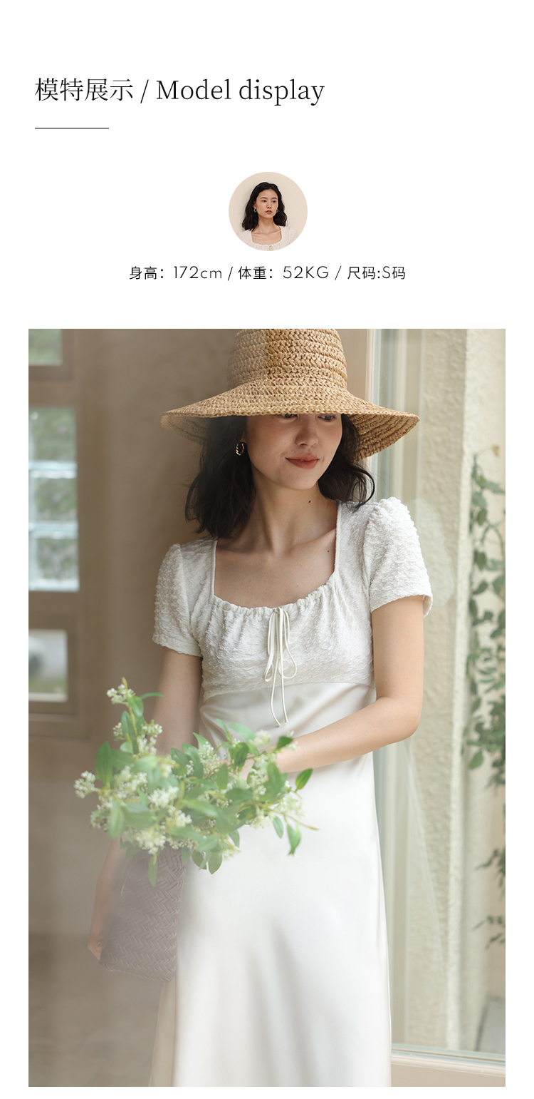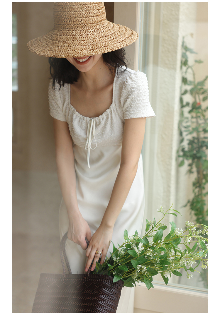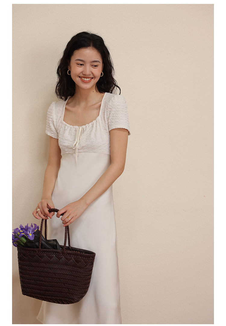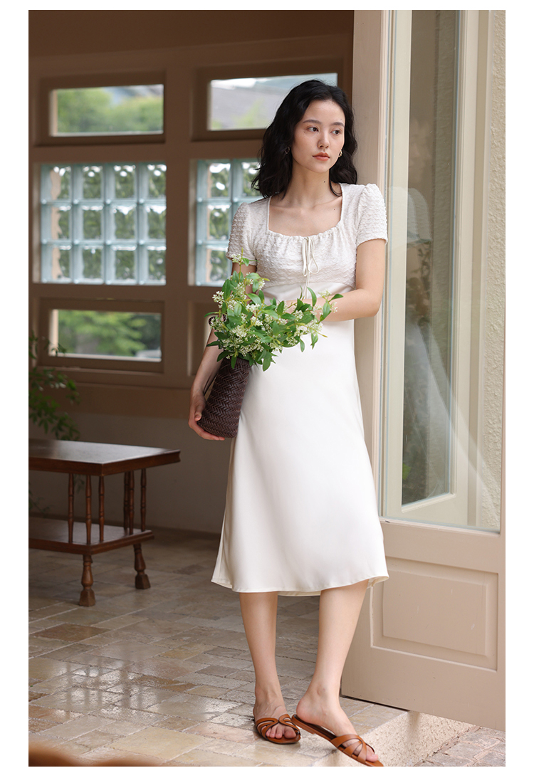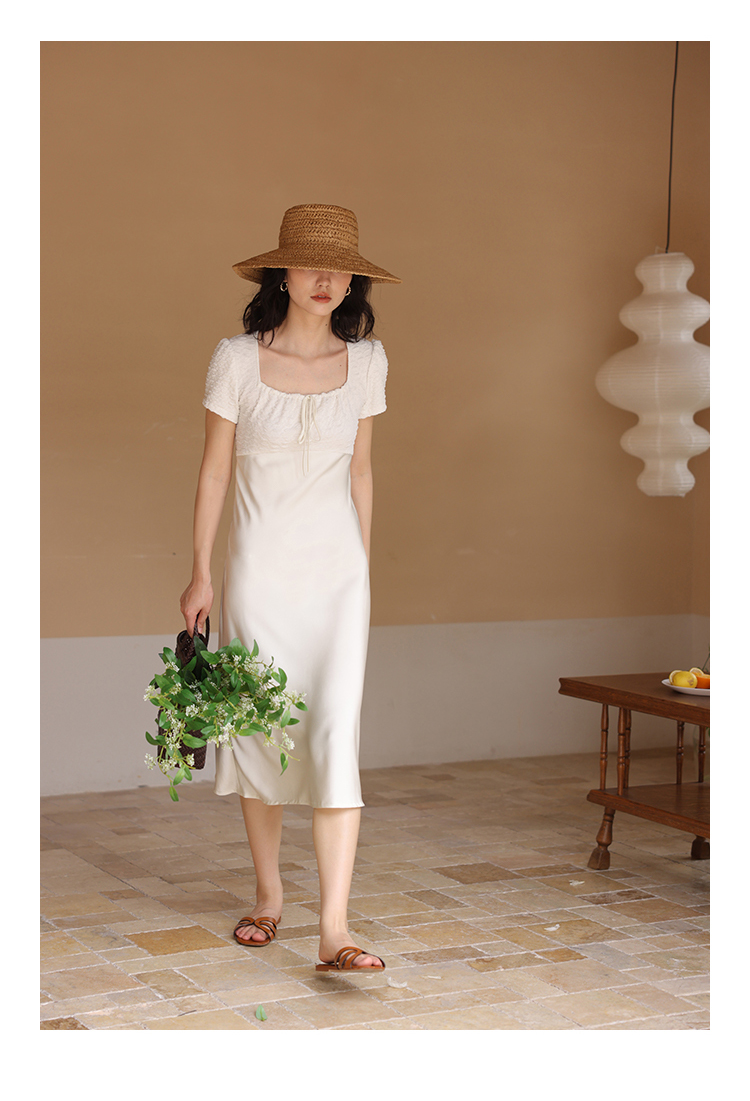 HeyDress方领连衣裙女夏季拼接设计感缎面白色气质小众裙子
