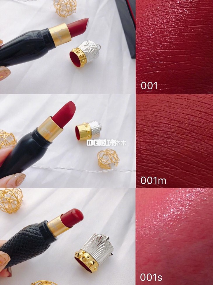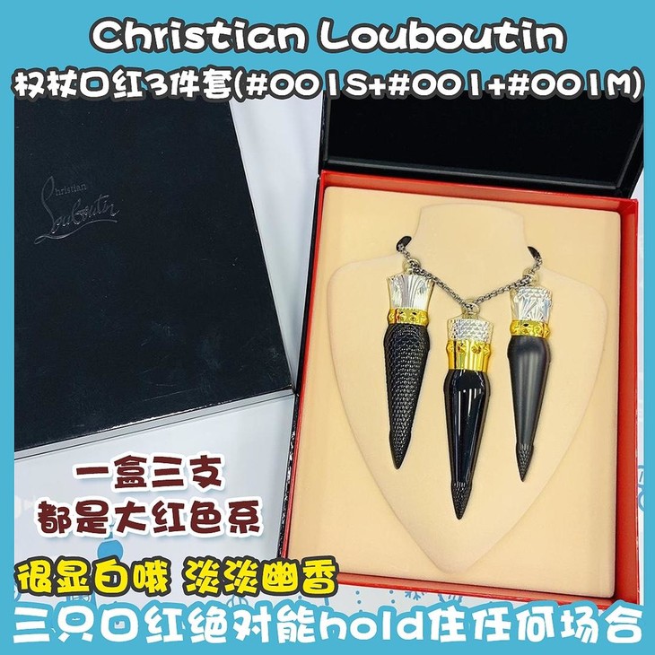 Christian Louboutin 权杖口红3件套(#001S+#001+#001M)👍没有女生能拒绝的萝卜丁😍,作为礼物绝对是高配了👑!一盒三支,都是大红色系~❤#001S水润质地💦,刚上嘴粉粉的,过一会就变得草莓红🍓一样的颜色,非常显气色哦 ❤#001丝滑持久,继承CL一贯显色度极高的优点😇,薄涂厚涂都ok👏,遮盖唇纹也是炒鸡棒的!❤#001M哑光丝绒质地,非常漂亮的复古红💃,薄涂很洋气,厚涂气场upup~总的来说这三只口红绝对能hold住任何场合👠,不管是去约会,还是出席宴会,又或者是日常出行,完完全全可以满足你!并且这样的颜值就没有女孩子可以抗拒❗❗