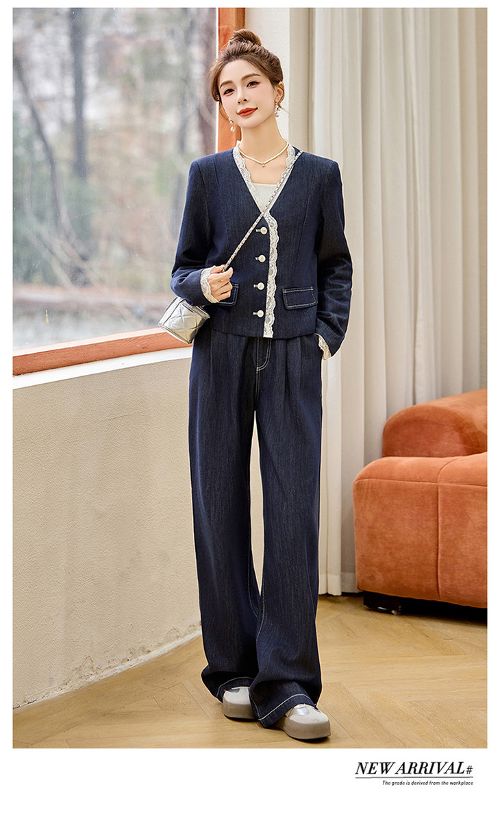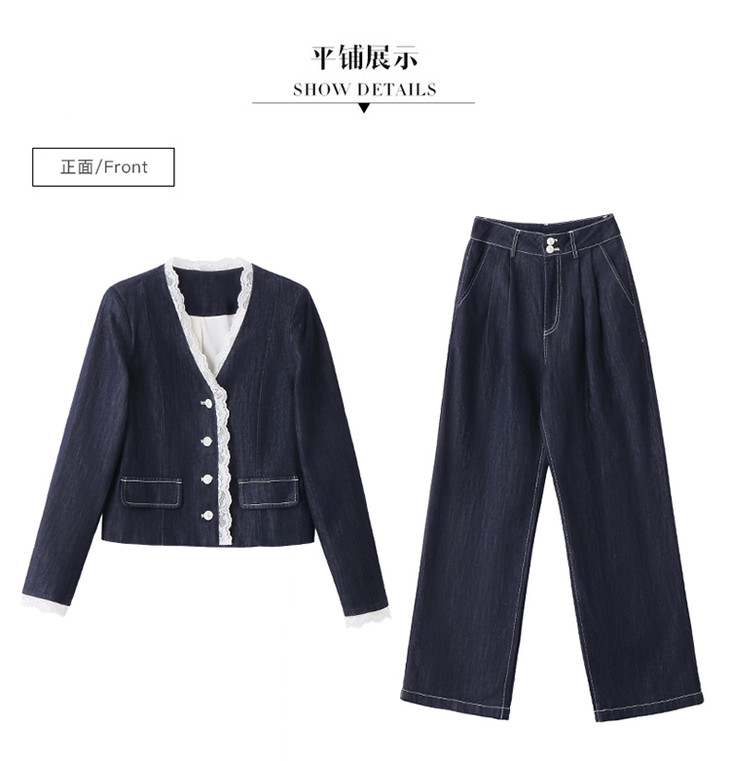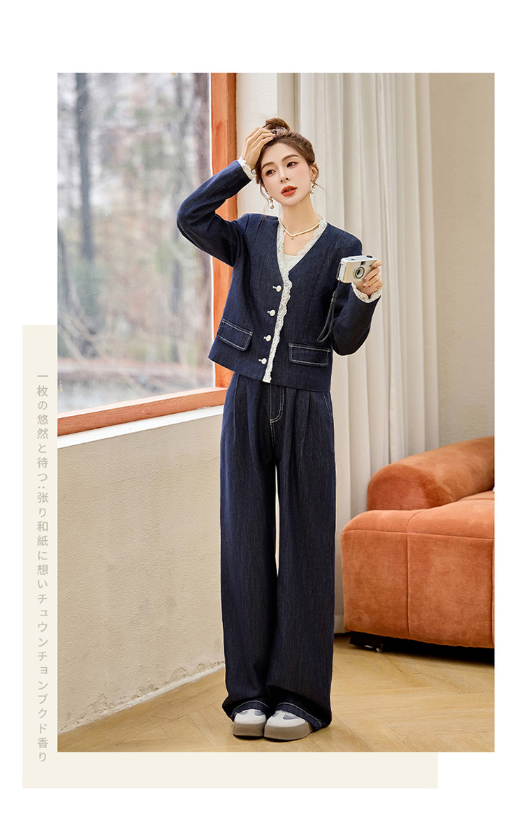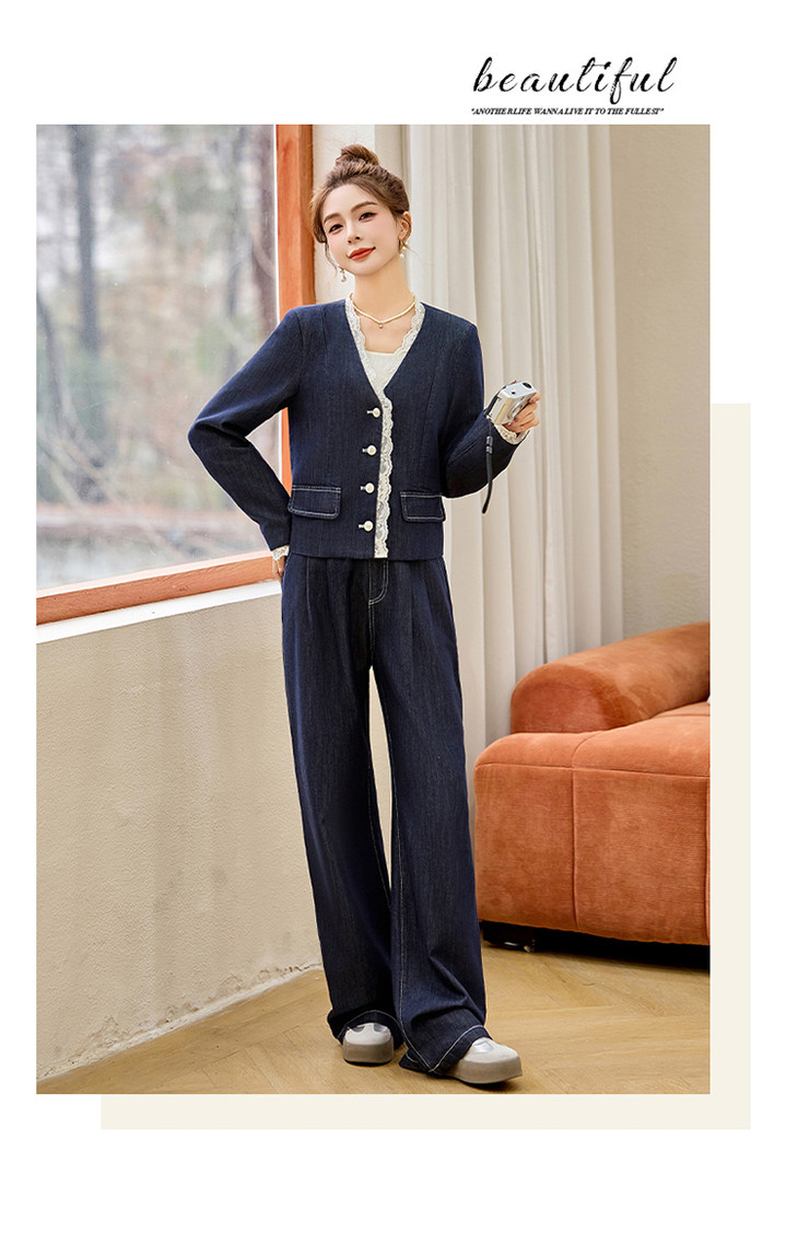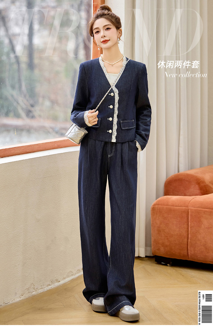 小香风时尚V领蕾丝边牛仔套装,显瘦洋气阔腿裤两件套HR-YQH2650