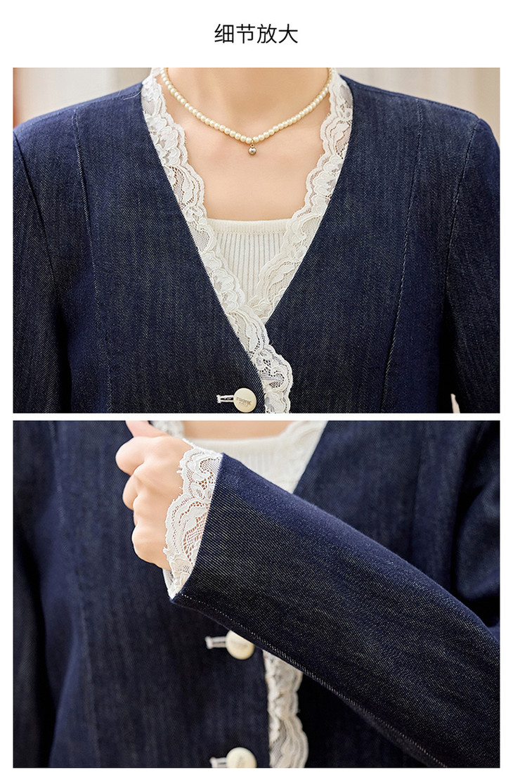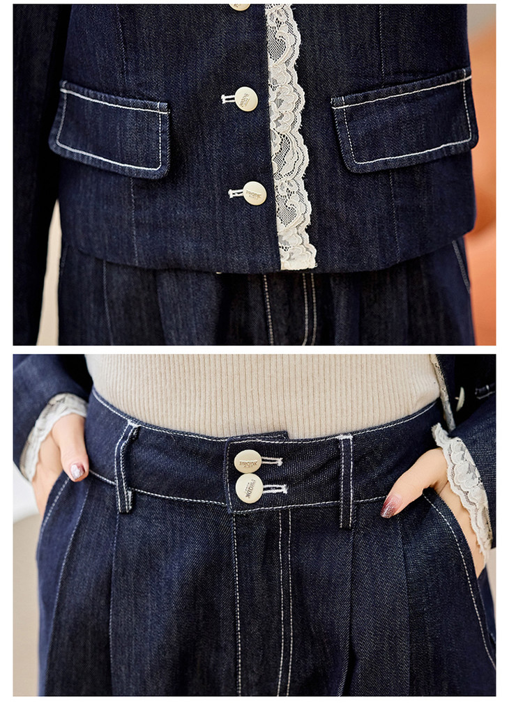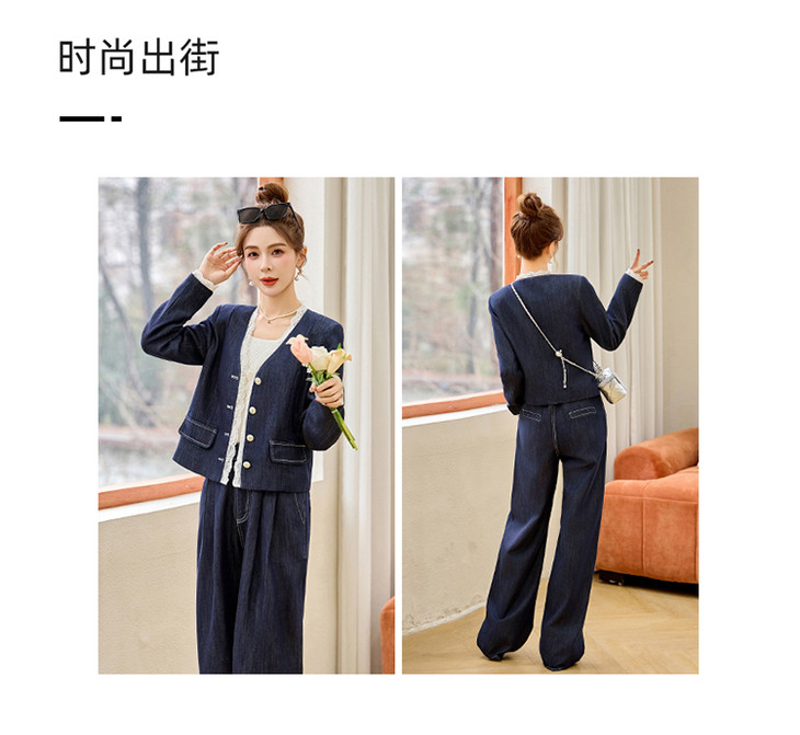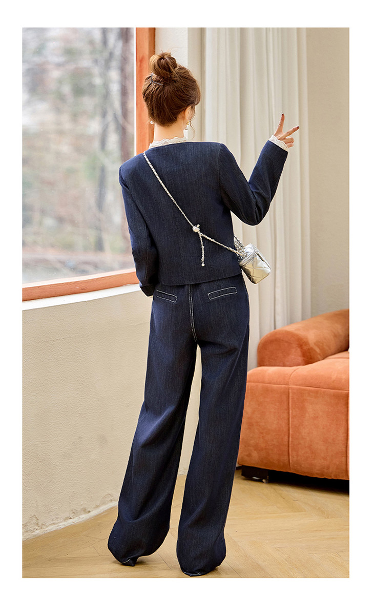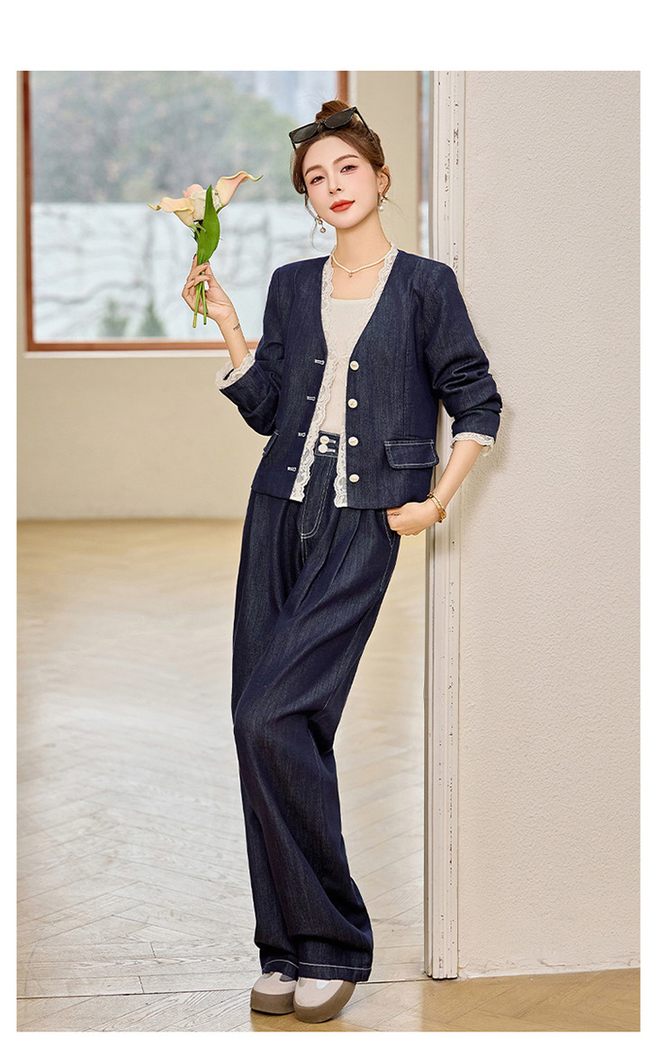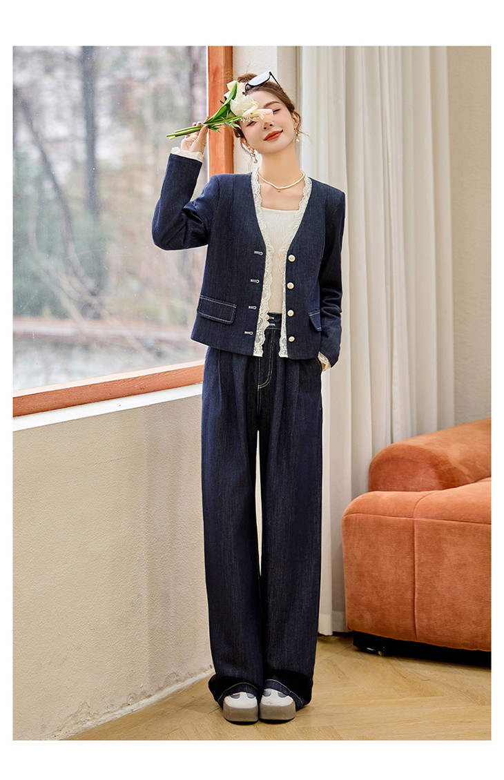 小香风时尚V领蕾丝边牛仔套装,显瘦洋气阔腿裤两件套HR-YQH2650
