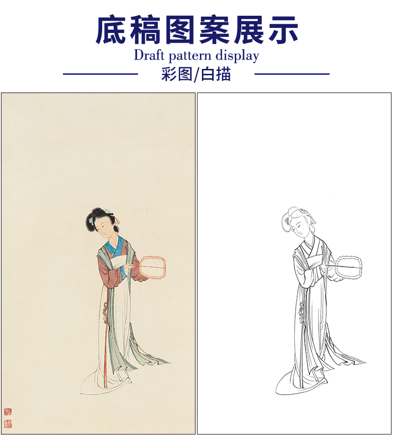 陈少梅工笔画人物白描底稿《执扇仕女》临摹勾线高清打印稿SM02