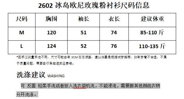 品牌:COCIC 品名:冰岛欧尼玫瑰粉衬衫 面料:棉95%、氨纶5% 颜色:粉色 尺码:M(85-110)斤、L(110-135)斤 |