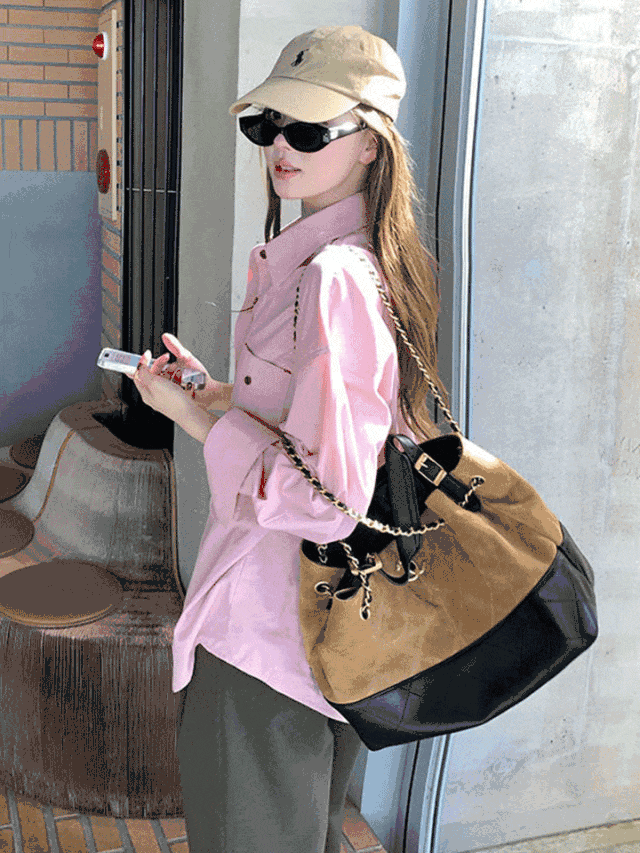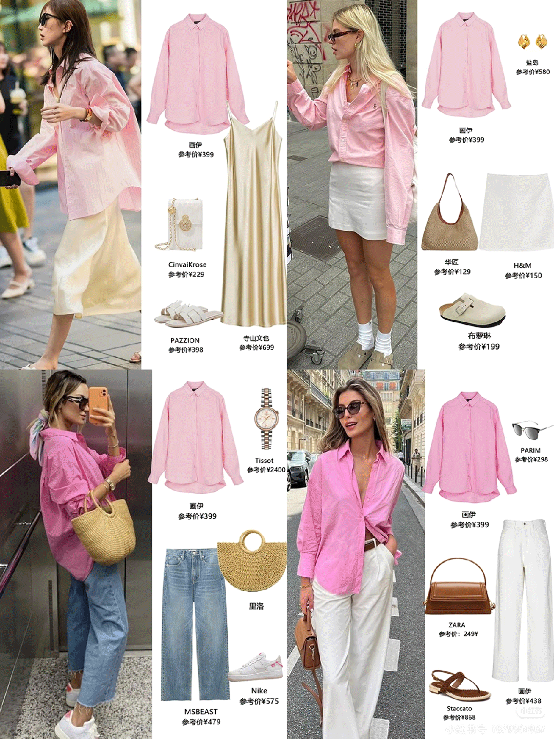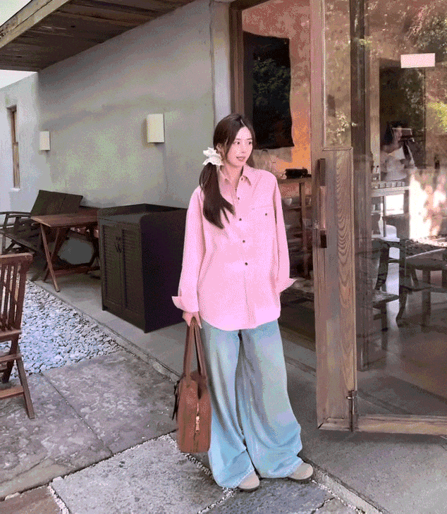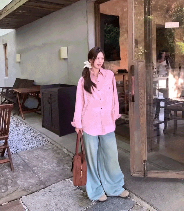 粉色衬衫,内搭白色吊带,搭配阔腿裤,真的是清新无敌了。