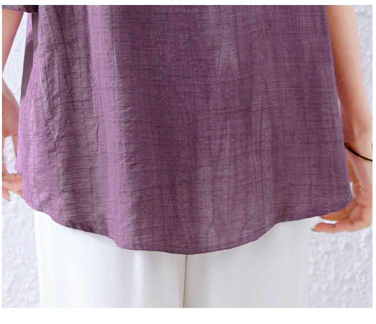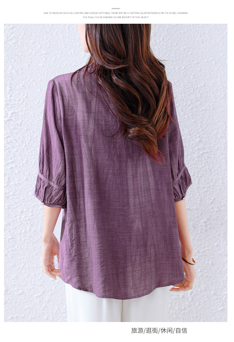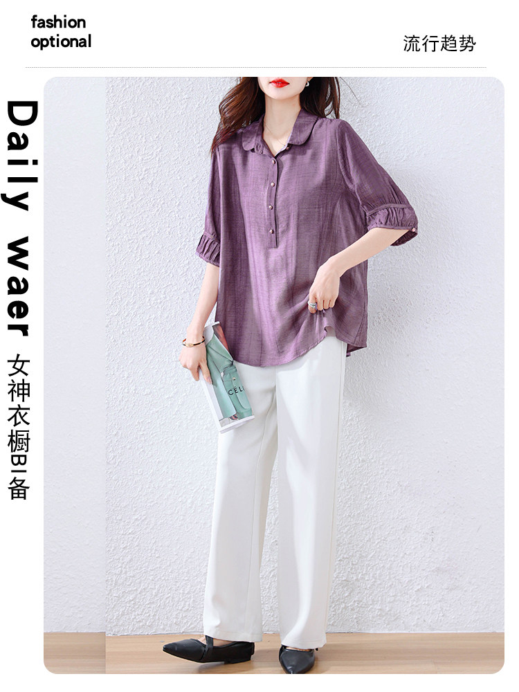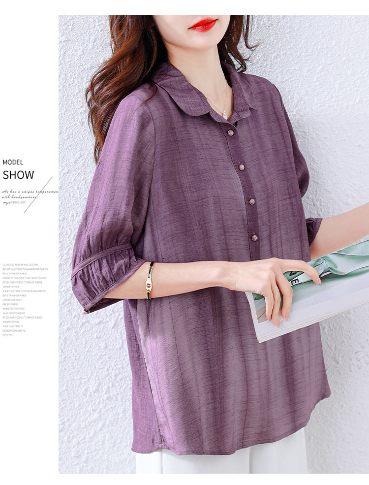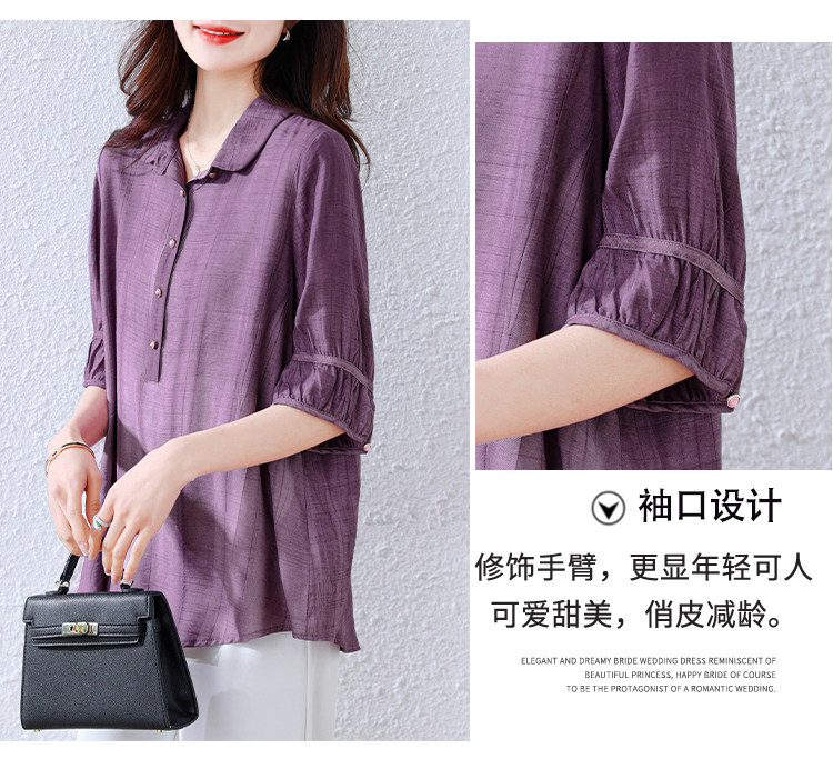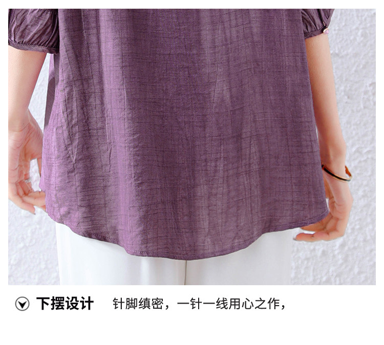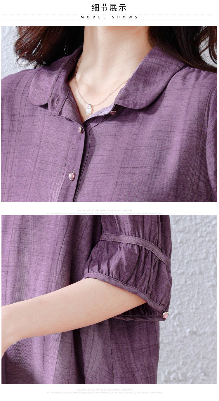 紫色苎麻衬衫女短袖衬衣春夏新款妈妈亚麻小衫宽松遮肚子棉麻上衣