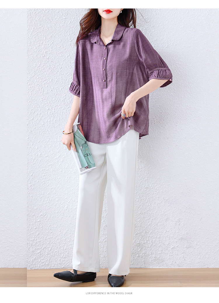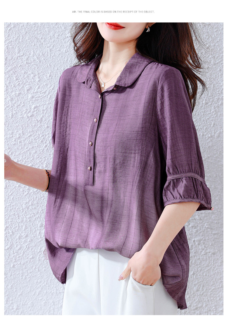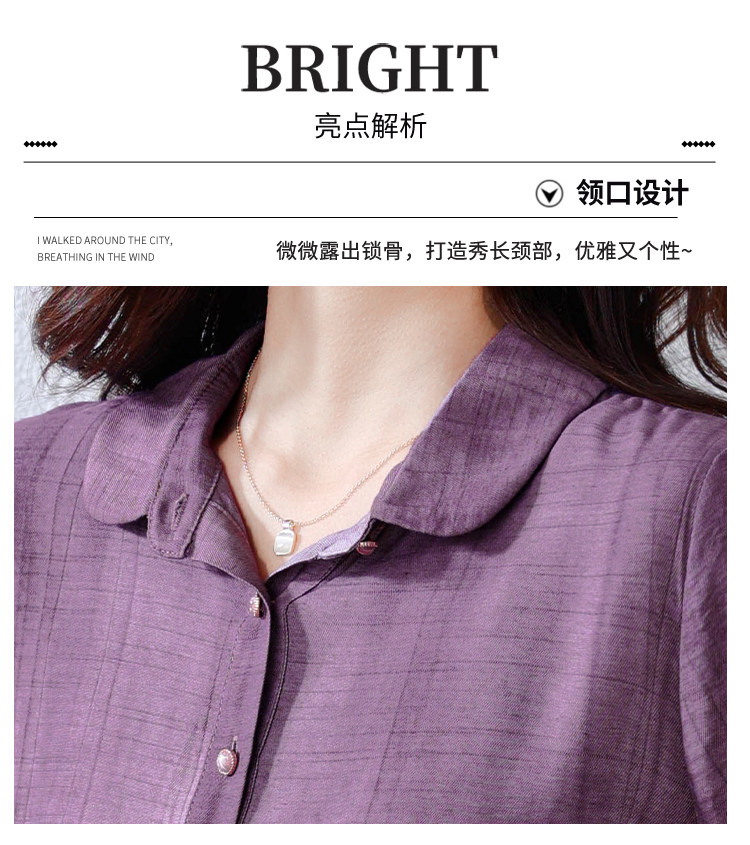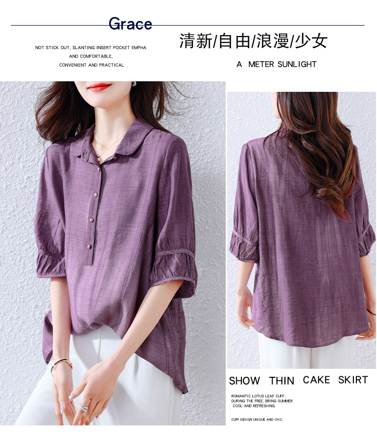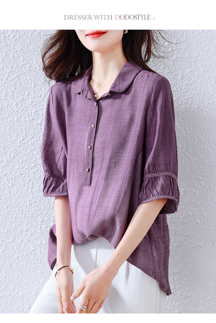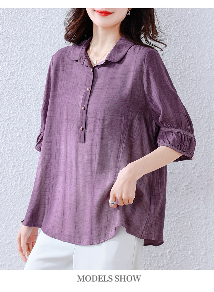 紫色苎麻衬衫女短袖衬衣春夏新款妈妈亚麻小衫宽松遮肚子棉麻上衣