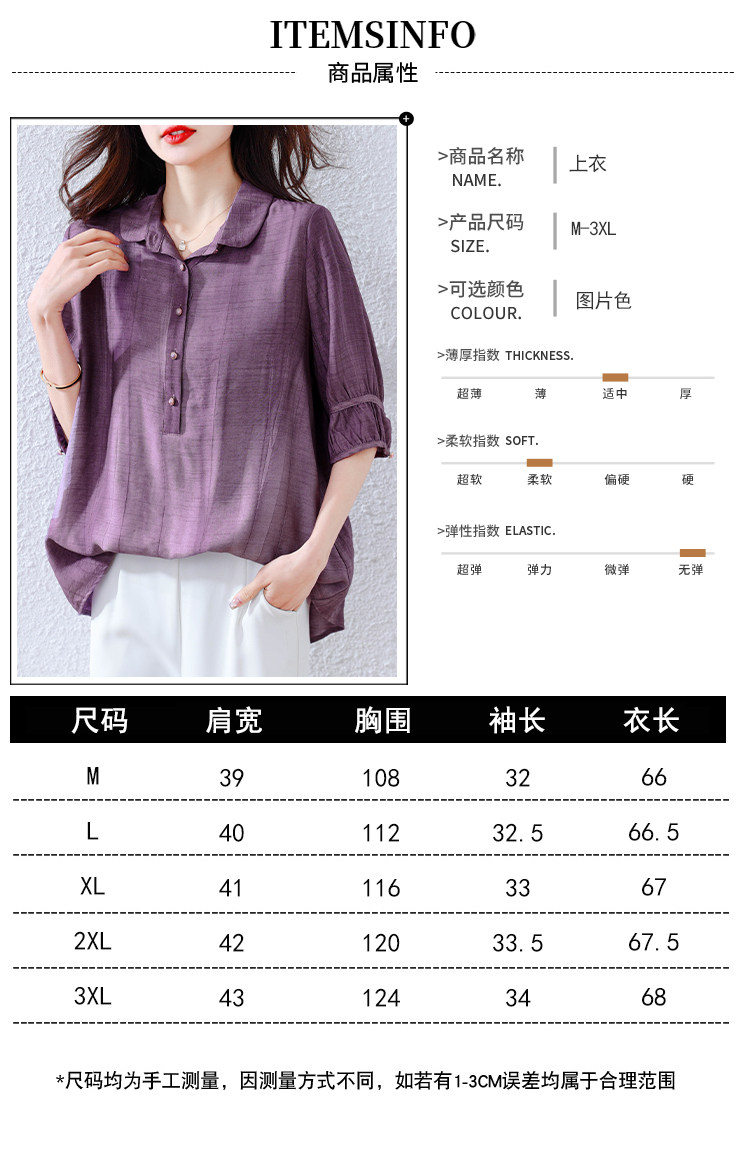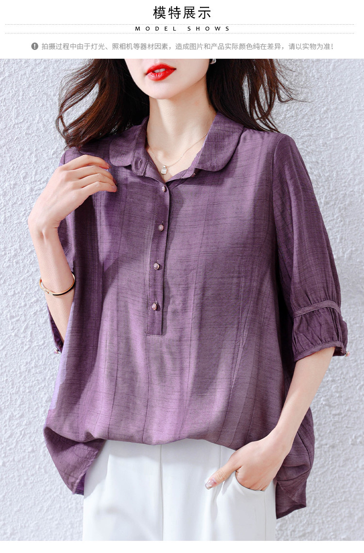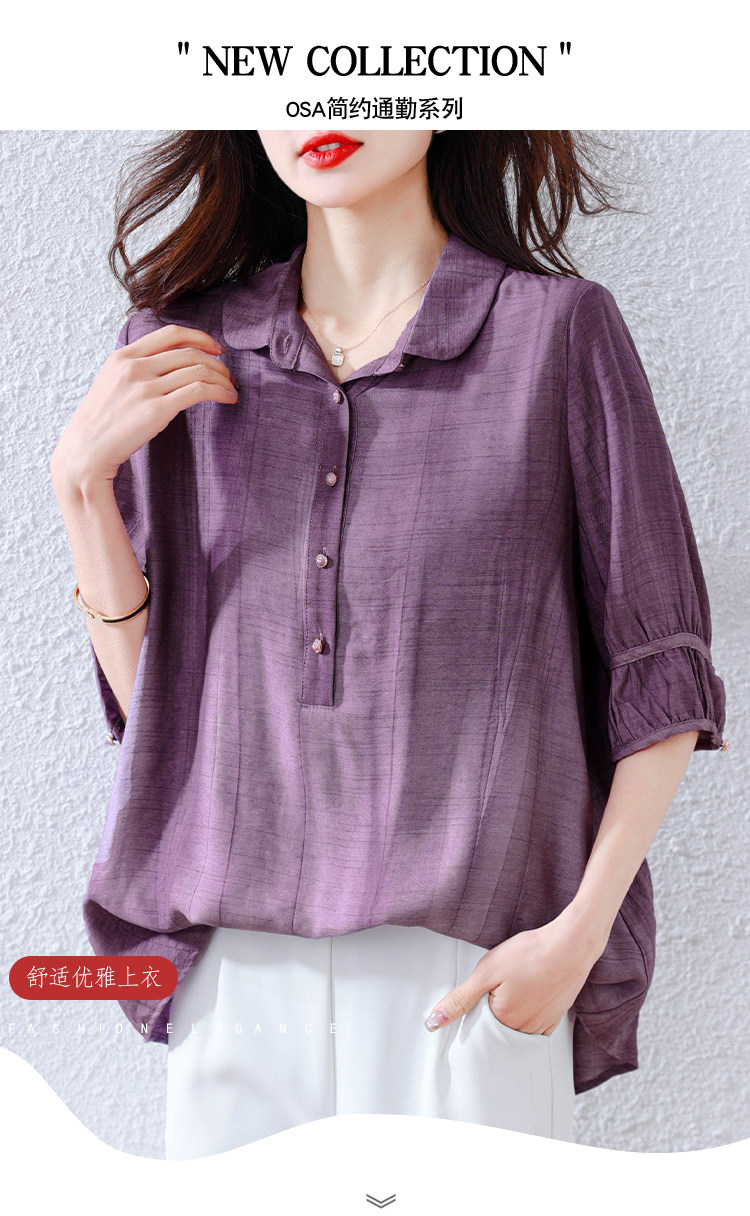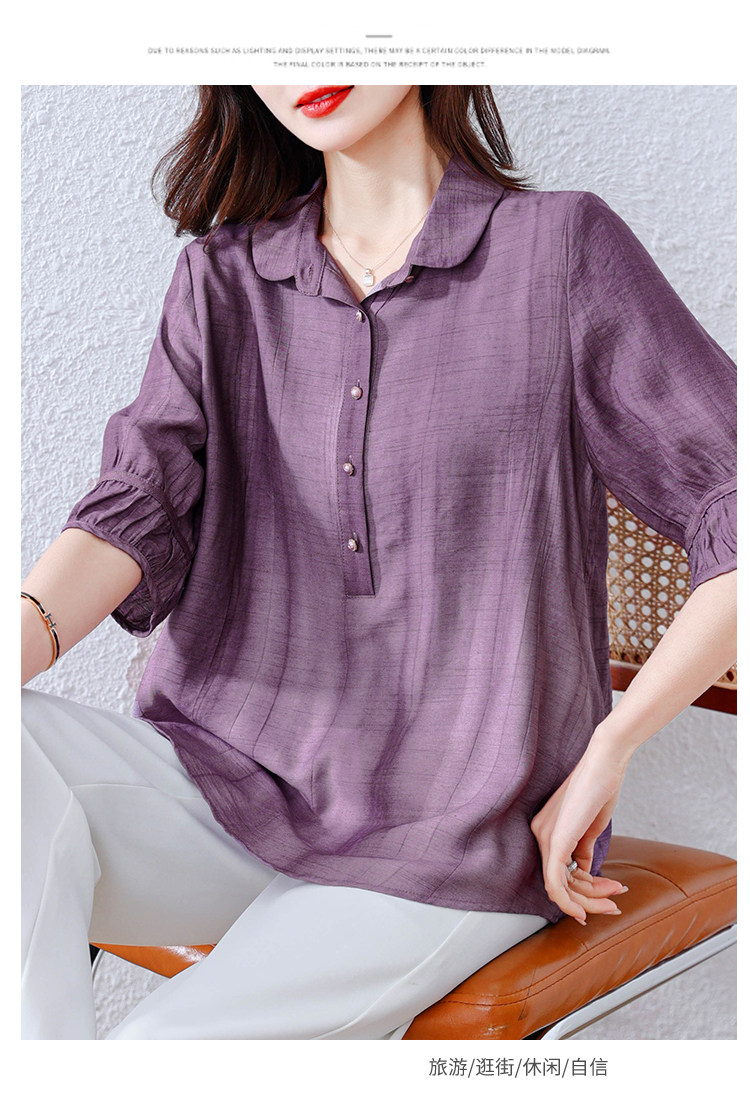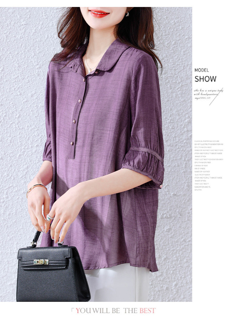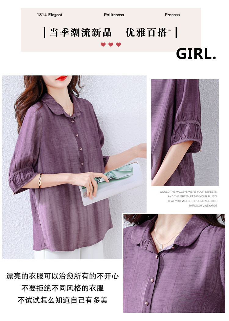 紫色苎麻衬衫女短袖衬衣春夏新款妈妈亚麻小衫宽松遮肚子棉麻上衣