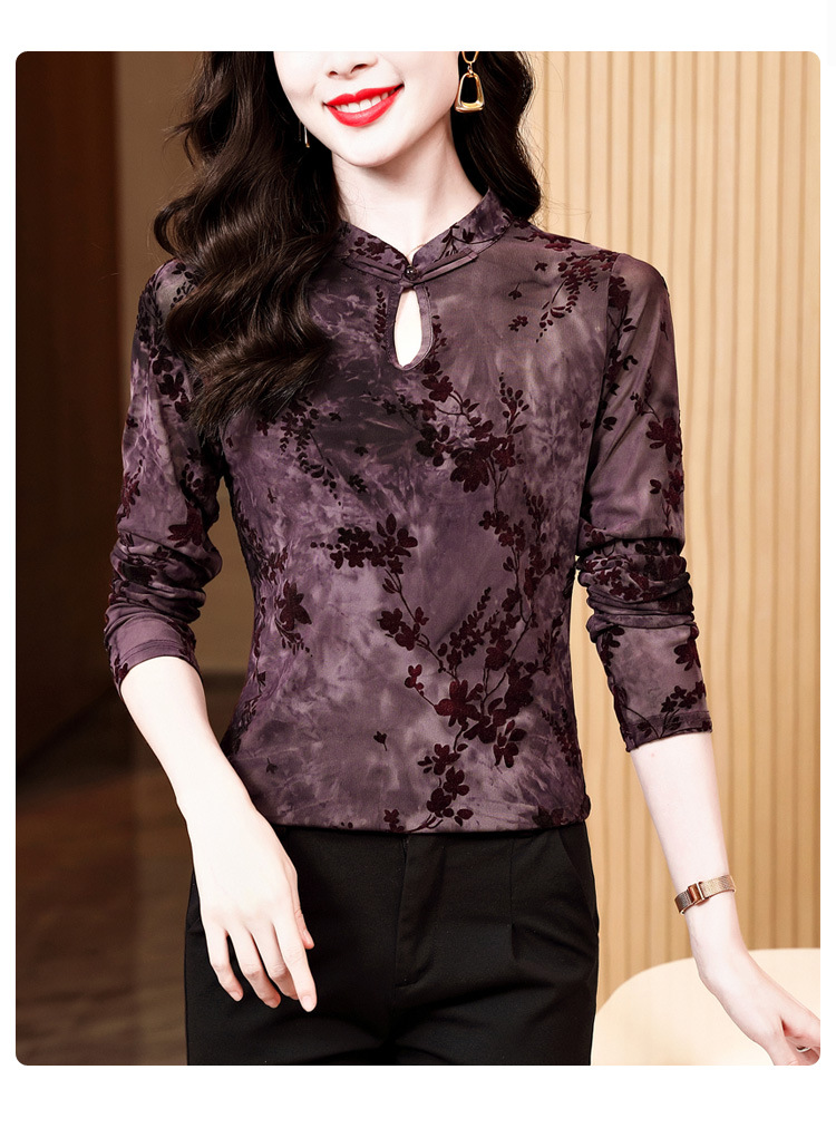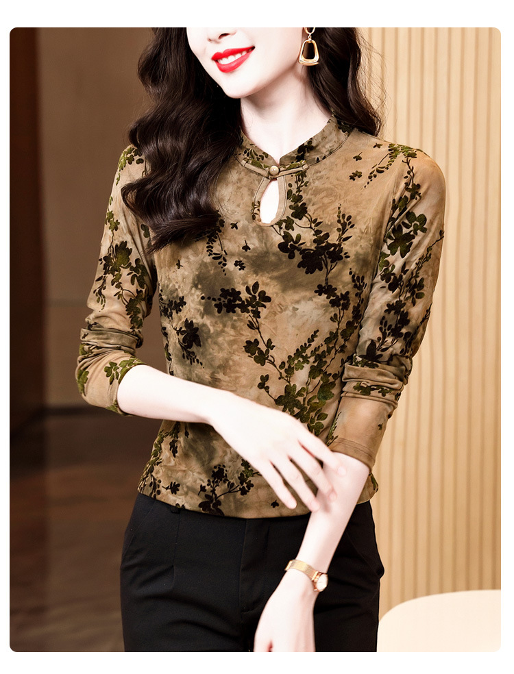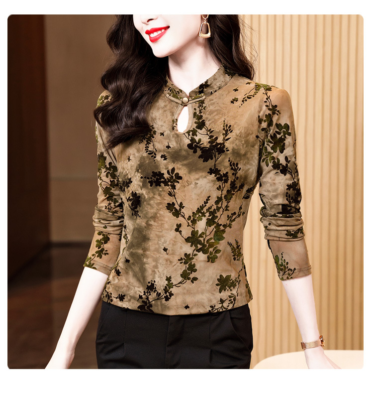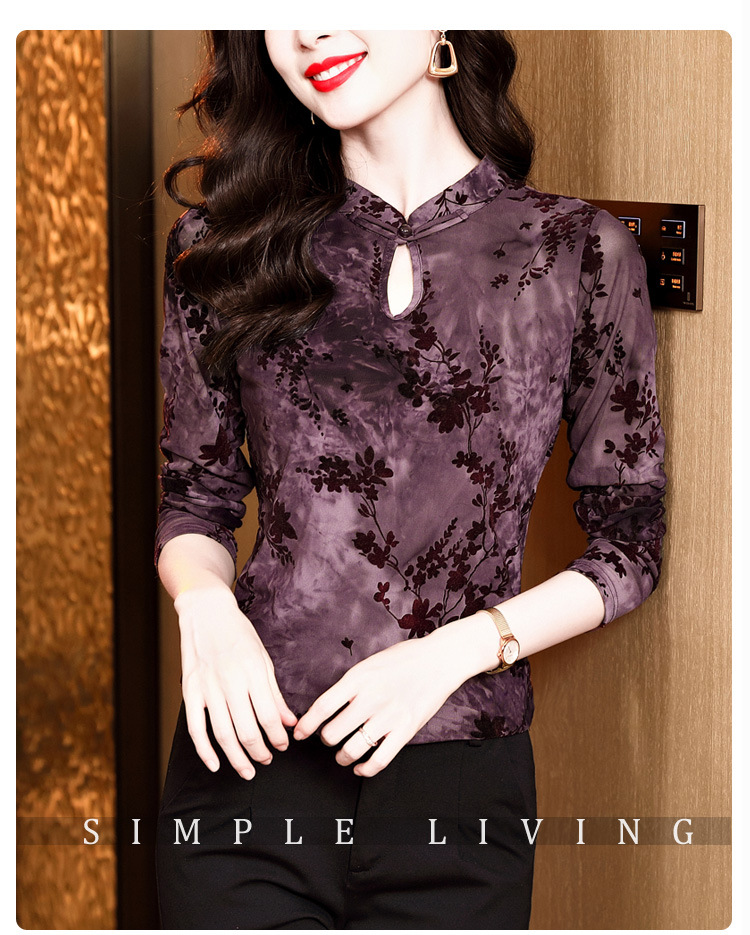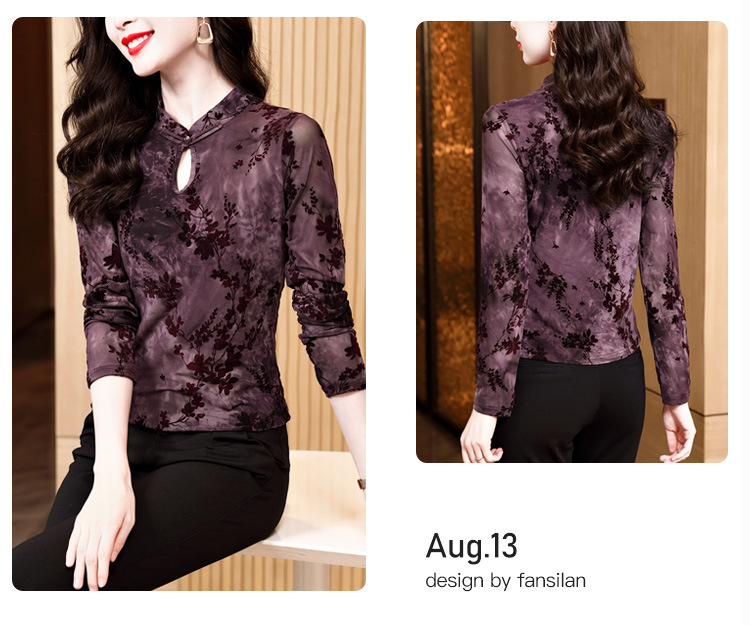 复古气质立领修身显瘦,盘扣植绒长袖网纱打底小衫KQL- E37M2830