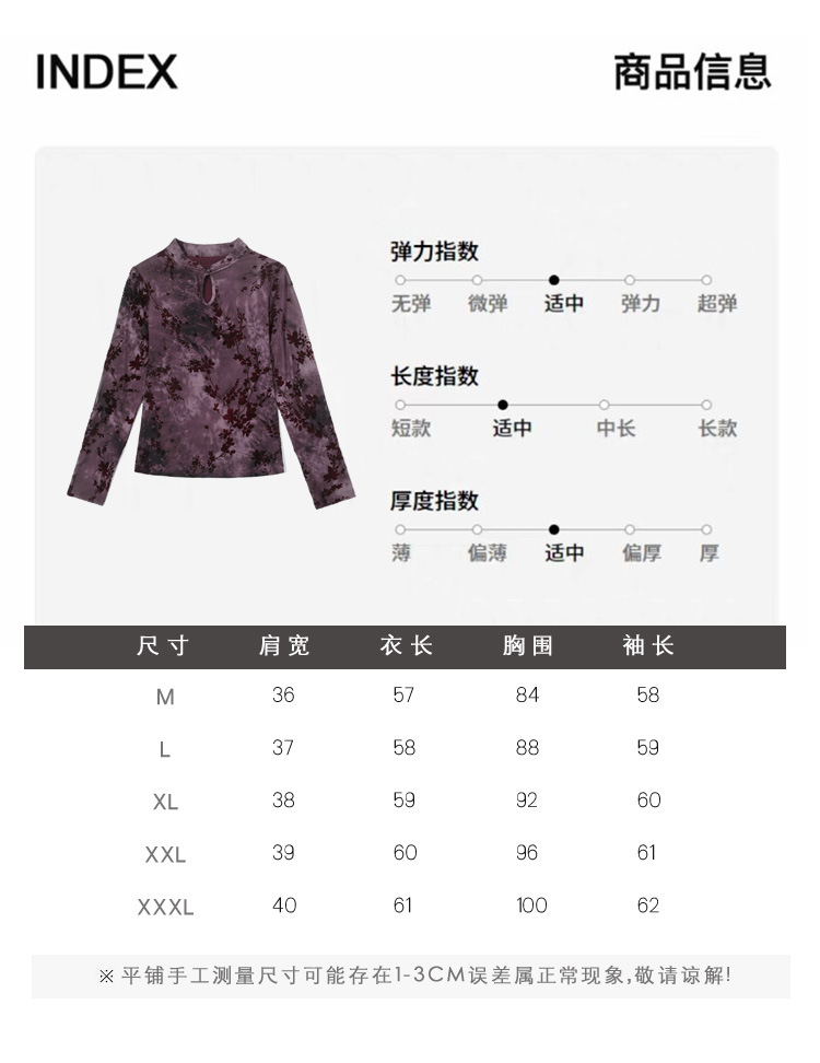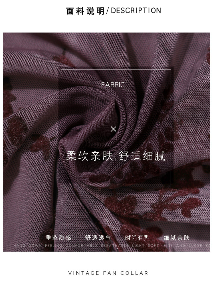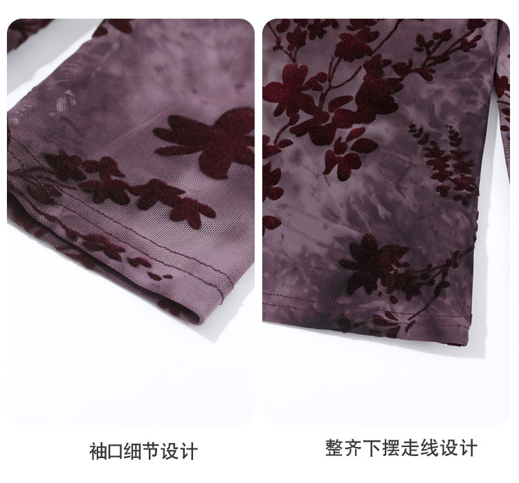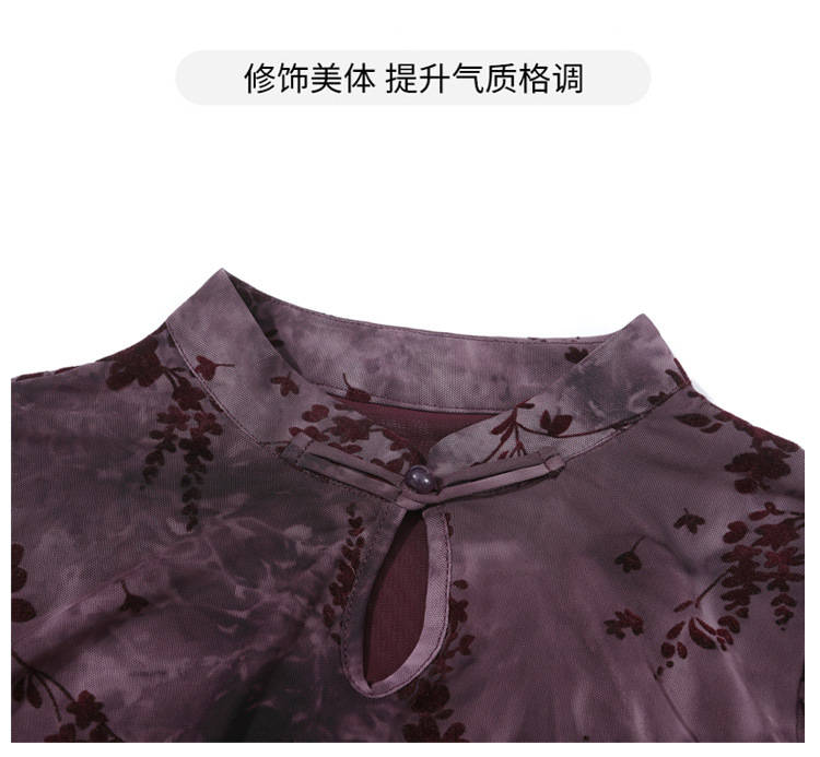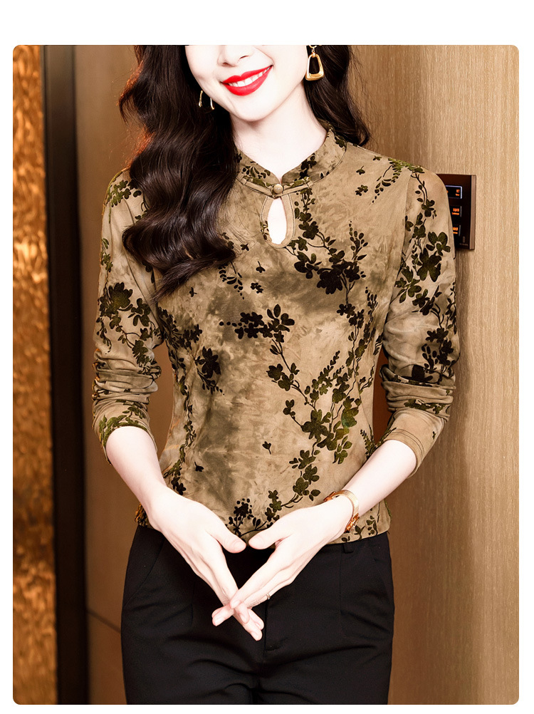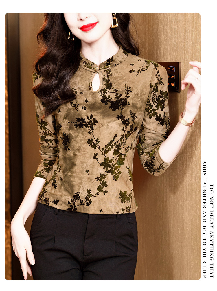 复古气质立领修身显瘦,盘扣植绒长袖网纱打底小衫KQL- E37M2830